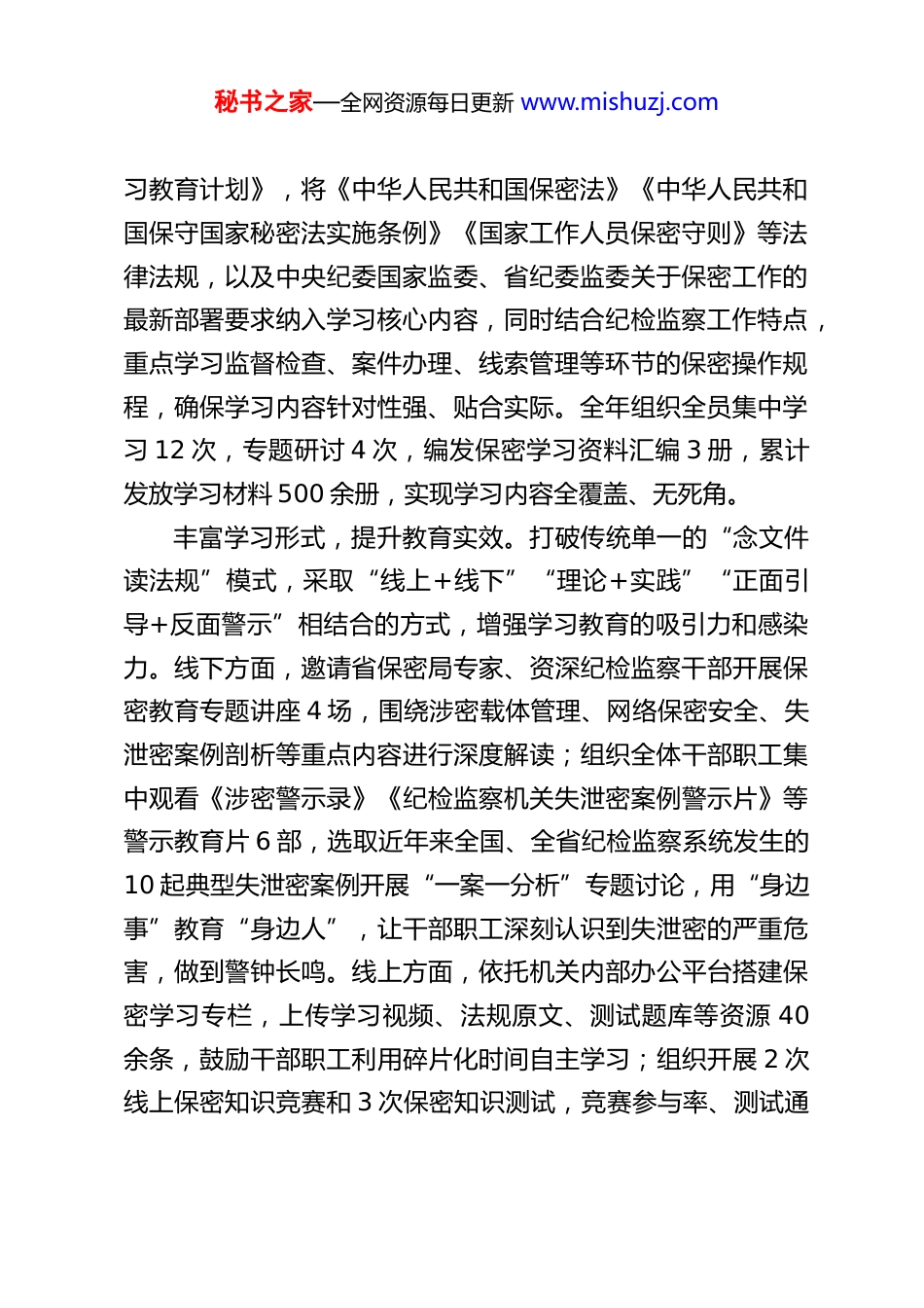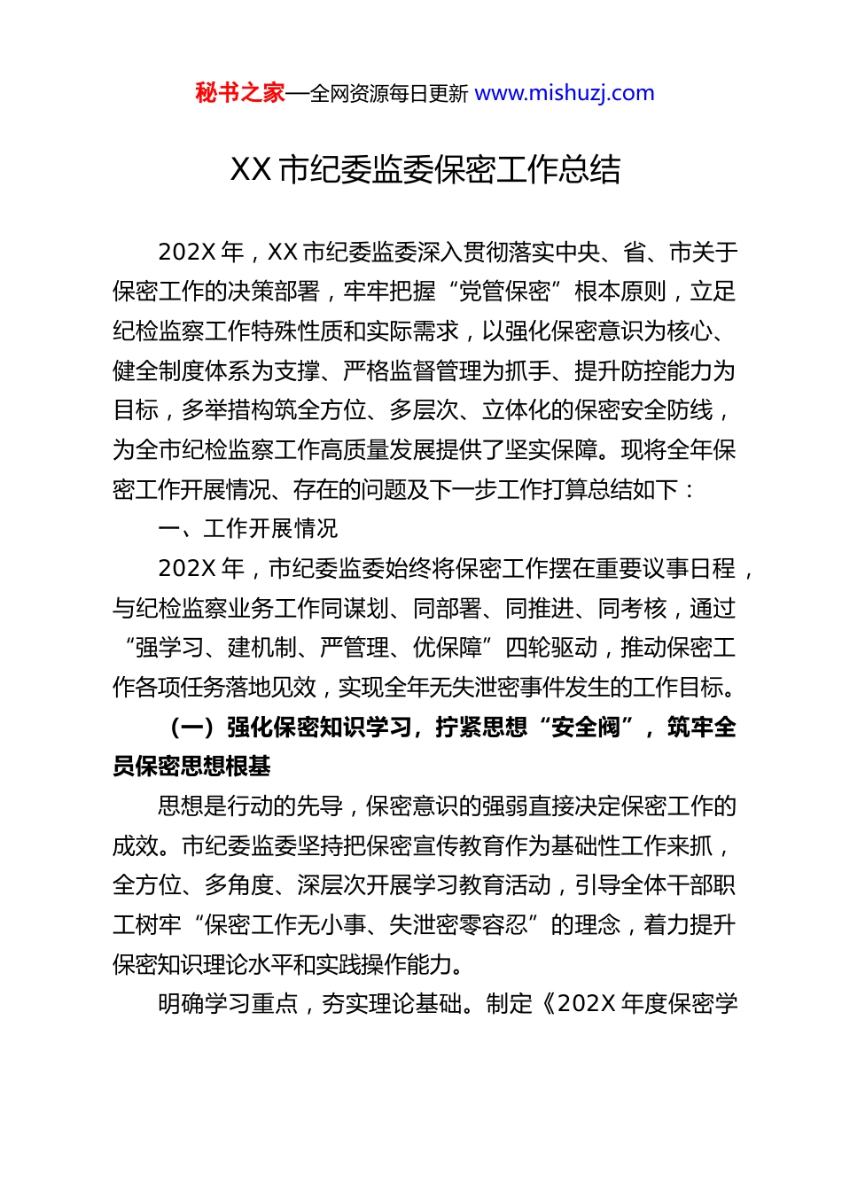 秘书之家—全网资源每日更新 www.mishuzj.comXX 市纪委监委保密工作总结202X 年,XX 市纪委监委深入贯彻落实中央、省、市关于保密工作的决策部署,牢牢把握“党管保密”根本原则,立足纪检监察工作特殊性质和实际需求,以强化保密意识为核心、健全制度体系为支撑、严格监督管理为抓手、提升防控能力为目标,多举措构筑全方位、多层次、立体化的保密安全防线,为全市纪检监察工作高质量发展提供了坚实保障。现将全年保密工作开展情况、存在的问题及下一步工作打算总结如下:一、工作开展情况202X 年,市纪委监委始终将保密工作摆在重要议事日程,与纪检监察业务工作同谋划、同部署、同推进、同考核,通过“强学习、建机制、严管理、优保障”四轮驱动,推动保密工作各项任务落地见效,实现全年无失泄密事件发生的工作目标。(一)强化保密知识学习,拧紧思想“安全阀”,筑牢全员保密思想根基思想是行动的先导,保密意识的强弱直接决定保密工作的成效。市纪委监委坚持把保密宣传教育作为基础性工作来抓,全方位、多角度、深层次开展学习教育活动,引导全体干部职工树牢“保密工作无小事、失泄密零容忍”的理念,着力提升保密知识理论水平和实践操作能力。明确学习重点,夯实理论基础。制定《202X 年度保密学秘书之家—全网资源每日更新 www.mishuzj.com习教育计划》,将《中华人民共和国保密法》《中华人民共和国保守国家秘密法实施条例》《国家工作人员保密守则》等法律法规,以及中央纪委国家监委、省纪委监委关于保密工作的最新部署要求纳入学习核心内容,同时结合纪检监察工作特点,重点学习监督检查、案件办理、线索管理等环节的保密操作规程,确保学习内容针对性强、贴合实际。全年组织全员集中学习 12 次,专题研讨 4 次,编发保密学习资料汇编 3 册,累计发放学习材料 500 余册,实现学习内容全覆盖、无死角。丰富学习形式,提升教育实效。打破传统单一的“念文件读法规”模式,采取“线上+线下”“理论+实践”“正面引导+反面警示”相结合的方式,增强学习教育的吸引力和感染力。线下方面,邀请省保密局专家、资深纪检监察干部开展保密教育专题讲座 4 场,围绕涉密载体管理、网络保密安全、失泄密案例剖析等重点内容进行深度解读;组织全体干部职工集中观看《涉密警示录》《纪检监察机关失泄密案例警示片》等警示教育片 6 部,选取近年来全国、全省纪检监察系统发生的10 起典型失泄密案例开展“一案一分析”专题讨论,用“身边事”教育“身边人”,让干部职工深刻认识到失泄密的严重危害,做到警钟长鸣。线上方面,依托机关内部办公平台搭建保密学习专栏,上传学习视频、法规原文、测试题库等资源 40余条,鼓励干部职工利用碎片化时间自主学习;组织开展 2 次线上保密知识竞赛和 3 次保密知识测试,竞赛参与率、测试通秘书之家—全网资源每日更新 www.mishuzj.com过率均达 100%,其中测试平均分达 96.8 分,优秀率(90 分以上)占比 100%,有效检验了学习成效。压实学习责任,实现全员覆盖。建立“主要领导带头学、分管领导督促学、部门负责人组织学、干部职工自觉学”的四级学习责任体系,将保密学习教育纳入干部职工教育培训总体规划和年度考核内容。新入职干部职工上岗前必须参加为期 3天的保密专题培训,培训合格并签订《保密承诺书》后方可上岗;对在职干部职工实行“年度轮训”制度,全年完成 156 名干部职工(含派驻机构、下属单位人员)的保密轮训,实现培训全覆盖。同时,针对涉密人员、办案人员、文书档案管理人员等重点人群,开展专项强化培训 3 次,进一步提升重点岗位人员的保密专业素养。(二)健全分类管理机制,修筑风险“隔离带”,提升全流程防控能力立足纪检监察工作涉密环节多、涉密载体杂、保密要求高的实际,市纪委监委聚焦信息系统、涉密载体、重点岗位等关键领域,建立健全分类管理、精准防控的工作机制,从源头上防范化解失泄密风险。严格信息系统与设备保密管理。制定《市纪委监委信息系统和信息设备保密管理办法》,明确内外网分类管理标准,严格落实“涉密计算机不上网、上网计算机不涉密”的铁律。对机关...