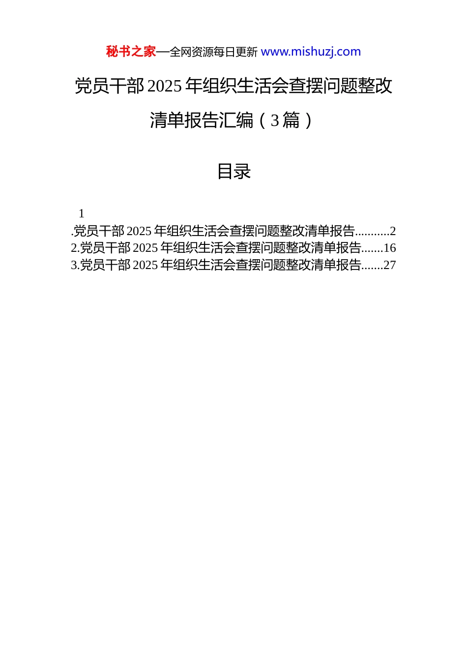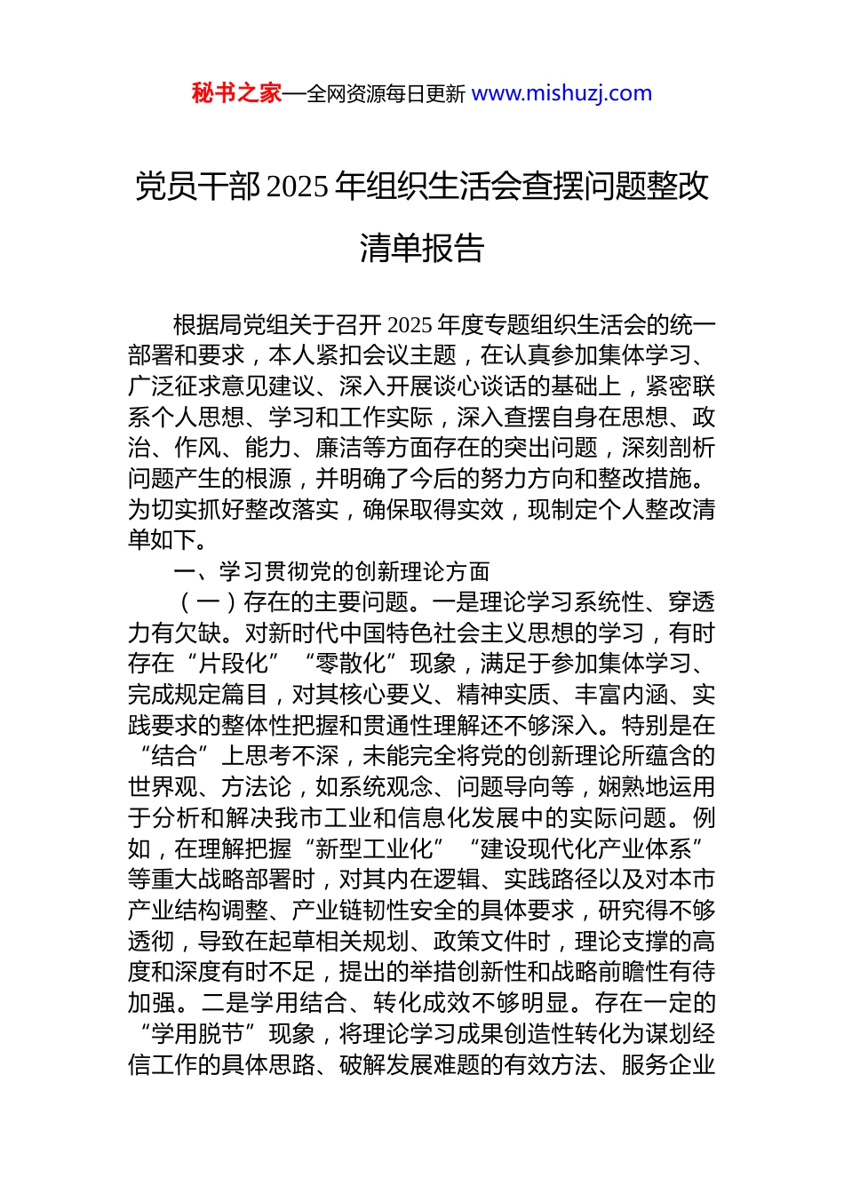 秘书之家—全网资源每日更新 www.mishuzj.com党员干部 2025 年组织生活会查摆问题整改清单报告汇编(3 篇)目录1.党员干部 2025 年组织生活会查摆问题整改清单报告...........22.党员干部 2025 年组织生活会查摆问题整改清单报告.......163.党员干部 2025 年组织生活会查摆问题整改清单报告.......27秘书之家—全网资源每日更新 www.mishuzj.com党员干部 2025 年组织生活会查摆问题整改清单报告根据局党组关于召开 2025 年度专题组织生活会的统一部署和要求,本人紧扣会议主题,在认真参加集体学习、广泛征求意见建议、深入开展谈心谈话的基础上,紧密联系个人思想、学习和工作实际,深入查摆自身在思想、政治、作风、能力、廉洁等方面存在的突出问题,深刻剖析问题产生的根源,并明确了今后的努力方向和整改措施。为切实抓好整改落实,确保取得实效,现制定个人整改清单如下。一、学习贯彻党的创新理论方面(一)存在的主要问题。一是理论学习系统性、穿透力有欠缺。对新时代中国特色社会主义思想的学习,有时存在“片段化”“零散化”现象,满足于参加集体学习、完成规定篇目,对其核心要义、精神实质、丰富内涵、实践要求的整体性把握和贯通性理解还不够深入。特别是在“结合”上思考不深,未能完全将党的创新理论所蕴含的世界观、方法论,如系统观念、问题导向等,娴熟地运用于分析和解决我市工业和信息化发展中的实际问题。例如,在理解把握“新型工业化”“建设现代化产业体系”等重大战略部署时,对其内在逻辑、实践路径以及对本市产业结构调整、产业链韧性安全的具体要求,研究得不够透彻,导致在起草相关规划、政策文件时,理论支撑的高度和深度有时不足,提出的举措创新性和战略前瞻性有待加强。二是学用结合、转化成效不够明显。存在一定的“学用脱节”现象,将理论学习成果创造性转化为谋划经信工作的具体思路、破解发展难题的有效方法、服务企业秘书之家—全网资源每日更新 www.mishuzj.com群众的实际能力尚有差距。面对当前复杂严峻的经济形势和产业变革挑战,如何运用新发展理念指导我市传统产业转型升级、新兴产业培育壮大、未来产业前瞻布局,思考谋划的主动性、系统性不足。例如,在分析研判工业经济运行态势、起草相关报告时,有时较多依赖统计数据和部门报送材料,主动深入企业一线、运用党的创新理论中关于发展新质生产力、推动高质量发展的论述进行独立分析、提出针对性政策建议的能力有待提升。对于如何利用工业互联网、大数据、人工智能等数字化手段提升产业治理效能、优化企业服务流程等新课题,从党的科学理论中寻找答案、探索路径的意识和能力还不强。三是学习自觉性、持续性有待提升。在理论学习上“被动接受”多于“主动汲取”,组织安排的学习能够认真参加,但个人自学的计划性、系统性不强,存在“挤时间学”而非“专门时间学”的情况。对“学习强国”等平台的学习,有时侧重于积分排名,对重要文章、权威解读的深读细研、消化吸收不够。理论学习的韧劲和“钻”劲不足,缺乏“打破砂锅问到底”的精神,对一些重大理论问题的理解停留在表面,导致理论武装不够扎实,运用党的创新理论改造主观世界、指导推动我市制造业高质量发展实践的效果未能完全显现。(二)整改措施。一是强化系统学习,筑牢思想根基。制定详细的个人年度理论学习计划,明确学习重点、时间安排和预期目标。坚持读原著、学原文、悟原理,深入研读《习近平著作选读》第一卷、第二卷等经典著作,及时跟进学习总书记关于新型工业化、制造强国、网络强国、数字经济发展等重要论述和最新重要讲话指示批示精神,特别是关于发展新质生产力、推动高质量发展的重要要求。年内至少精读 2 本马克思主义理论及与经信业务紧密相关的理论书籍,撰写不少于 4 篇有深度、联系实际的学习心得体会,着力在深化、内化、转化上下功夫,不断提升秘书之家—全网资源每日更新 www.mishuzj.com政治判断力、政治领悟力、政治执行力。二是深化研讨实践,促进学用相长。积极参加局党组理论学习中心组学习(扩大)会、支部“三会一课”、专题读书班等集体学习,主动围绕“以科技创新引领...