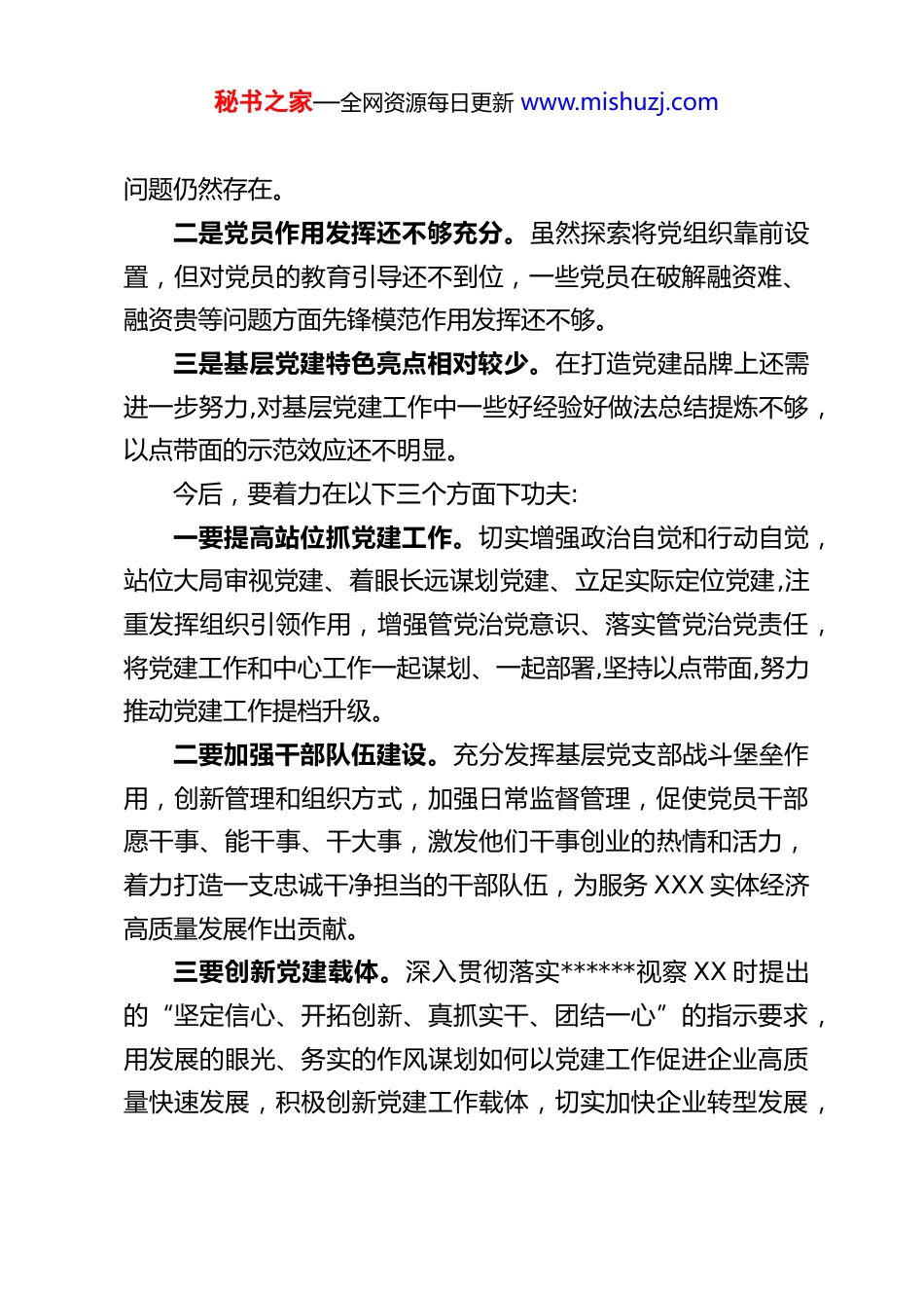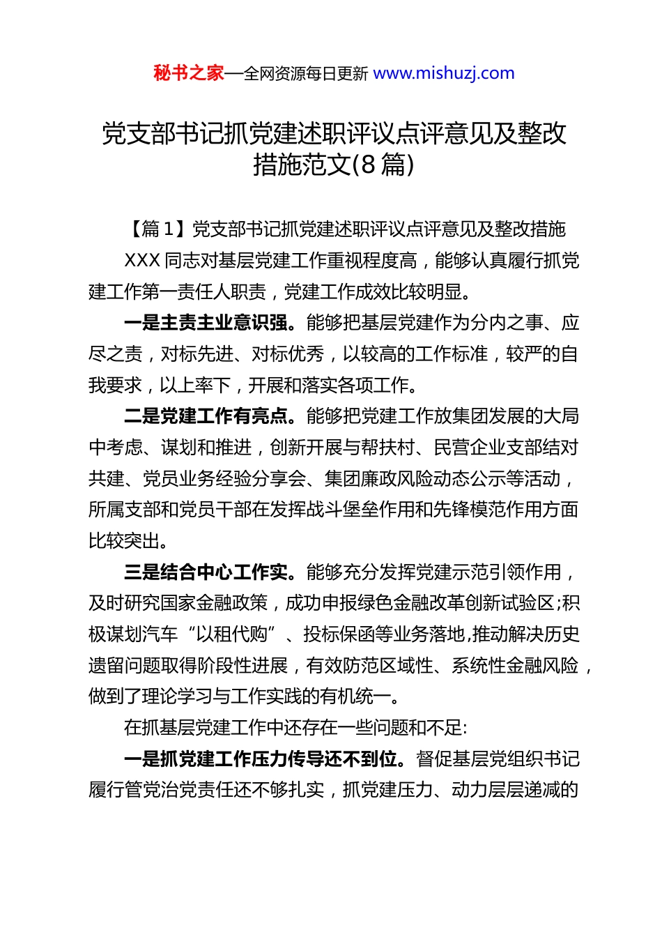 秘书之家—全网资源每日更新 www.mishuzj.com党支部书记抓党建述职评议点评意见及整改措施范文(8 篇)【篇 1】党支部书记抓党建述职评议点评意见及整改措施XXX 同志对基层党建工作重视程度高,能够认真履行抓党建工作第一责任人职责,党建工作成效比较明显。一是主责主业意识强。能够把基层党建作为分内之事、应尽之责,对标先进、对标优秀,以较高的工作标准,较严的自我要求,以上率下,开展和落实各项工作。二是党建工作有亮点。能够把党建工作放集团发展的大局中考虑、谋划和推进,创新开展与帮扶村、民营企业支部结对共建、党员业务经验分享会、集团廉政风险动态公示等活动,所属支部和党员干部在发挥战斗堡垒作用和先锋模范作用方面比较突出。三是结合中心工作实。能够充分发挥党建示范引领作用,及时研究国家金融政策,成功申报绿色金融改革创新试验区;积极谋划汽车“以租代购”、投标保函等业务落地,推动解决历史遗留问题取得阶段性进展,有效防范区域性、系统性金融风险,做到了理论学习与工作实践的有机统一。在抓基层党建工作中还存在一些问题和不足:一是抓党建工作压力传导还不到位。督促基层党组织书记履行管党治党责任还不够扎实,抓党建压力、动力层层递减的秘书之家—全网资源每日更新 www.mishuzj.com问题仍然存在。二是党员作用发挥还不够充分。虽然探索将党组织靠前设置,但对党员的教育引导还不到位,一些党员在破解融资难、融资贵等问题方面先锋模范作用发挥还不够。三是基层党建特色亮点相对较少。在打造党建品牌上还需进一步努力,对基层党建工作中一些好经验好做法总结提炼不够,以点带面的示范效应还不明显。今后,要着力在以下三个方面下功夫:一要提高站位抓党建工作。切实增强政治自觉和行动自觉,站位大局审视党建、着眼长远谋划党建、立足实际定位党建,注重发挥组织引领作用,增强管党治党意识、落实管党治党责任,将党建工作和中心工作一起谋划、一起部署,坚持以点带面,努力推动党建工作提档升级。二要加强干部队伍建设。充分发挥基层党支部战斗堡垒作用,创新管理和组织方式,加强日常监督管理,促使党员干部愿干事、能干事、干大事,激发他们干事创业的热情和活力,着力打造一支忠诚干净担当的干部队伍,为服务 XXX 实体经济高质量发展作出贡献。三要创新党建载体。深入贯彻落实******视察 XX 时提出的“坚定信心、开拓创新、真抓实干、团结一心”的指示要求,用发展的眼光、务实的作风谋划如何以党建工作促进企业高质量快速发展,积极创新党建工作载体,切实加快企业转型发展,秘书之家—全网资源每日更新 www.mishuzj.com努力做到党建与企业发展互促互进。【篇 2】党支部书记抓党建述职评议点评意见及整改措施一年来,本人主抓学校教学工作,协助校长抓全面工作。在上级教育部门的领导下,本人尽职尽责,以身作则带领全体教职工努力工作,基本完成今年的工作目标。下面对本人今年来的工作思路和做过的工作进行汇报。一、政治思想本人能担任学校党支部书记一职并分管教学和党建工作,是上级领导与老师对我的信任。为更好完成工作,我在政治思想上积极要求上进,始终与学校工作保持高度一致,并严格要求自己,坚持认真看书学习;关心国家大事,不断提高自身的政治理论素养。工作中,坚决履行科学发展观思想,全面贯彻执行党的教育方针,认真落实上级教育部门的各项方针、政策,积极利用学到的政治理论指导自己的实践,使自己在学习与工作中不断提高工作水平。二、工作思路及体会在分管的工作中,我一直严格要求自己。今年的工作,我对这项工作又有了更深的知识。1、做好校长的助手。一年来,我以强烈的事业心、责任心力抓教务处工作,使学校教育教学工作运作正常。忠诚于人民的教育事业,坚持原则,出以公心,配合校长开展工作,协同校长调配各科任课老师,对其他工作也提出一些合理的建议,秘书之家—全网资源每日更新 www.mishuzj.com配合校长建立正常教育教学秩序。2、认真做好党建工作。科学的制定了党支部工作计划,正常的开展了党务工作。切实组织和加强党员干部、全校教师的政治理论学习,建立完善了领导干部和教职工政治学习制度...