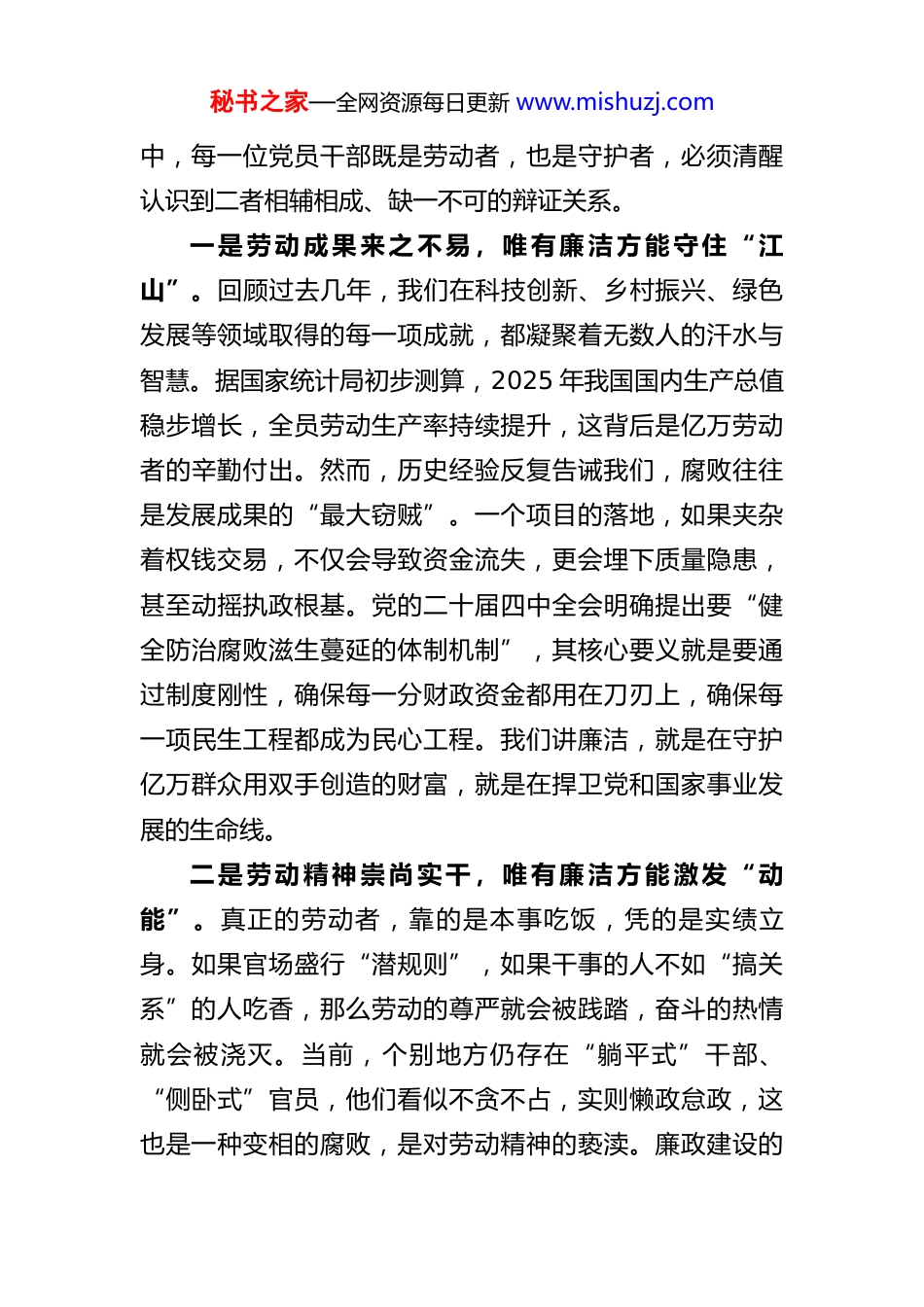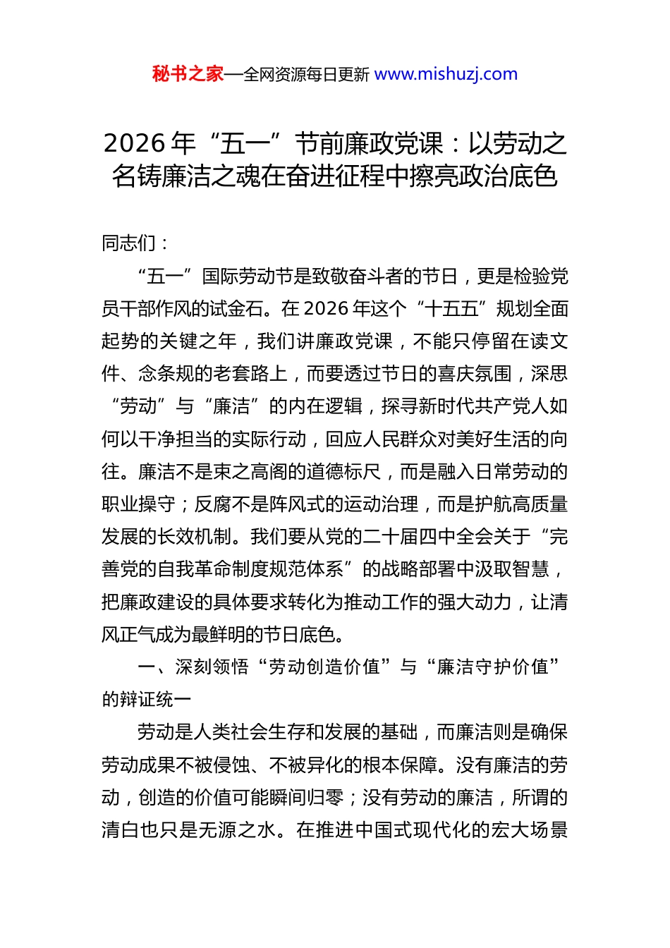 秘书之家—全网资源每日更新 www.mishuzj.com2026 年“五一”节前廉政党课:以劳动之名铸廉洁之魂在奋进征程中擦亮政治底色同志们:“五一”国际劳动节是致敬奋斗者的节日,更是检验党员干部作风的试金石。在 2026 年这个“十五五”规划全面起势的关键之年,我们讲廉政党课,不能只停留在读文件、念条规的老套路上,而要透过节日的喜庆氛围,深思“劳动”与“廉洁”的内在逻辑,探寻新时代共产党人如何以干净担当的实际行动,回应人民群众对美好生活的向往。廉洁不是束之高阁的道德标尺,而是融入日常劳动的职业操守;反腐不是阵风式的运动治理,而是护航高质量发展的长效机制。我们要从党的二十届四中全会关于“完善党的自我革命制度规范体系”的战略部署中汲取智慧,把廉政建设的具体要求转化为推动工作的强大动力,让清风正气成为最鲜明的节日底色。一、深刻领悟“劳动创造价值”与“廉洁守护价值”的辩证统一劳动是人类社会生存和发展的基础,而廉洁则是确保劳动成果不被侵蚀、不被异化的根本保障。没有廉洁的劳动,创造的价值可能瞬间归零;没有劳动的廉洁,所谓的清白也只是无源之水。在推进中国式现代化的宏大场景秘书之家—全网资源每日更新 www.mishuzj.com中,每一位党员干部既是劳动者,也是守护者,必须清醒认识到二者相辅相成、缺一不可的辩证关系。一是劳动成果来之不易,唯有廉洁方能守住“江山”。回顾过去几年,我们在科技创新、乡村振兴、绿色发展等领域取得的每一项成就,都凝聚着无数人的汗水与智慧。据国家统计局初步测算,2025 年我国国内生产总值稳步增长,全员劳动生产率持续提升,这背后是亿万劳动者的辛勤付出。然而,历史经验反复告诫我们,腐败往往是发展成果的“最大窃贼”。一个项目的落地,如果夹杂着权钱交易,不仅会导致资金流失,更会埋下质量隐患,甚至动摇执政根基。党的二十届四中全会明确提出要“健全防治腐败滋生蔓延的体制机制”,其核心要义就是要通过制度刚性,确保每一分财政资金都用在刀刃上,确保每一项民生工程都成为民心工程。我们讲廉洁,就是在守护亿万群众用双手创造的财富,就是在捍卫党和国家事业发展的生命线。二是劳动精神崇尚实干,唯有廉洁方能激发“动能”。真正的劳动者,靠的是本事吃饭,凭的是实绩立身。如果官场盛行“潜规则”,如果干事的人不如“搞关系”的人吃香,那么劳动的尊严就会被践踏,奋斗的热情就会被浇灭。当前,个别地方仍存在“躺平式”干部、“侧卧式”官员,他们看似不贪不占,实则懒政怠政,这也是一种变相的腐败,是对劳动精神的亵渎。廉政建设的秘书之家—全网资源每日更新 www.mishuzj.com深层意义,在于营造风清气正的政治生态,让能者上、优者奖、庸者下、劣者汰成为常态。只有铲除腐败土壤,打破利益固化的藩篱,才能让那些埋头苦干、勇挑重担的“老黄牛”有舞台、有奔头,才能最大限度激发全社会的创新活力和创造潜能。三是劳动目标指向人民,唯有廉洁方能赢得“人心”。我们党的初心和使命是为中国人民谋幸福、为中华民族谋复兴。劳动的最终目的,是为了让老百姓过上好日子。如果党员干部在劳动过程中谋取私利,搞利益输送,那就背离了初心使命,割裂了党群干群关系。群众看党员,不仅看你说得怎么样,更看你做得怎么样,看你手脚干不干净。在 2026 年这个承前启后的节点,面对复杂多变的国际形势和艰巨繁重的国内改革发展稳定任务,我们比以往任何时候都更需要依靠人民的力量。只有自身硬,说话才有人听,办事才有人跟。保持清正廉洁,就是最大的政治优势,就是最强的凝聚力,就是通往民心的最短路径。二、精准把握新时代廉政风险的新表现与新特征时代在变,腐败的形式也在隐形变异。随着数字化、智能化技术的广泛应用,以及经济社会结构的深刻调整,廉政风险呈现出隐蔽性强、穿透力大、关联度高等新特点。我们必须保持敏锐的政治嗅觉,透过现象看本质,精准识别那些披着“人情往来”“创新探索”外衣的违纪违秘书之家—全网资源每日更新 www.mishuzj.com法行为。一是“指尖上的腐败”更具迷惑性。当前,政务服务、项目审批、资金拨付等大量工作已迁移至线上平台。这本是便民利...