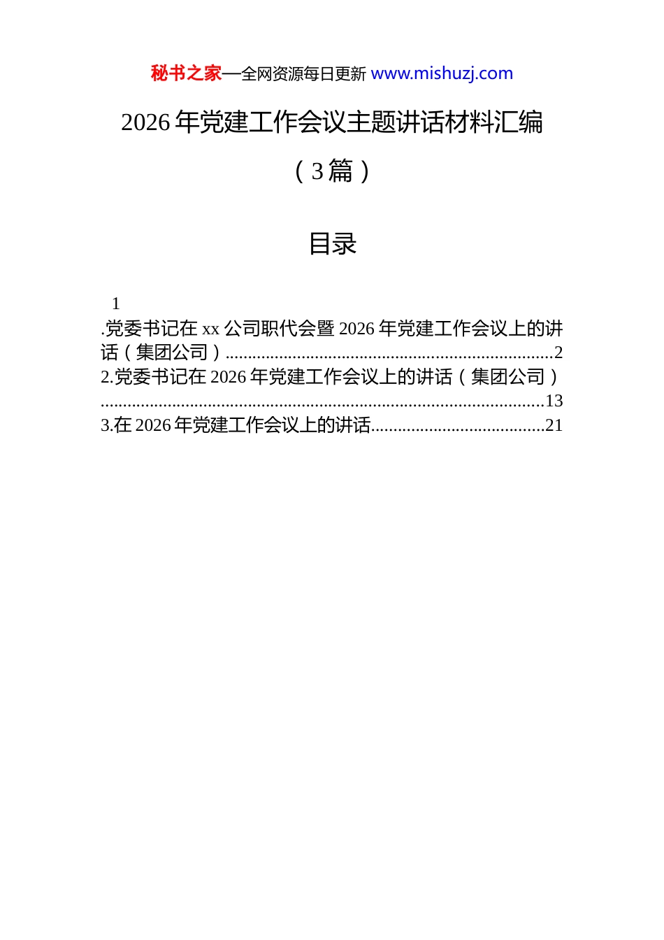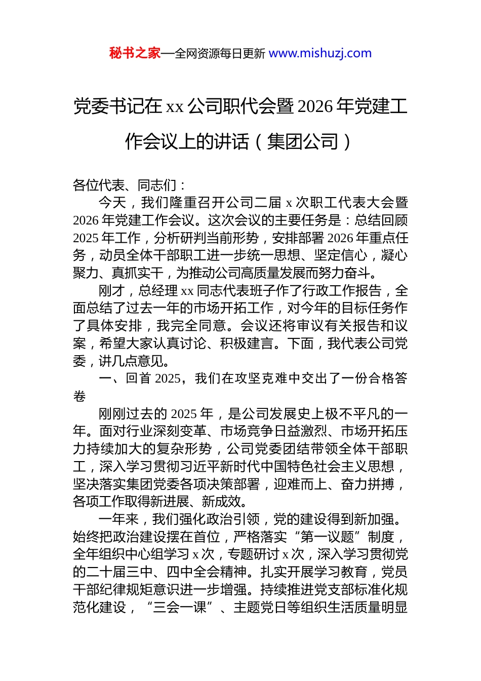 秘书之家—全网资源每日更新 www.mishuzj.com2026 年党建工作会议主题讲话材料汇编(3 篇)目录1.党委书记在 xx 公司职代会暨 2026 年党建工作会议上的讲话(集团公司).........................................................................22.党委书记在 2026 年党建工作会议上的讲话(集团公司)...................................................................................................133.在 2026 年党建工作会议上的讲话.......................................21秘书之家—全网资源每日更新 www.mishuzj.com党委书记在 xx 公司职代会暨 2026 年党建工作会议上的讲话(集团公司) 各位代表、同志们:今天,我们隆重召开公司二届 x 次职工代表大会暨2026 年党建工作会议。这次会议的主要任务是:总结回顾2025 年工作,分析研判当前形势,安排部署 2026 年重点任务,动员全体干部职工进一步统一思想、坚定信心,凝心聚力、真抓实干,为推动公司高质量发展而努力奋斗。刚才,总经理 xx 同志代表班子作了行政工作报告,全面总结了过去一年的市场开拓工作,对今年的目标任务作了具体安排,我完全同意。会议还将审议有关报告和议案,希望大家认真讨论、积极建言。下面,我代表公司党委,讲几点意见。一、回首 2025,我们在攻坚克难中交出了一份合格答卷刚刚过去的 2025 年,是公司发展史上极不平凡的一年。面对行业深刻变革、市场竞争日益激烈、市场开拓压力持续加大的复杂形势,公司党委团结带领全体干部职工,深入学习贯彻习近平新时代中国特色社会主义思想,坚决落实集团党委各项决策部署,迎难而上、奋力拼搏,各项工作取得新进展、新成效。一年来,我们强化政治引领,党的建设得到新加强。始终把政治建设摆在首位,严格落实“第一议题”制度,全年组织中心组学习 x 次,专题研讨 x 次,深入学习贯彻党的二十届三中、四中全会精神。扎实开展学习教育,党员干部纪律规矩意识进一步增强。持续推进党支部标准化规范化建设,“三会一课”、主题党日等组织生活质量明显秘书之家—全网资源每日更新 www.mishuzj.com提升。成功召开公司第一次党代会,选举产生新一届党委和纪委,为改革发展提供了坚强组织保证。一年来,我们聚焦市场开拓龙头,市场开拓实现新突破。坚持市场开拓工作“头等大事”地位不动摇,全年完成新签合同额 xx 亿元,完成集团下达指标的 xx%,同比增长 xx%。成功中标 xx、xx 等一批重点项目,在 xx 领域实现新突破。三大主力市场持续深耕,区域市场开拓成效显著。市场开拓质量稳步提升,合同转化率、中标率等关键指标持续向好。一年来,我们狠抓项目履约,品牌形象得到新提升。牢固树立“现场为王”理念,xx 个在建项目总体受控,xx个项目顺利竣工交付,xx 项目被评为“安全文明标准化工地”。项目管理水平不断提升,成本管控、质量安全、技术创新等工作取得新成效。业主满意度持续提高,企业品牌影响力进一步扩大。一年来,我们深化改革创新,发展活力得到新激发。认真落实集团改革深化提升行动各项部署,完成 xx 项改革任务。三项制度改革持续深化,干部能上能下、员工能进能出、收入能增能减的机制更加完善。科技创新成果丰硕,全年获专利 x 项,省部级工法 x 项。一年来,我们增进职工福祉,和谐局面得到新巩固。坚持以职工为中心的发展思想,职工收入稳步增长,福利待遇持续改善。深入开展“我为群众办实事”活动,累计为职工解决急难愁盼问题 xx 件。困难职工帮扶、节日慰问、文体活动等扎实开展,职工获得感、幸福感、安全感不断增强。这些成绩的取得,是集团党委正确领导的结果,是公司领导班子团结协作的结果,更是全体干部职工辛勤付出、奋力拼搏的结果。在此,我代表公司党委,向各位代表、向奋战在各条战线上的全体干部职工,表示衷心的感谢和崇高的敬意!秘书之家—全网资源每日更新 www.mishuzj.com在肯定成绩的同时,我们也要清醒看到存在的问题和不足:一是党建引领作用发挥还不够充分,党建与市场开拓融合还需深化;二是市场开拓结构有待优化,新兴领域突破不够;三是...