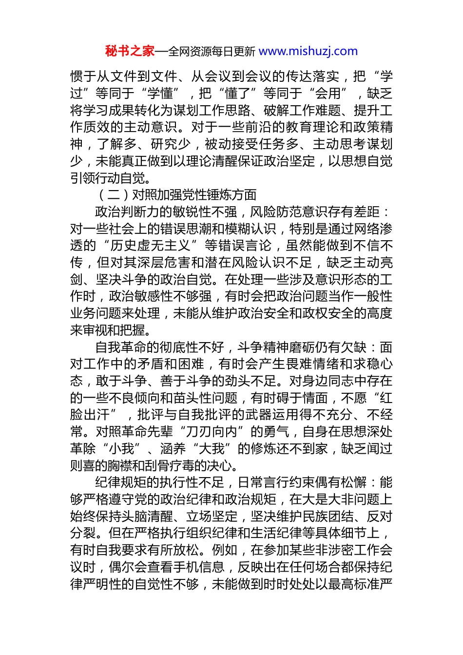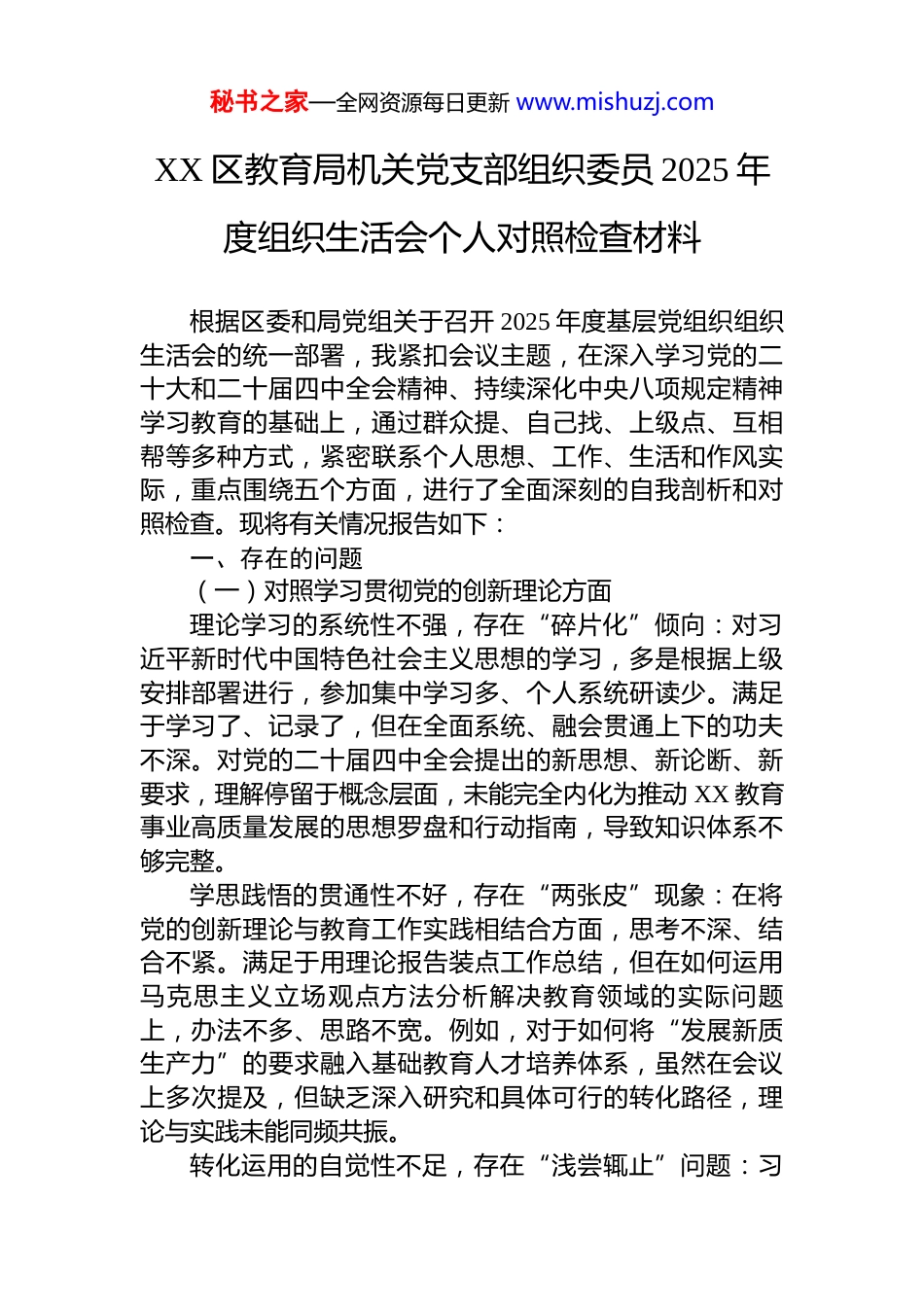 秘书之家—全网资源每日更新 www.mishuzj.comXX 区教育局机关党支部组织委员 2025 年度组织生活会个人对照检查材料根据区委和局党组关于召开 2025 年度基层党组织组织生活会的统一部署,我紧扣会议主题,在深入学习党的二十大和二十届四中全会精神、持续深化中央八项规定精神学习教育的基础上,通过群众提、自己找、上级点、互相帮等多种方式,紧密联系个人思想、工作、生活和作风实际,重点围绕五个方面,进行了全面深刻的自我剖析和对照检查。现将有关情况报告如下:一、存在的问题(一)对照学习贯彻党的创新理论方面理论学习的系统性不强,存在“碎片化”倾向:对习近平新时代中国特色社会主义思想的学习,多是根据上级安排部署进行,参加集中学习多、个人系统研读少。满足于学习了、记录了,但在全面系统、融会贯通上下的功夫不深。对党的二十届四中全会提出的新思想、新论断、新要求,理解停留于概念层面,未能完全内化为推动 XX 教育事业高质量发展的思想罗盘和行动指南,导致知识体系不够完整。学思践悟的贯通性不好,存在“两张皮”现象:在将党的创新理论与教育工作实践相结合方面,思考不深、结合不紧。满足于用理论报告装点工作总结,但在如何运用马克思主义立场观点方法分析解决教育领域的实际问题上,办法不多、思路不宽。例如,对于如何将“发展新质生产力”的要求融入基础教育人才培养体系,虽然在会议上多次提及,但缺乏深入研究和具体可行的转化路径,理论与实践未能同频共振。转化运用的自觉性不足,存在“浅尝辄止”问题:习秘书之家—全网资源每日更新 www.mishuzj.com惯于从文件到文件、从会议到会议的传达落实,把“学过”等同于“学懂”,把“懂了”等同于“会用”,缺乏将学习成果转化为谋划工作思路、破解工作难题、提升工作质效的主动意识。对于一些前沿的教育理论和政策精神,了解多、研究少,被动接受任务多、主动思考谋划少,未能真正做到以理论清醒保证政治坚定,以思想自觉引领行动自觉。(二)对照加强党性锤炼方面政治判断力的敏锐性不强,风险防范意识存有差距:对一些社会上的错误思潮和模糊认识,特别是通过网络渗透的“历史虚无主义”等错误言论,虽然能做到不信不传,但对其深层危害和潜在风险认识不足,缺乏主动亮剑、坚决斗争的政治自觉。在处理一些涉及意识形态的工作时,政治敏感性不够强,有时会把政治问题当作一般性业务问题来处理,未能从维护政治安全和政权安全的高度来审视和把握。自我革命的彻底性不好,斗争精神磨砺仍有欠缺:面对工作中的矛盾和困难,有时会产生畏难情绪和求稳心态,敢于斗争、善于斗争的劲头不足。对身边同志中存在的一些不良倾向和苗头性问题,有时碍于情面,不愿“红脸出汗”,批评与自我批评的武器运用得不充分、不经常。对照革命先辈“刀刃向内”的勇气,自身在思想深处革除“小我”、涵养“大我”的修炼还不到家,缺乏闻过则喜的胸襟和刮骨疗毒的决心。纪律规矩的执行性不足,日常言行约束偶有松懈:能够严格遵守党的政治纪律和政治规矩,在大是大非问题上始终保持头脑清醒、立场坚定,坚决维护民族团结、反对分裂。但在严格执行组织纪律和生活纪律等具体细节上,有时自我要求有所放松。例如,在参加某些非涉密工作会议时,偶尔会查看手机信息,反映出在任何场合都保持纪律严明性的自觉性不够,未能做到时时处处以最高标准严秘书之家—全网资源每日更新 www.mishuzj.com格要求自己。(三)对照联系服务群众方面深入基层的频率不够,调查研究存在“走马观花”:作为教育局机关干部,下到学校一线的次数虽然达到了规定要求,但真正沉下心来与一线教师、学生家长面对面交流的时间不多。调研活动有时程序化、路线化,听取学校领导汇报多,与普通教师、后勤职工的个别访谈少。满足于看到校园环境的整洁、教学秩序的井然,对教师队伍建设中存在的深层次困难、学生成长中面临的实际烦恼,了解得不深不透。服务群众的效率不高,解决诉求存在“时差温差”:对基层学校和师生反映的问题,虽然能够做到接诉即办,但在办理的效率和效果上与群众的期望还有差距。去年,有偏远乡镇学校的几位青年教师反映,...