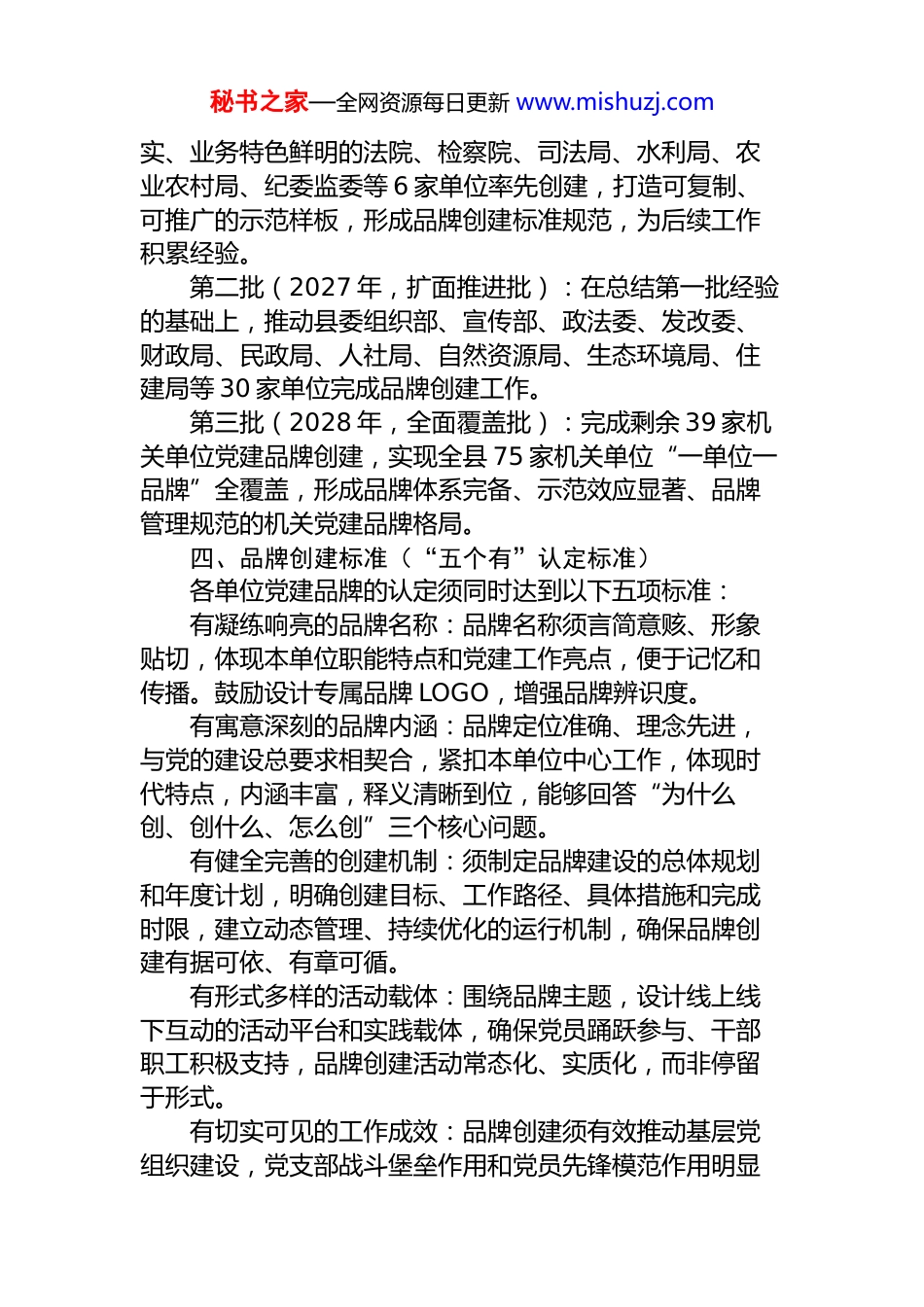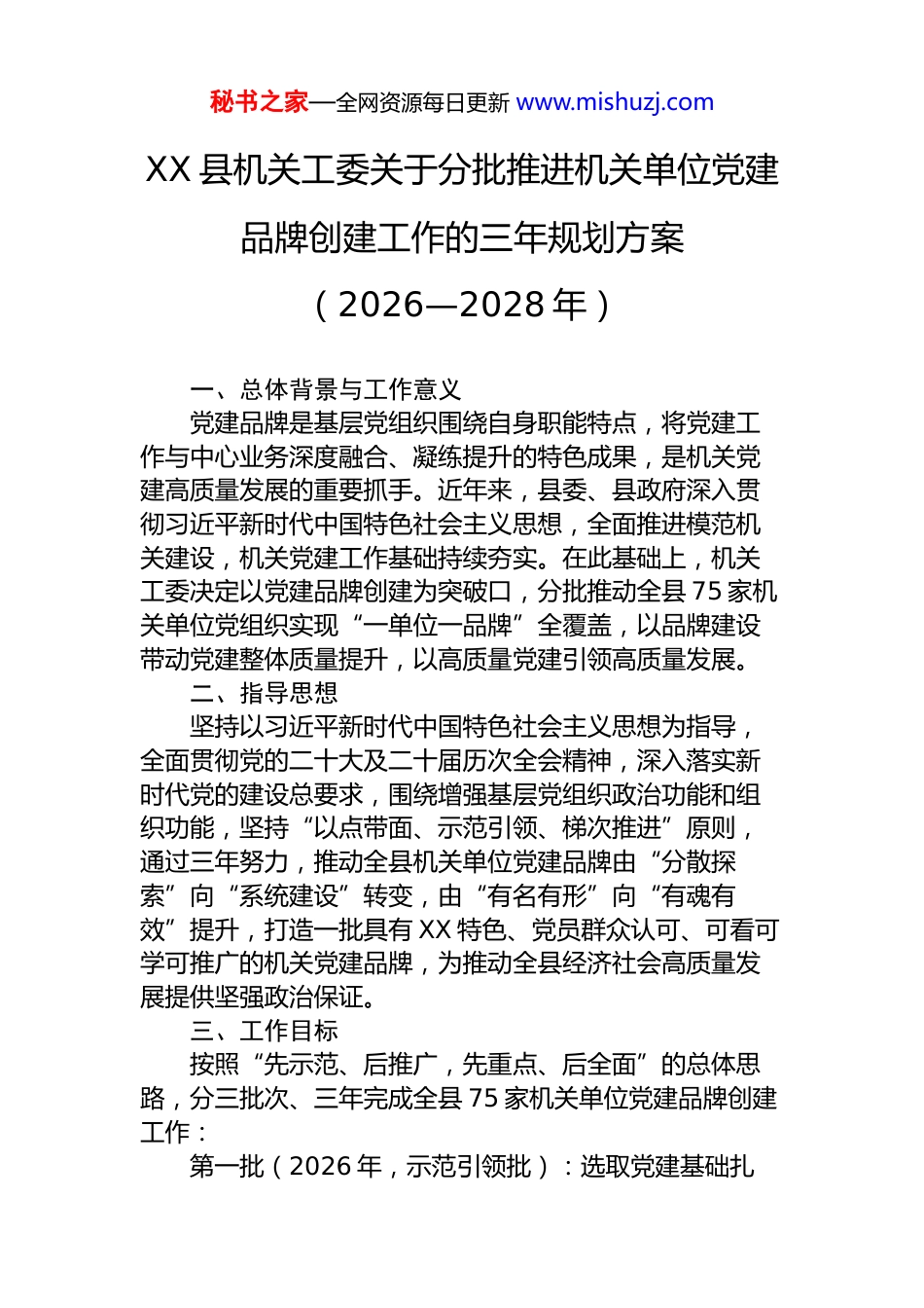 秘书之家—全网资源每日更新 www.mishuzj.comXX 县机关工委关于分批推进机关单位党建品牌创建工作的三年规划方案(2026—2028 年)一、总体背景与工作意义党建品牌是基层党组织围绕自身职能特点,将党建工作与中心业务深度融合、凝练提升的特色成果,是机关党建高质量发展的重要抓手。近年来,县委、县政府深入贯彻习近平新时代中国特色社会主义思想,全面推进模范机关建设,机关党建工作基础持续夯实。在此基础上,机关工委决定以党建品牌创建为突破口,分批推动全县 75 家机关单位党组织实现“一单位一品牌”全覆盖,以品牌建设带动党建整体质量提升,以高质量党建引领高质量发展。二、指导思想坚持以习近平新时代中国特色社会主义思想为指导,全面贯彻党的二十大及二十届历次全会精神,深入落实新时代党的建设总要求,围绕增强基层党组织政治功能和组织功能,坚持“以点带面、示范引领、梯次推进”原则,通过三年努力,推动全县机关单位党建品牌由“分散探索”向“系统建设”转变,由“有名有形”向“有魂有效”提升,打造一批具有 XX 特色、党员群众认可、可看可学可推广的机关党建品牌,为推动全县经济社会高质量发展提供坚强政治保证。三、工作目标按照“先示范、后推广,先重点、后全面”的总体思路,分三批次、三年完成全县 75 家机关单位党建品牌创建工作:第一批(2026 年,示范引领批):选取党建基础扎秘书之家—全网资源每日更新 www.mishuzj.com实、业务特色鲜明的法院、检察院、司法局、水利局、农业农村局、纪委监委等 6 家单位率先创建,打造可复制、可推广的示范样板,形成品牌创建标准规范,为后续工作积累经验。第二批(2027 年,扩面推进批):在总结第一批经验的基础上,推动县委组织部、宣传部、政法委、发改委、财政局、民政局、人社局、自然资源局、生态环境局、住建局等 30 家单位完成品牌创建工作。第三批(2028 年,全面覆盖批):完成剩余 39 家机关单位党建品牌创建,实现全县 75 家机关单位“一单位一品牌”全覆盖,形成品牌体系完备、示范效应显著、品牌管理规范的机关党建品牌格局。四、品牌创建标准(“五个有”认定标准)各单位党建品牌的认定须同时达到以下五项标准:有凝练响亮的品牌名称:品牌名称须言简意赅、形象贴切,体现本单位职能特点和党建工作亮点,便于记忆和传播。鼓励设计专属品牌 LOGO,增强品牌辨识度。有寓意深刻的品牌内涵:品牌定位准确、理念先进,与党的建设总要求相契合,紧扣本单位中心工作,体现时代特点,内涵丰富,释义清晰到位,能够回答“为什么创、创什么、怎么创”三个核心问题。有健全完善的创建机制:须制定品牌建设的总体规划和年度计划,明确创建目标、工作路径、具体措施和完成时限,建立动态管理、持续优化的运行机制,确保品牌创建有据可依、有章可循。有形式多样的活动载体:围绕品牌主题,设计线上线下互动的活动平台和实践载体,确保党员踊跃参与、干部职工积极支持,品牌创建活动常态化、实质化,而非停留于形式。有切实可见的工作成效:品牌创建须有效推动基层党组织建设,党支部战斗堡垒作用和党员先锋模范作用明显秘书之家—全网资源每日更新 www.mishuzj.com增强,党建工作与业务工作深度融合,对本单位工作起到实质性推动作用,并具备一定示范带动效应。五、分批创建工作安排(一)第一批:示范单位重点推进(2026 年全年)第一批 6 家示范单位是党建品牌创建的“先行军”,机关工委将给予重点指导和全程跟踪支持。品牌方向建议:县人民法院:可围绕“公正司法、为民服务”核心定位,打造以“公正先锋”或“天平党建”为主题的党建品牌,将党建工作与司法为民、廉洁司法深度融合,探索“党建+审判质效”工作模式。县人民检察院:可以“法治护航”或“检察铁军”为品牌方向,突出检察机关在法律监督、公益诉讼等方面的职能特色,将党建引领贯穿检察工作全链条。县司法局:可打造“法治为民”或“司法暖心”品牌,将党建与普法宣传、矛盾调解、法律援助相结合,体现基层法治建设的党建担当。县水利局:可围绕“守好水脉、服务民生”定位,打造“水利先锋”或“清水党建...