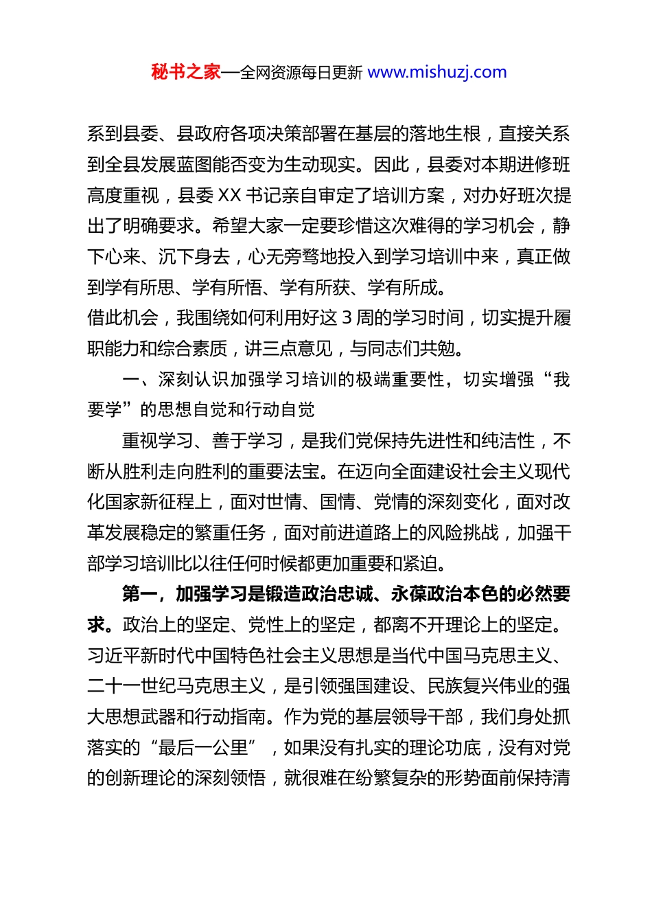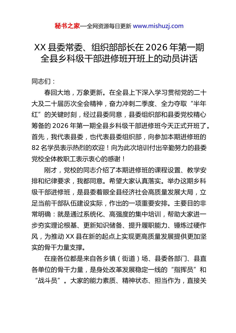 秘书之家—全网资源每日更新 www.mishuzj.comXX 县委常委、组织部部长在 2026 年第一期全县乡科级干部进修班开班上的动员讲话同志们:春回大地,万象更新。在全县上下深入学习贯彻党的二十大及二十届历次全会精神,奋力冲刺二季度、全力夺取“半年红”的关键时刻,经过县委同意,县委组织部和县委党校精心筹备的 2026 年第一期全县乡科级干部进修班今天正式开班了。首先,我代表县委,也代表县委组织部,向参加本期进修班的82 名学员表示热烈的欢迎!向为此次培训付出辛勤努力的县委党校全体教职工表示衷心的感谢!刚才,党校的同志介绍了本期进修班的课程设置、教学安排和纪律要求,我都同意。希望大家认真落实。举办这期乡科级干部进修班,是县委着眼全县经济社会高质量发展大局,立足当前干部队伍建设实际,作出的一项重要安排。主要目的非常明确:就是通过系统化、高强度的集中培训,帮助大家进一步夯实理论根基、更新知识储备、提升履职能力、锤炼过硬作风,为推动 XX 县在新的起点上实现更高质量发展提供更加坚实的骨干力量支撑。在座各位都是来自各乡镇(街道)场、县委各部门、县直各单位的骨干力量,是身处改革发展稳定一线的“指挥员”和“战斗员”。大家的能力素质、精神状态、担当作为,直接关秘书之家—全网资源每日更新 www.mishuzj.com系到县委、县政府各项决策部署在基层的落地生根,直接关系到全县发展蓝图能否变为生动现实。因此,县委对本期进修班高度重视,县委 XX 书记亲自审定了培训方案,对办好班次提出了明确要求。希望大家一定要珍惜这次难得的学习机会,静下心来、沉下身去,心无旁骛地投入到学习培训中来,真正做到学有所思、学有所悟、学有所获、学有所成。借此机会,我围绕如何利用好这 3 周的学习时间,切实提升履职能力和综合素质,讲三点意见,与同志们共勉。一、深刻认识加强学习培训的极端重要性,切实增强“我要学”的思想自觉和行动自觉重视学习、善于学习,是我们党保持先进性和纯洁性,不断从胜利走向胜利的重要法宝。在迈向全面建设社会主义现代化国家新征程上,面对世情、国情、党情的深刻变化,面对改革发展稳定的繁重任务,面对前进道路上的风险挑战,加强干部学习培训比以往任何时候都更加重要和紧迫。第一,加强学习是锻造政治忠诚、永葆政治本色的必然要求。政治上的坚定、党性上的坚定,都离不开理论上的坚定。习近平新时代中国特色社会主义思想是当代中国马克思主义、二十一世纪马克思主义,是引领强国建设、民族复兴伟业的强大思想武器和行动指南。作为党的基层领导干部,我们身处抓落实的“最后一公里”,如果没有扎实的理论功底,没有对党的创新理论的深刻领悟,就很难在纷繁复杂的形势面前保持清秘书之家—全网资源每日更新 www.mishuzj.com醒头脑,很难在大是大非面前站稳政治立场,很难在贯彻执行中央和省市县委决策部署时做到不折不扣。只有持续不断、深入系统地加强理论学习,才能真正理解我们党在新时代举什么旗、走什么路、以什么样的精神状态、朝着什么样的目标继续前进等根本性问题,才能不断提高政治判断力、政治领悟力、政治执行力,确保我们的工作始终沿着正确的政治方向前进,确保我们这支队伍在任何时候任何情况下都绝对忠诚可靠。第二,加强学习是提升履职本领、应对风险挑战的迫切需要。当前,XX 县正处在转型升级、爬坡过坎的关键时期。我们既要面对经济下行压力、新旧动能转换的阵痛,也要应对社会治理现代化、乡村全面振兴、生态环境保护等多重任务叠加的挑战。新情况、新问题、新矛盾层出不穷,对我们的知识结构、思维方式、工作方法都提出了新的更高要求。有的同志可能习惯于凭经验办事,面对新业态、新模式感到“本领恐慌”;有的同志可能对数字经济、人工智能等前沿领域知之甚少,跟不上时代发展的步伐;有的同志可能在化解矛盾纠纷、应对突发事件时办法不多、效果不佳。这些问题,说到底还是能力素质与新时代新任务不相适应的表现。克服“本领恐慌”的唯一途径,就是加强学习。这次进修班安排了专题教学、异地培训、实地调研、学习讨论等多种形式,目的就是要帮助大家开阔视野、更新观...