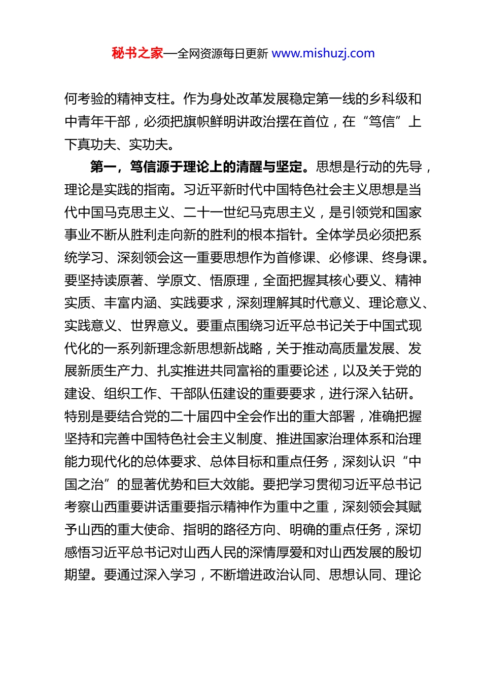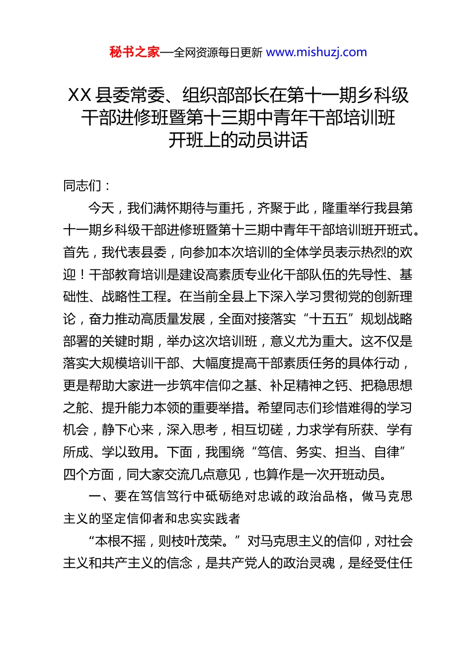 秘书之家—全网资源每日更新 www.mishuzj.comXX 县委常委、组织部部长在第十一期乡科级干部进修班暨第十三期中青年干部培训班开班上的动员讲话同志们:今天,我们满怀期待与重托,齐聚于此,隆重举行我县第十一期乡科级干部进修班暨第十三期中青年干部培训班开班式。首先,我代表县委,向参加本次培训的全体学员表示热烈的欢迎!干部教育培训是建设高素质专业化干部队伍的先导性、基础性、战略性工程。在当前全县上下深入学习贯彻党的创新理论,奋力推动高质量发展,全面对接落实“十五五”规划战略部署的关键时期,举办这次培训班,意义尤为重大。这不仅是落实大规模培训干部、大幅度提高干部素质任务的具体行动,更是帮助大家进一步筑牢信仰之基、补足精神之钙、把稳思想之舵、提升能力本领的重要举措。希望同志们珍惜难得的学习机会,静下心来,深入思考,相互切磋,力求学有所获、学有所成、学以致用。下面,我围绕“笃信、务实、担当、自律”四个方面,同大家交流几点意见,也算作是一次开班动员。一、要在笃信笃行中砥砺绝对忠诚的政治品格,做马克思主义的坚定信仰者和忠实实践者“本根不摇,则枝叶茂荣。”对马克思主义的信仰,对社会主义和共产主义的信念,是共产党人的政治灵魂,是经受住任秘书之家—全网资源每日更新 www.mishuzj.com何考验的精神支柱。作为身处改革发展稳定第一线的乡科级和中青年干部,必须把旗帜鲜明讲政治摆在首位,在“笃信”上下真功夫、实功夫。第一,笃信源于理论上的清醒与坚定。思想是行动的先导,理论是实践的指南。习近平新时代中国特色社会主义思想是当代中国马克思主义、二十一世纪马克思主义,是引领党和国家事业不断从胜利走向新的胜利的根本指针。全体学员必须把系统学习、深刻领会这一重要思想作为首修课、必修课、终身课。要坚持读原著、学原文、悟原理,全面把握其核心要义、精神实质、丰富内涵、实践要求,深刻理解其时代意义、理论意义、实践意义、世界意义。要重点围绕习近平总书记关于中国式现代化的一系列新理念新思想新战略,关于推动高质量发展、发展新质生产力、扎实推进共同富裕的重要论述,以及关于党的建设、组织工作、干部队伍建设的重要要求,进行深入钻研。特别是要结合党的二十届四中全会作出的重大部署,准确把握坚持和完善中国特色社会主义制度、推进国家治理体系和治理能力现代化的总体要求、总体目标和重点任务,深刻认识“中国之治”的显著优势和巨大效能。要把学习贯彻习近平总书记考察山西重要讲话重要指示精神作为重中之重,深刻领会其赋予山西的重大使命、指明的路径方向、明确的重点任务,深切感悟习近平总书记对山西人民的深情厚爱和对山西发展的殷切期望。要通过深入学习,不断增进政治认同、思想认同、理论秘书之家—全网资源每日更新 www.mishuzj.com认同、情感认同,真正把马克思主义看家本领学到手,自觉做党的创新理论的坚定信仰者和忠实践行者,确保各项工作始终沿着正确政治方向前进。第二,笃信体现为政治上的绝对忠诚与自觉。忠诚不是空洞的口号,而是具体的、实践的。它体现在不折不扣贯彻执行党中央决策部署的实际行动上,体现在履职尽责、做好本职工作的实效上,体现在党员、干部的日常言行上。大家要时刻牢记自己的第一身份是共产党员,第一职责是为党工作,不断提高政治判断力、政治领悟力、政治执行力。要胸怀“国之大者”,自觉站在党和国家事业发展全局的高度来思考、谋划和推进本地区、本部门的工作,善于从一般事务中发现政治问题,善于从倾向性、苗头性问题中发现政治端倪,善于从错综复杂的矛盾关系中把握政治逻辑。要深刻领悟“两个确立”的决定性意义,不断增强“四个意识”、坚定“四个自信”、做到“两个维护”,始终在思想上政治上行动上同以习近平同志为核心的党中央保持高度一致。要把对党忠诚内化于心、外化于行,做到党中央提倡的坚决响应、党中央决定的坚决执行、党中央禁止的坚决不做,确保党的路线方针政策在 XX 大地落地生根、开花结果,切实将习近平总书记的殷殷嘱托转化为推动XX 高质量发展的生动实践和实际成效。第三,笃信落脚于行动上的坚决与执着。学...