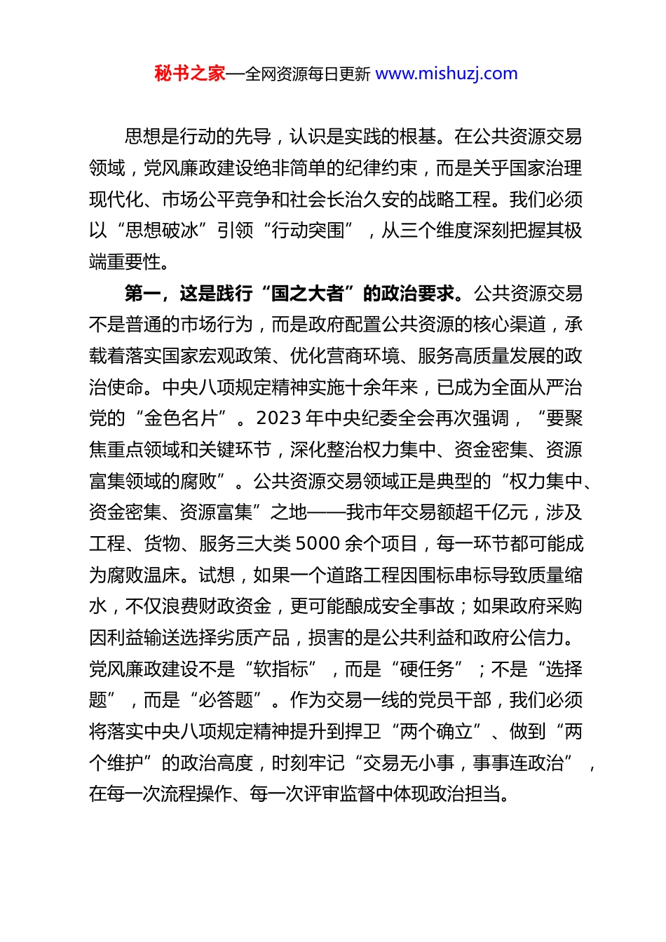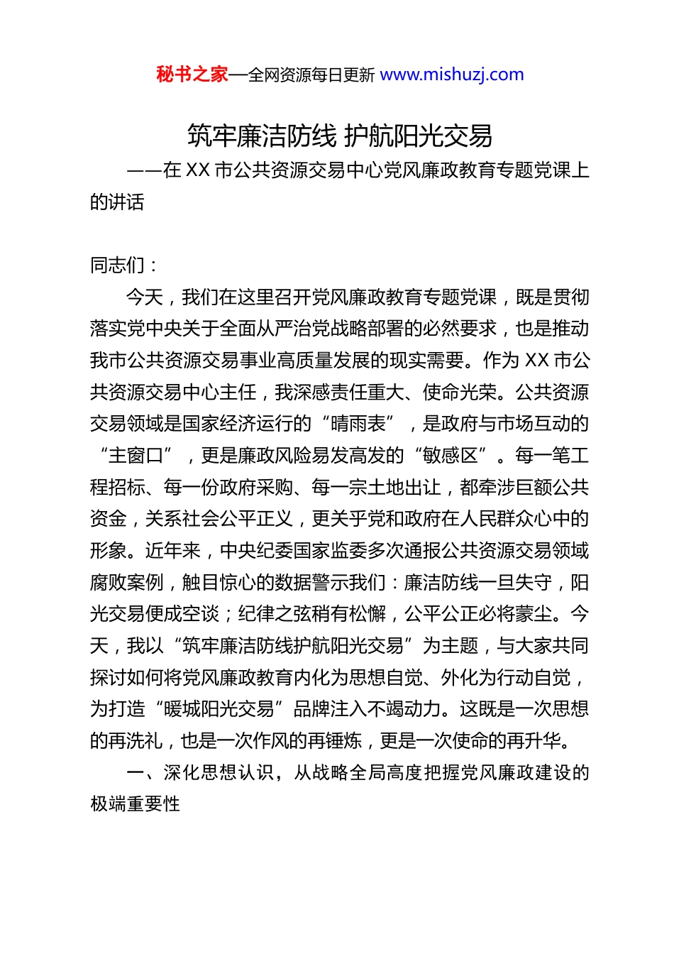秘书之家—全网资源每日更新 www.mishuzj.com筑牢廉洁防线 护航阳光交易——在 XX 市公共资源交易中心党风廉政教育专题党课上的讲话同志们:今天,我们在这里召开党风廉政教育专题党课,既是贯彻落实党中央关于全面从严治党战略部署的必然要求,也是推动我市公共资源交易事业高质量发展的现实需要。作为 XX 市公共资源交易中心主任,我深感责任重大、使命光荣。公共资源交易领域是国家经济运行的“晴雨表”,是政府与市场互动的“主窗口”,更是廉政风险易发高发的“敏感区”。每一笔工程招标、每一份政府采购、每一宗土地出让,都牵涉巨额公共资金,关系社会公平正义,更关乎党和政府在人民群众心中的形象。近年来,中央纪委国家监委多次通报公共资源交易领域腐败案例,触目惊心的数据警示我们:廉洁防线一旦失守,阳光交易便成空谈;纪律之弦稍有松懈,公平公正必将蒙尘。今天,我以“筑牢廉洁防线护航阳光交易”为主题,与大家共同探讨如何将党风廉政教育内化为思想自觉、外化为行动自觉,为打造“暖城阳光交易”品牌注入不竭动力。这既是一次思想的再洗礼,也是一次作风的再锤炼,更是一次使命的再升华。一、深化思想认识,从战略全局高度把握党风廉政建设的极端重要性秘书之家—全网资源每日更新 www.mishuzj.com思想是行动的先导,认识是实践的根基。在公共资源交易领域,党风廉政建设绝非简单的纪律约束,而是关乎国家治理现代化、市场公平竞争和社会长治久安的战略工程。我们必须以“思想破冰”引领“行动突围”,从三个维度深刻把握其极端重要性。第一,这是践行“国之大者”的政治要求。公共资源交易不是普通的市场行为,而是政府配置公共资源的核心渠道,承载着落实国家宏观政策、优化营商环境、服务高质量发展的政治使命。中央八项规定精神实施十余年来,已成为全面从严治党的“金色名片”。2023 年中央纪委全会再次强调,“要聚焦重点领域和关键环节,深化整治权力集中、资金密集、资源富集领域的腐败”。公共资源交易领域正是典型的“权力集中、资金密集、资源富集”之地——我市年交易额超千亿元,涉及工程、货物、服务三大类 5000 余个项目,每一环节都可能成为腐败温床。试想,如果一个道路工程因围标串标导致质量缩水,不仅浪费财政资金,更可能酿成安全事故;如果政府采购因利益输送选择劣质产品,损害的是公共利益和政府公信力。党风廉政建设不是“软指标”,而是“硬任务”;不是“选择题”,而是“必答题”。作为交易一线的党员干部,我们必须将落实中央八项规定精神提升到捍卫“两个确立”、做到“两个维护”的政治高度,时刻牢记“交易无小事,事事连政治”,在每一次流程操作、每一次评审监督中体现政治担当。秘书之家—全网资源每日更新 www.mishuzj.com第二,这是护航“暖城阳光交易”的生命线。我市提出打造“暖城阳光交易”品牌,核心要义在于“阳光”——即公开透明、公平公正、廉洁高效。但“阳光”不会自然降临,必须靠铁的纪律来守护。公共资源交易领域具有“三多一高”特点:参与主体多(供应商、代理机构、评审专家等)、交易环节多(公告、投标、开标、评标、定标)、资金流量大、廉政风险高。据不完全统计,全国公共资源交易领域腐败案件中,70%以上集中在评标定标环节,60%涉及围标串标和利益输送。去年我市查处的一起典型案例中,某区交易中心干部收受建筑企业“好处费”,在评标中暗示专家打分倾向,导致劣质企业中标,最终工程烂尾,群众投诉不断。这警示我们:交易流程的“阳光度”直接取决于干部作风的“纯净度”。如果思想上轻视廉政建设,把交易系统当作“摇钱树”,把审批权当成“私家田”,那么“暖城阳光”就会沦为“暗箱操作”的遮羞布。我们必须清醒认识到,党风廉政建设是“暖城阳光交易”的根基所在——没有廉洁,阳光就是虚妄;没有纪律,交易就是风险。第三,这是实现个人价值的立身之本。有些同志认为,“交易工作只是程序性操作,廉政风险与我无关”。这种思想极其危险!公共资源交易岗位看似平凡,实则权力隐性化、风险长期化。一位资深纪检干部曾对我说:“在交易中心,一杯茶可能通向围猎陷阱,一次‘通融...