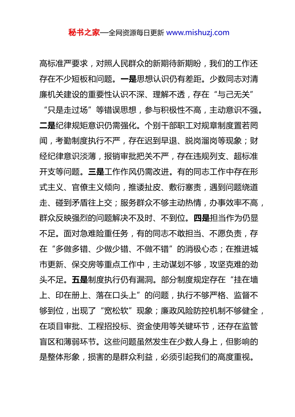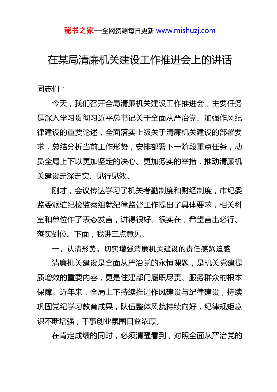 秘书之家—全网资源每日更新 www.mishuzj.com在某局清廉机关建设工作推进会上的讲话 同志们:今天,我们召开全局清廉机关建设工作推进会,主要任务是深入学习贯彻习近平总书记关于全面从严治党、加强作风纪律建设的重要论述,全面落实上级关于清廉机关建设的部署要求,总结分析当前工作形势,安排部署下一阶段重点任务,动员全局上下以更加坚定的决心、更加务实的举措,推动清廉机关建设走深走实、见行见效。刚才,会议传达学习了机关考勤制度和财经制度,市纪委监委派驻纪检监察组就纪律监督工作提出了具体要求,相关科室和单位作了表态发言,讲得很好、很实在,希望言出必行、落实到位。下面,我讲三点意见。一、认清形势,切实增强清廉机关建设的责任感紧迫感清廉机关建设是全面从严治党的永恒课题,是机关党建提质增效的重要内容,更是住建部门履职尽责、服务群众的根本保障。近年来,全局上下持续推进作风建设与纪律建设,持续巩固党纪学习教育成果,队伍整体风貌持续向好,纪律规矩意识不断增强,干事创业氛围日益浓厚。在肯定成绩的同时,必须清醒看到,对照全面从严治党的秘书之家—全网资源每日更新 www.mishuzj.com高标准严要求,对照人民群众的新期待新期盼,我们的工作还存在不少短板和问题。一是思想认识仍有差距。少数同志对清廉机关建设的重要性认识不深、理解不透,存在“与己无关”“只是走过场”等错误思想,参与积极性不高,主动意识不强。二是纪律规矩意识仍需强化。个别干部职工对规章制度置若罔闻,考勤制度执行不严,存在迟到早退、脱岗溜岗等现象;财经纪律意识淡薄,报销审批把关不严,存在违规列支、超标准开支等问题。三是工作作风仍需改进。有的同志工作中存在形式主义、官僚主义倾向,推诿扯皮、敷衍塞责,遇到问题绕道走、碰到矛盾往上交;服务群众不够主动热情,办事效率不高,群众反映强烈的问题解决不及时、不到位。四是担当作为仍显不足。面对急难险重任务,有的同志不敢担当、不愿负责,存在“多做多错、少做少错、不做不错”的消极心态;在推进城市更新、保交房等重点工作中,主动谋划不够,攻坚克难的劲头不足。五是制度执行仍有漏洞。部分制度规定存在“挂在墙上、印在册上、落在口头上”的问题,执行不够严格、监督不够到位,出现了“宽松软”现象;廉政风险防控机制不够健全,在项目审批、工程招投标、资金使用等关键环节,还存在监管盲区和薄弱环节。这些问题虽然发生在少数人身上,但影响的是整体形象,损害的是群众利益,必须引起我们的高度重视。秘书之家—全网资源每日更新 www.mishuzj.com全体干部职工务必以刀刃向内的勇气、刮骨疗毒的决心,直面问题、深刻反思、坚决整改,真正把纪律和规矩挺在前面,以自我革命精神推进清廉机关建设。二、突出重点,扎实推进清廉机关建设各项任务落实清廉机关建设是一项系统工程,必须坚持系统谋划、整体推进、重点突破,以严的基调、严的措施、严的氛围,推动各项工作落地见效。要持续强化理论武装,筑牢思想根基。坚持把学习贯彻习近平新时代中国特色社会主义思想作为首要政治任务,深入学习习近平总书记关于全面从严治党、加强作风纪律建设的重要论述,做到学深悟透、入脑入心、见行见效。建立健全常态化学习机制,坚持党组理论学习中心组带头学、党支部定期学、干部职工日常学相结合,确保理论学习全覆盖、无死角。常态化开展警示教育,定期组织观看警示教育片、参观廉政教育基地、剖析典型案例,用身边事教育身边人,引导干部职工知敬畏、存戒惧、守底线。大力加强廉洁文化建设,充分利用办公场所、政务大厅、门户网站等载体,营造崇廉尚廉的浓厚氛围,让清正廉洁成为全体干部职工的价值追求和行动自觉。要狠抓作风整治,严格执行各项规章制度。制度是管根本管长远的。要严格执行考勤制度,健全完善考勤台账,明确签秘书之家—全网资源每日更新 www.mishuzj.com到签退时间节点,实行日统计、周通报、月考核制度,对迟到早退、旷工脱岗等问题依规依纪严肃处理。严格执行财经制度,规范预算编制、资金审批、费用报销等流程,严控“三公”经费支出,杜绝超标准接待、违规发放津补贴等问题...