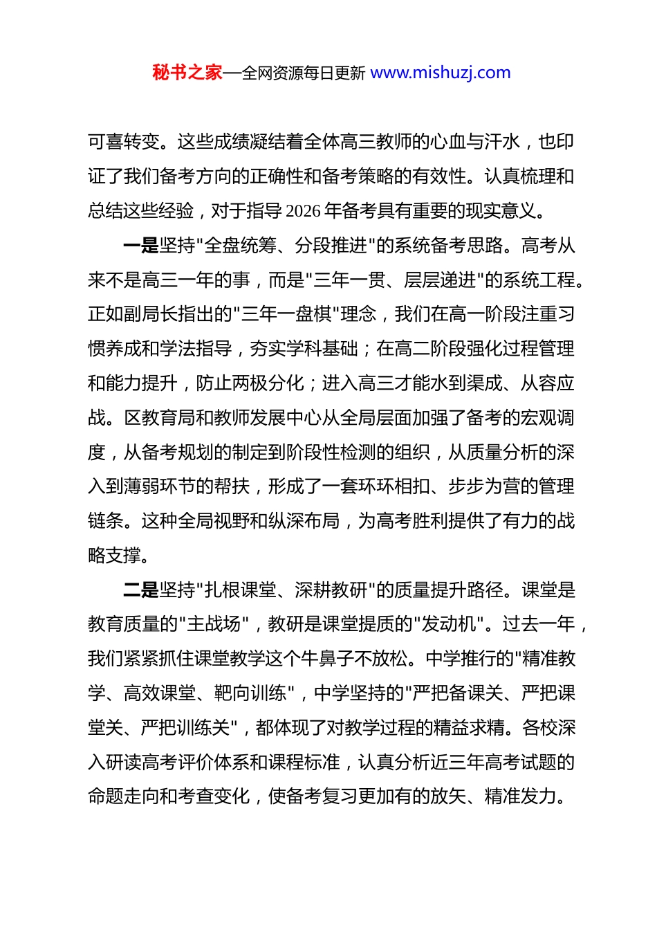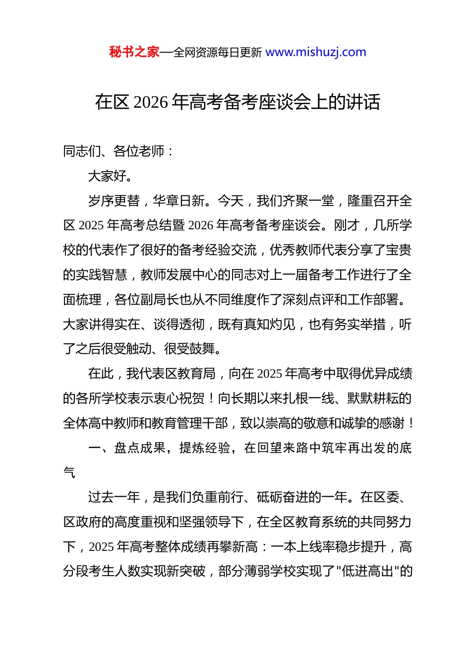 秘书之家—全网资源每日更新 www.mishuzj.com在区 2026 年高考备考座谈会上的讲话 同志们、各位老师:大家好。岁序更替,华章日新。今天,我们齐聚一堂,隆重召开全区 2025 年高考总结暨 2026 年高考备考座谈会。刚才,几所学校的代表作了很好的备考经验交流,优秀教师代表分享了宝贵的实践智慧,教师发展中心的同志对上一届备考工作进行了全面梳理,各位副局长也从不同维度作了深刻点评和工作部署。大家讲得实在、谈得透彻,既有真知灼见,也有务实举措,听了之后很受触动、很受鼓舞。在此,我代表区教育局,向在 2025 年高考中取得优异成绩的各所学校表示衷心祝贺!向长期以来扎根一线、默默耕耘的全体高中教师和教育管理干部,致以崇高的敬意和诚挚的感谢!一、盘点成果,提炼经验,在回望来路中筑牢再出发的底气过去一年,是我们负重前行、砥砺奋进的一年。在区委、区政府的高度重视和坚强领导下,在全区教育系统的共同努力下,2025 年高考整体成绩再攀新高:一本上线率稳步提升,高分段考生人数实现新突破,部分薄弱学校实现了"低进高出"的秘书之家—全网资源每日更新 www.mishuzj.com可喜转变。这些成绩凝结着全体高三教师的心血与汗水,也印证了我们备考方向的正确性和备考策略的有效性。认真梳理和总结这些经验,对于指导 2026 年备考具有重要的现实意义。一是坚持"全盘统筹、分段推进"的系统备考思路。高考从来不是高三一年的事,而是"三年一贯、层层递进"的系统工程。正如副局长指出的"三年一盘棋"理念,我们在高一阶段注重习惯养成和学法指导,夯实学科基础;在高二阶段强化过程管理和能力提升,防止两极分化;进入高三才能水到渠成、从容应战。区教育局和教师发展中心从全局层面加强了备考的宏观调度,从备考规划的制定到阶段性检测的组织,从质量分析的深入到薄弱环节的帮扶,形成了一套环环相扣、步步为营的管理链条。这种全局视野和纵深布局,为高考胜利提供了有力的战略支撑。二是坚持"扎根课堂、深耕教研"的质量提升路径。课堂是教育质量的"主战场",教研是课堂提质的"发动机"。过去一年,我们紧紧抓住课堂教学这个牛鼻子不放松。中学推行的"精准教学、高效课堂、靶向训练",中学坚持的"严把备课关、严把课堂关、严把训练关",都体现了对教学过程的精益求精。各校深入研读高考评价体系和课程标准,认真分析近三年高考试题的命题走向和考查变化,使备考复习更加有的放矢、精准发力。秘书之家—全网资源每日更新 www.mishuzj.com各学科教研员充分发挥专业引领作用,通过开展专题备考研讨、跨校联合备课、优质课展评等活动,推动校际之间资源共享、优势互补。正是这种对教学质量的执着坚守和对教研工作的深度投入,锻造了教师队伍的专业素养,提升了全区备考的整体水平。三是坚持"因材施教、精准帮扶"的个性化培养策略。教育的本质是唤醒和成就每一个生命。在高考备考过程中,我们始终坚持"不让一个学生掉队"的信念。学校实施的"分层施教、优生拔尖、学困托底、一人一策",实验学校开展的"心理护航、个性定制"行动,都是"以学生为中心"理念的生动实践。我们既注重优秀生的拔尖培养,通过强基计划辅导、学科竞赛培训等途径拓宽优生的发展空间;也关注临界生和学困生的精准帮扶,通过建立帮扶台账、实施导师承包制,确保每一个学生都能得到针对性的指导和关怀。老师介绍的"用真心换真心,以陪伴促成长"的带班经验,体现了教育工作者最质朴、最动人的教育情怀。这种精细化、人性化的管理,让备考充满了温度,也最大程度地激发了学生的内驱力。四是坚持"校内协同、校际联动"的共同体建设模式。高考备考是一项牵涉面广、协同性强的综合工程,任何一所学校都无法关起门来单干。中学倡导的"团队协作、资源共享、合力攻秘书之家—全网资源每日更新 www.mishuzj.com坚"理念,道出了成功的真谛。在校内,我们建立了"校级统筹—年级组调度—学科组落实—班主任盯人"的四级联动机制,形成了全员参与、全程跟进的备考格局。在家校之间,我们通过家长会、家访、线上沟通等多种渠道,架起了家校共育的桥梁,引导家长理性面对高考,成为学生坚强的后盾。在区域层面,...