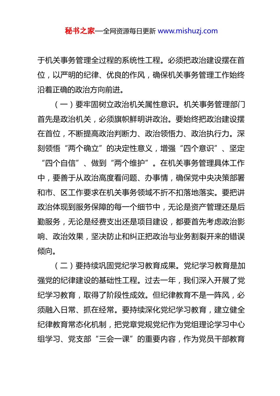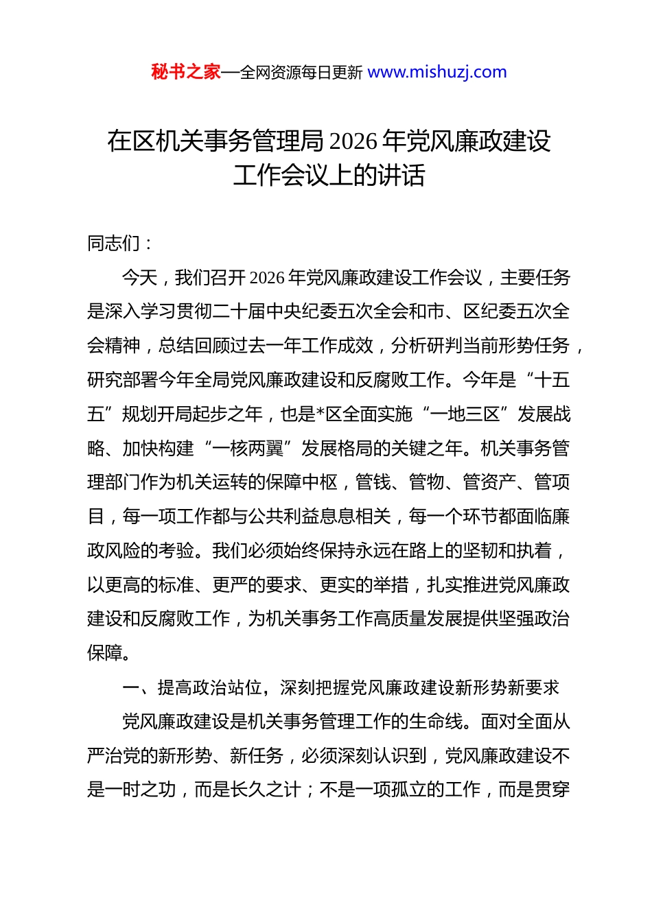 秘书之家—全网资源每日更新 www.mishuzj.com在区机关事务管理局 2026 年党风廉政建设工作会议上的讲话 同志们:今天,我们召开 2026 年党风廉政建设工作会议,主要任务是深入学习贯彻二十届中央纪委五次全会和市、区纪委五次全会精神,总结回顾过去一年工作成效,分析研判当前形势任务,研究部署今年全局党风廉政建设和反腐败工作。今年是“十五五”规划开局起步之年,也是*区全面实施“一地三区”发展战略、加快构建“一核两翼”发展格局的关键之年。机关事务管理部门作为机关运转的保障中枢,管钱、管物、管资产、管项目,每一项工作都与公共利益息息相关,每一个环节都面临廉政风险的考验。我们必须始终保持永远在路上的坚韧和执着,以更高的标准、更严的要求、更实的举措,扎实推进党风廉政建设和反腐败工作,为机关事务工作高质量发展提供坚强政治保障。一、提高政治站位,深刻把握党风廉政建设新形势新要求党风廉政建设是机关事务管理工作的生命线。面对全面从严治党的新形势、新任务,必须深刻认识到,党风廉政建设不是一时之功,而是长久之计;不是一项孤立的工作,而是贯穿秘书之家—全网资源每日更新 www.mishuzj.com于机关事务管理全过程的系统性工程。必须把政治建设摆在首位,以严明的纪律、优良的作风,确保机关事务管理工作始终沿着正确的政治方向前进。(一)要牢固树立政治机关属性意识。机关事务管理部门首先是政治机关,必须旗帜鲜明讲政治。要始终把政治建设摆在首位,不断提高政治判断力、政治领悟力、政治执行力。深刻领悟“两个确立”的决定性意义,增强“四个意识”、坚定“四个自信”、做到“两个维护”。在机关事务管理具体工作中,要善于从政治高度看问题、办事情,确保党中央决策部署和市、区工作要求在机关事务领域不折不扣落地落实。要把讲政治体现到服务保障的每一个细节中,无论是资产管理还是后勤服务,无论是经费支出还是项目建设,都要首先考虑政治影响、政治效果,坚决防止和纠正把政治与业务割裂开来的错误倾向。(二)要持续巩固党纪学习教育成果。党纪学习教育是加强党的纪律建设的基础性工程。过去一年,我们深入开展了党纪学习教育,取得了阶段性成效。但纪律教育不是一阵风,必须融入日常、抓在经常。要持续深化党纪学习教育,建立健全纪律教育常态化机制,把党章党规党纪作为党组理论学习中心组学习、党支部“三会一课”的重要内容,作为党员干部教育秘书之家—全网资源每日更新 www.mishuzj.com培训的必修课。要结合巩固拓展深入贯彻中央八项规定精神学习教育成果,认真组织开展树立和践行正确政绩观学习教育,引导党员干部牢记“三个务必”,践行“三严三实”,从思想深处解决好“政绩为谁而树、树什么样的政绩、靠什么树政绩”的问题,坚决防止和克服形式主义、官僚主义。(三)要深刻把握机关事务领域廉政风险特征。机关事务管理工作涉及面广、资金密集、资源富集,廉政风险点多面广。从近年来的监督执纪情况看,机关事务领域违纪违法问题时有发生,特别是在工程项目招投标、物资采购、资产处置、公车管理等重点领域和关键环节,廉政风险依然较高。随着“十五五”规划的实施,机关事务保障任务将更加繁重,资源配置和资金投入将进一步加大,如果不加强防范,很容易滋生腐败问题。必须清醒看到,反腐败斗争形势依然严峻复杂,遏制增量、清除存量的任务依然艰巨。要始终保持清醒头脑,以如履薄冰的谨慎态度,深刻把握机关事务领域廉政风险的演变规律和特点,找准风险点、堵塞风险源,坚决铲除腐败滋生的土壤和条件。二、聚焦重点任务,全力推动党风廉政建设走深走实党风廉政建设必须坚持问题导向、目标导向、结果导向相统一,紧盯重点领域和关键环节,精准发力、持续用力,以重秘书之家—全网资源每日更新 www.mishuzj.com点突破带动全局提升。要紧密结合机关事务管理工作实际,将廉政风险防控融入业务流程,构建全链条、全周期的风险防控体系,确保权力在阳光下运行。(一)要紧盯重点领域严控风险。机关事务管理的核心在于管好钱、管好物、管好资产、管好项目。这“四管”是高风险领域,必须作为党风廉政建设的重中之重...