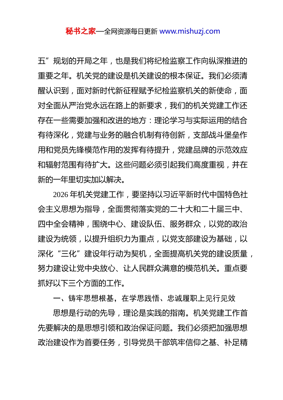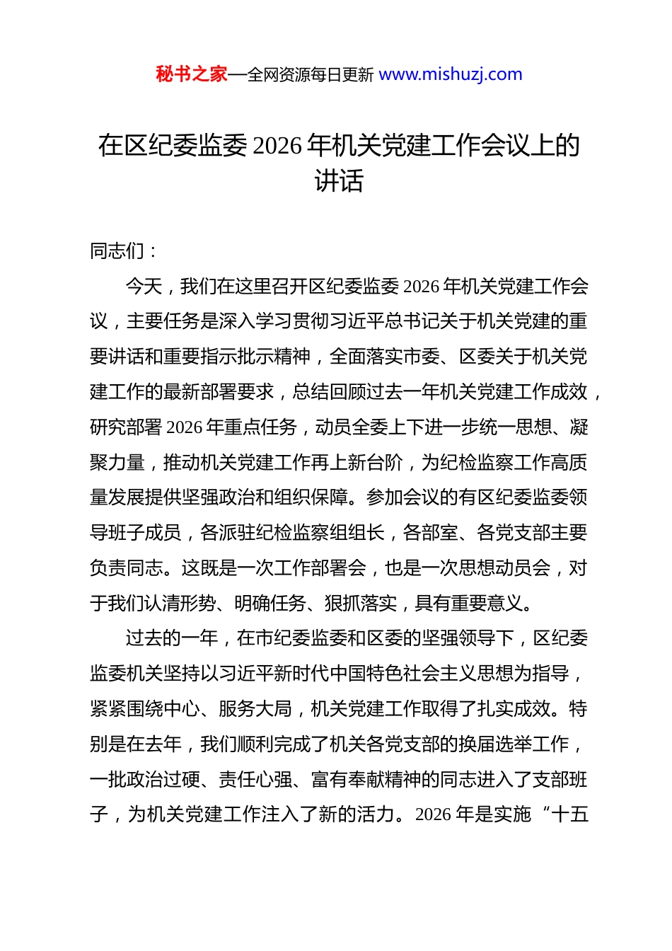 秘书之家—全网资源每日更新 www.mishuzj.com在区纪委监委 2026 年机关党建工作会议上的讲话 同志们:今天,我们在这里召开区纪委监委 2026 年机关党建工作会议,主要任务是深入学习贯彻习近平总书记关于机关党建的重要讲话和重要指示批示精神,全面落实市委、区委关于机关党建工作的最新部署要求,总结回顾过去一年机关党建工作成效,研究部署 2026 年重点任务,动员全委上下进一步统一思想、凝聚力量,推动机关党建工作再上新台阶,为纪检监察工作高质量发展提供坚强政治和组织保障。参加会议的有区纪委监委领导班子成员,各派驻纪检监察组组长,各部室、各党支部主要负责同志。这既是一次工作部署会,也是一次思想动员会,对于我们认清形势、明确任务、狠抓落实,具有重要意义。过去的一年,在市纪委监委和区委的坚强领导下,区纪委监委机关坚持以习近平新时代中国特色社会主义思想为指导,紧紧围绕中心、服务大局,机关党建工作取得了扎实成效。特别是在去年,我们顺利完成了机关各党支部的换届选举工作,一批政治过硬、责任心强、富有奉献精神的同志进入了支部班子,为机关党建工作注入了新的活力。2026 年是实施“十五秘书之家—全网资源每日更新 www.mishuzj.com五”规划的开局之年,也是我们将纪检监察工作向纵深推进的重要之年。机关党的建设是机关建设的根本保证。我们必须清醒认识到,面对新时代新征程赋予纪检监察机关的新使命,面对全面从严治党永远在路上的新要求,我们的机关党建工作还存在一些需要加强和改进的地方:理论学习与实际运用的结合有待深化,党建与业务的融合机制有待创新,支部战斗堡垒作用和党员先锋模范作用的发挥有待提升,党建品牌的示范效应和辐射范围有待扩大。这些问题必须引起我们高度重视,并在新的一年里切实加以解决。2026 年机关党建工作,要坚持以习近平新时代中国特色社会主义思想为指导,全面贯彻落实党的二十大和二十届三中、四中全会精神,围绕中心、建设队伍、服务群众,以党的政治建设为统领,以提升组织力为重点,以党支部建设为基础,以深化“三化”建设年行动为契机,全面提高机关党的建设质量,努力建设让党中央放心、让人民群众满意的模范机关。重点要抓好以下三个方面的工作。一、铸牢思想根基,在学思践悟、忠诚履职上见行见效思想是行动的先导,理论是实践的指南。机关党建工作首先要解决的是思想引领和政治保证问题。我们必须把加强思想政治建设作为首要任务,引导党员干部筑牢信仰之基、补足精秘书之家—全网资源每日更新 www.mishuzj.com神之钙、把稳思想之舵。(一)要深化理论武装,把稳思想之舵。坚持不懈用习近平新时代中国特色社会主义思想武装头脑、指导实践、推动工作,这是首要政治任务。要建立健全常态化学习机制,将理想信念教育和政治忠诚教育贯穿于党员教育管理监督全过程。要深刻领悟党的创新理论的核心要义、精神实质、丰富内涵、实践要求,特别是关于党的自我革命、全面从严治党的重要论述,自觉用以统领纪检监察一切工作。要紧密联系纪检监察工作实际和干部队伍思想实际,深入学习领会党的二十大和二十届三中、四中全会精神,深刻把握新时代党的建设总要求和全面从严治党战略部署,不断提高政治判断力、政治领悟力、政治执行力,确保纪检监察工作始终沿着正确政治方向前进。理论学习不能停留在口头上、纸面上,必须转化为谋划工作的思路、破解难题的办法、推动发展的实效。要健全和完善理论学习考核评价机制,探索建立学习积分制度,推动理论学习由“软任务”变为“硬约束”,确保学深悟透、融会贯通。(二)要坚持求真务实,抓好学习教育。树立和践行正确政绩观是党员干部的终身课题。要严格按照中央和上级党组织关于开展正确政绩观学习教育的统一部署,结合纪检监察工作实际,精心组织、扎实推进。要引导党员干部深刻理解“政绩秘书之家—全网资源每日更新 www.mishuzj.com为谁而树、树什么样的政绩、靠什么树政绩”等重大问题,进一步弘扬实干作风,坚决摒弃形式主义、官僚主义,树立“靠实干创实绩、以实绩论英雄”的鲜明导向。纪检监察机关作为政治机关,监督保障执行、促进完善发展...