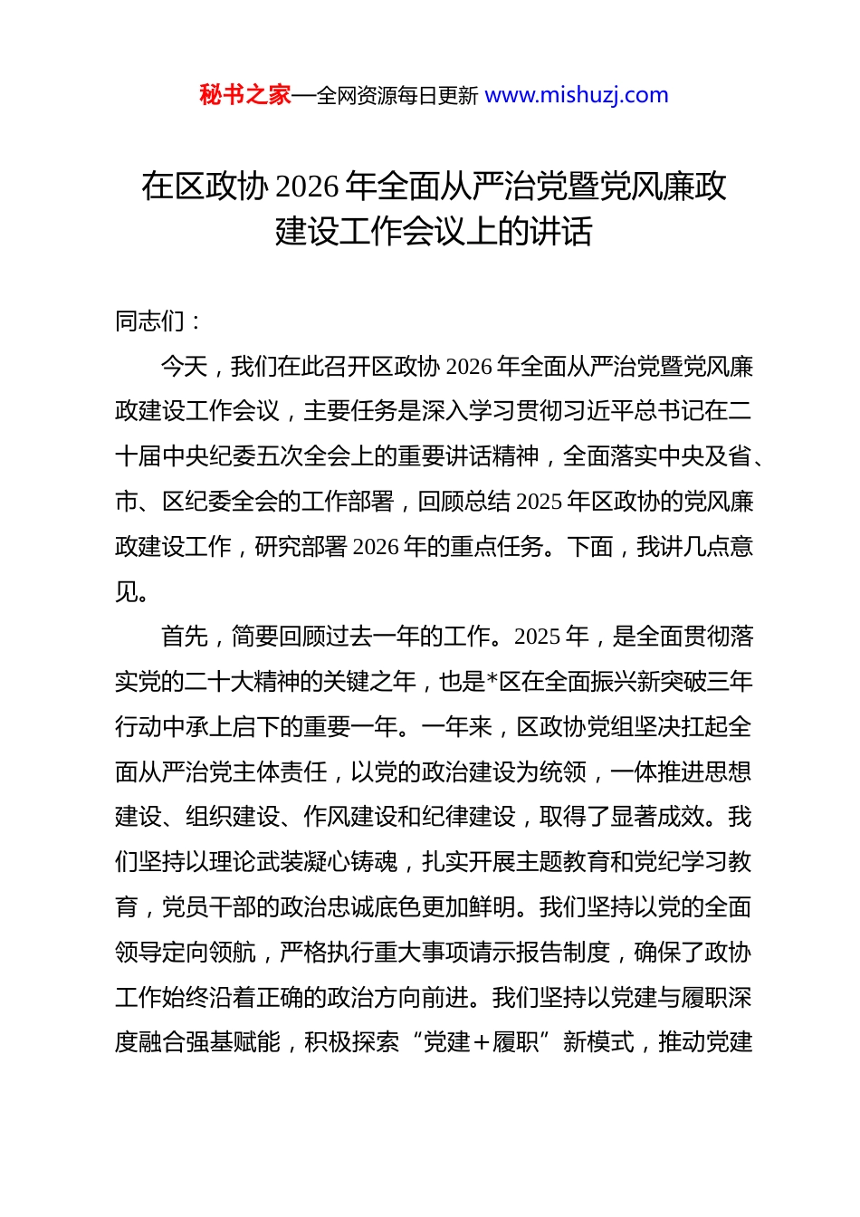 秘书之家—全网资源每日更新 www.mishuzj.com在区政协 2026 年全面从严治党暨党风廉政建设工作会议上的讲话 同志们:今天,我们在此召开区政协 2026 年全面从严治党暨党风廉政建设工作会议,主要任务是深入学习贯彻习近平总书记在二十届中央纪委五次全会上的重要讲话精神,全面落实中央及省、市、区纪委全会的工作部署,回顾总结 2025 年区政协的党风廉政建设工作,研究部署 2026 年的重点任务。下面,我讲几点意见。首先,简要回顾过去一年的工作。2025 年,是全面贯彻落实党的二十大精神的关键之年,也是*区在全面振兴新突破三年行动中承上启下的重要一年。一年来,区政协党组坚决扛起全面从严治党主体责任,以党的政治建设为统领,一体推进思想建设、组织建设、作风建设和纪律建设,取得了显著成效。我们坚持以理论武装凝心铸魂,扎实开展主题教育和党纪学习教育,党员干部的政治忠诚底色更加鲜明。我们坚持以党的全面领导定向领航,严格执行重大事项请示报告制度,确保了政协工作始终沿着正确的政治方向前进。我们坚持以党建与履职深度融合强基赋能,积极探索“党建+履职”新模式,推动党建秘书之家—全网资源每日更新 www.mishuzj.com工作与专题协商、调研视察、提案督办等履职活动同频共振、互促共进,有效提升了“两个全覆盖”的工作质量。我们持续巩固深化作风能力建设,推动政协委员和机关干部深入基层、联系群众,聚焦群众急难愁盼问题开展协商监督,政协工作的为民底色更加厚重。在肯定成绩的同时,也必须清醒地看到,对照新时代党的建设总要求和人民群众的新期待,我们的工作还存在一些差距和不足。例如,少数党员干部的纪律规矩意识仍需进一步强化;党建工作与履职实践的融合深度和广度还有待拓展;监督执纪问责的力度和精度有待提升,形式主义、官僚主义等作风顽疾在一定范围内依然存在。这些问题,必须在今后的工作中下大力气加以解决。新征程上,推进全面从严治党、加强党风廉政建设,任务艰巨、责任重大。我们要深刻认识到,全面从严治党是新时代党的自我革命的伟大实践,是党永葆生机活力、走好新的赶考之路的必由之路。对于人民政协而言,只有坚定不移地推进全面从严治党,才能更好地发挥专门协商机构作用,为*区经济社会高质量发展贡献智慧和力量。下面,我将围绕今年的工作,重点强调四个方面。一、提高政治站位,以更强政治自觉把牢全面从严治党正确方向秘书之家—全网资源每日更新 www.mishuzj.com政协首先是政治组织,旗帜鲜明讲政治是人民政协的根本要求。推进全面从严治党,首要的就是从政治上看、从政治上抓。一要深刻领悟“两个确立”的决定性意义。这是新时代取得一切成就最根本的保证。区政协各级党组织和全体党员干部要持续在学懂弄通做实习近平新时代中国特色社会主义思想上下功夫,不断提高政治判断力、政治领悟力、政治执行力。要将“两个确立”的政治成果转化为坚决做到“两个维护”的政治自觉,始终在思想上政治上行动上同以习近平同志为核心的党中央保持高度一致,确保中央和省市区委的各项决策部署在政协系统不折不扣地得到贯彻执行。二要始终坚持党的全面领导。要把党的领导作为政协工作的“定盘星”,将其贯穿于专题调研、协商议政、民主监督、凝聚共识等履职全过程各方面,确保政协工作始终在党的领导下积极稳妥、扎实有效地展开。政协党组要发挥好把方向、管大局、保落实的领导作用。要完善党对政协工作领导的组织体系和制度机制,确保党中央的决策部署到哪里,政协履职的跟进服务就到哪里,政协的力量和智慧就汇聚到哪里。三要精准把握政协党建规律特点。政协作为最广泛的爱国统一战线组织,其党建工作具有鲜明的统战性、协商性、民主秘书之家—全网资源每日更新 www.mishuzj.com性特征。必须找准党建工作与政协履职的结合点、着力点,避免“两张皮”现象。要积极探索在新形势下加强政协党建工作的新思路、新办法,以创新的思维和举措,推动党建工作由“有形覆盖”向“有效覆盖”深化。要通过坚强有力的党组织,把党的政治主张和思想引领,转化为广大委员的思想共识和行动自觉,以高质量党建引领政协事业高质量发展。二...