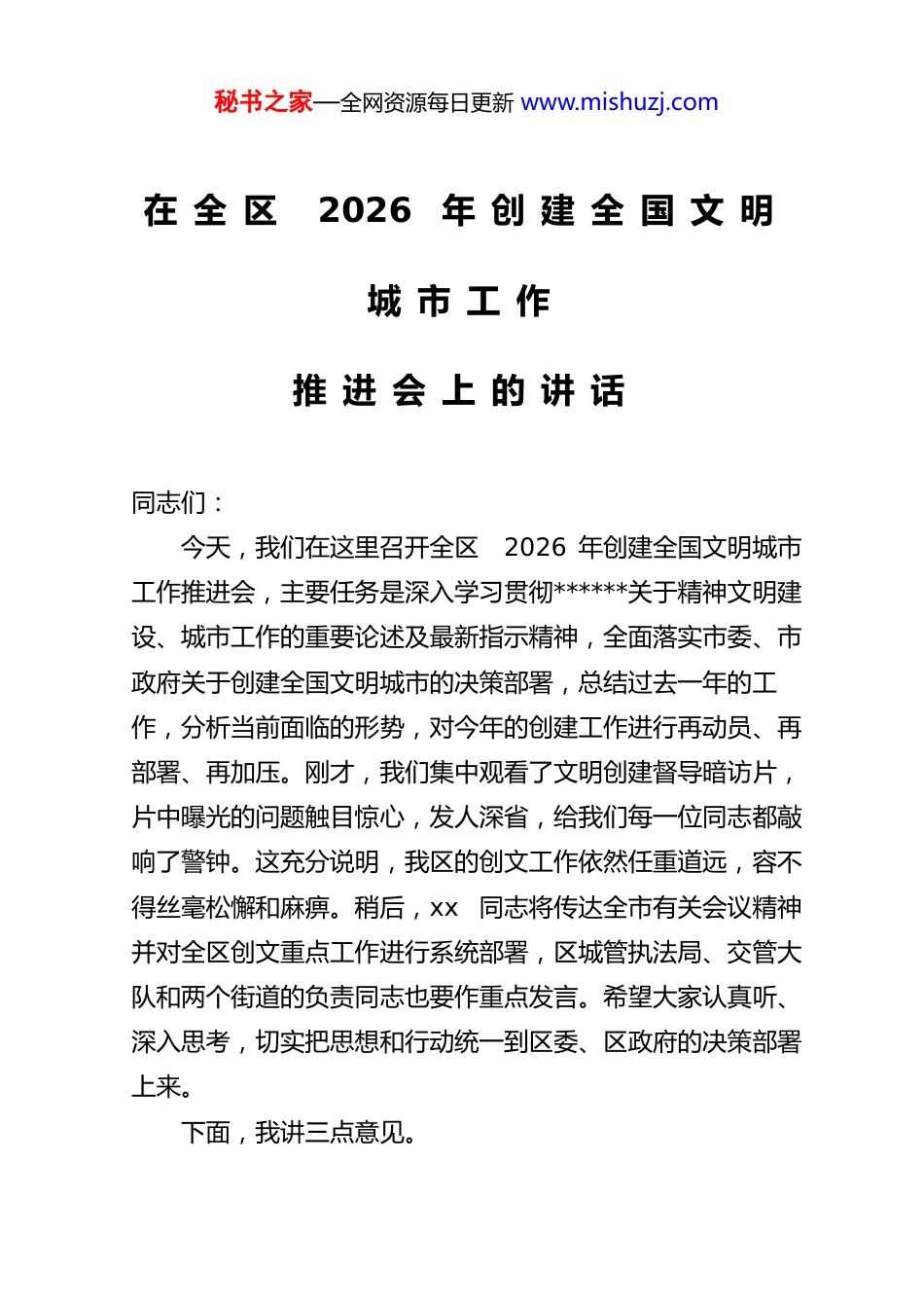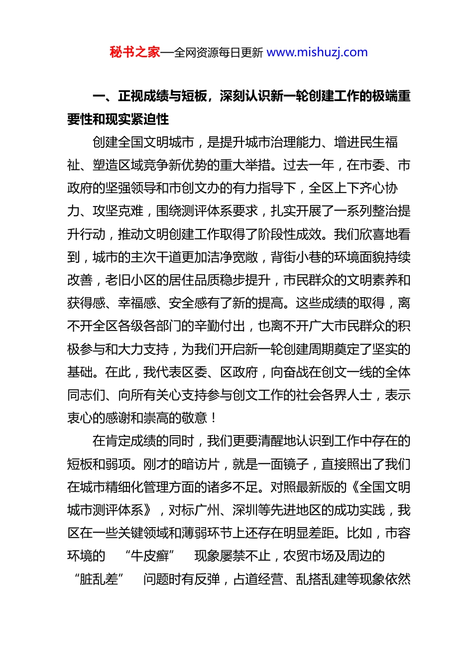 秘书之家—全网资源每日更新 www.mishuzj.com在 全 区 2026 年 创 建 全 国 文 明城 市 工 作推 进 会 上 的 讲 话同志们:今天,我们在这里召开全区 2026 年创建全国文明城市工作推进会,主要任务是深入学习贯彻******关于精神文明建设、城市工作的重要论述及最新指示精神,全面落实市委、市政府关于创建全国文明城市的决策部署,总结过去一年的工作,分析当前面临的形势,对今年的创建工作进行再动员、再部署、再加压。刚才,我们集中观看了文明创建督导暗访片,片中曝光的问题触目惊心,发人深省,给我们每一位同志都敲响了警钟。这充分说明,我区的创文工作依然任重道远,容不得丝毫松懈和麻痹。稍后,xx 同志将传达全市有关会议精神并对全区创文重点工作进行系统部署,区城管执法局、交管大队和两个街道的负责同志也要作重点发言。希望大家认真听、深入思考,切实把思想和行动统一到区委、区政府的决策部署上来。下面,我讲三点意见。秘书之家—全网资源每日更新 www.mishuzj.com一、正视成绩与短板,深刻认识新一轮创建工作的极端重要性和现实紧迫性创建全国文明城市,是提升城市治理能力、增进民生福祉、塑造区域竞争新优势的重大举措。过去一年,在市委、市政府的坚强领导和市创文办的有力指导下,全区上下齐心协力、攻坚克难,围绕测评体系要求,扎实开展了一系列整治提升行动,推动文明创建工作取得了阶段性成效。我们欣喜地看到,城市的主次干道更加洁净宽敞,背街小巷的环境面貌持续改善,老旧小区的居住品质稳步提升,市民群众的文明素养和获得感、幸福感、安全感有了新的提高。这些成绩的取得,离不开全区各级各部门的辛勤付出,也离不开广大市民群众的积极参与和大力支持,为我们开启新一轮创建周期奠定了坚实的基础。在此,我代表区委、区政府,向奋战在创文一线的全体同志们、向所有关心支持参与创文工作的社会各界人士,表示衷心的感谢和崇高的敬意!在肯定成绩的同时,我们更要清醒地认识到工作中存在的短板和弱项。刚才的暗访片,就是一面镜子,直接照出了我们在城市精细化管理方面的诸多不足。对照最新版的《全国文明城市测评体系》,对标广州、深圳等先进地区的成功实践,我区在一些关键领域和薄弱环节上还存在明显差距。比如,市容环境的 “牛皮癣” 现象屡禁不止,农贸市场及周边的 “脏乱差” 问题时有反弹,占道经营、乱搭乱建等现象依然秘书之家—全网资源每日更新 www.mishuzj.com存在;交通秩序方面,机动车乱停乱放、非机动车逆行、行人乱穿马路等不文明行为还比较普遍;基础设施方面,部分老旧小区管网老化、公共设施配套不全、停车位供给不足等问题,依然是群众反映强烈的痛点和难点。这些问题,不仅影响着城市的 “面子”,更关系到群众生活的 “里子”,是我们在新一轮创建工作中必须啃下的 “硬骨头”。同志们,2026 年是 xx 市创建第八届全国文明城市的关键之年、攻坚之年。对于我们 xx 区而言,这既是一场必须打赢的硬仗,更是一份沉甸甸的政治责任和民生答卷。(一)要从政治高度来认识。 创建全国文明城市是贯彻落实**********精神的具体行动,是推动城市高质量发展的重要抓手。我们必须提高政治站位,把创文工作作为一项严肃的政治任务,作为检验我们 “四个意识” 强不强、“两个维护” 做得好不好的试金石,以高度的政治自觉扛起主城区应有的使命担当。(二)要从发展大局来把握。 文明是城市最硬的软实力,也是最好的营商环境。一个干净整洁、文明有序的城市环境,能够有效吸引人才、集聚资本、激发活力。当前,我们正全力推进 “百县千镇万村高质量发展工程”,文明创建是其中不可或缺的重要内容。我们必须深刻认识到,创文工作 “不进则退,慢进也是退”,任何的迟疑和懈怠,都可能让我们在区域竞争中错失先机。秘书之家—全网资源每日更新 www.mishuzj.com(三)要从民生福祉来考量。 创建全国文明城市的出发点和落脚点,始终是为了人民。我们要始终坚守 “创建为民、创建惠民、创建靠民” 的根本宗旨,将创文过程变成持续改善民生、解决群众急难愁盼问题的过程,让市民群众在共建...