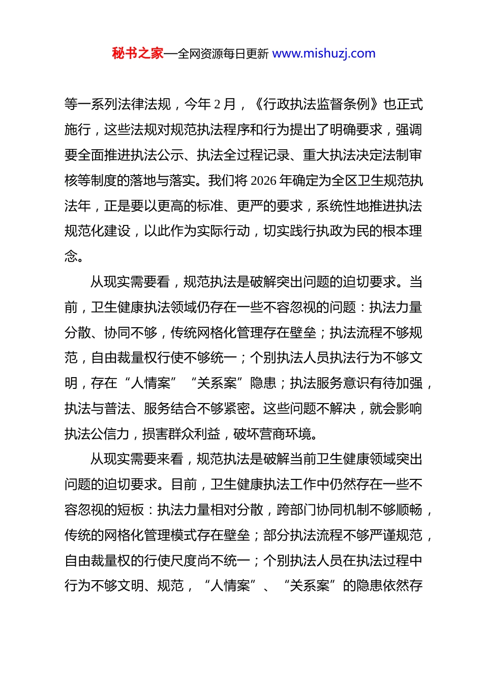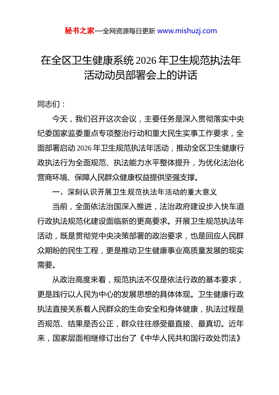 秘书之家—全网资源每日更新 www.mishuzj.com在全区卫生健康系统 2026 年卫生规范执法年活动动员部署会上的讲话 同志们:今天,我们召开这次会议,主要任务是深入贯彻落实中央纪委国家监委重点专项整治行动和重大民生实事工作要求,全面部署启动 2026 年卫生规范执法年活动,推动全区卫生健康行政执法行为全面规范、执法能力水平整体提升,为优化法治化营商环境、保障人民群众健康权益提供坚强支撑。一、深刻认识开展卫生规范执法年活动的重大意义当前,全面依法治国深入推进,法治政府建设步入快车道行政执法规范化建设面临新的更高要求。开展卫生规范执法年活动,既是贯彻党中央决策部署的政治要求,也是回应人民群众期盼的民生工程,更是推动卫生健康事业高质量发展的现实需要。从政治高度来看,规范执法不仅是依法行政的基本要求,更是践行以人民为中心的发展思想的具体体现。卫生健康行政执法直接关系着人民群众的生命安全和身体健康,执法过程是否规范、结果是否公正,群众往往感受最直接、最真切。近年来,国家层面相继修订出台了《中华人民共和国行政处罚法》秘书之家—全网资源每日更新 www.mishuzj.com等一系列法律法规,今年 2 月,《行政执法监督条例》也正式施行,这些法规对规范执法程序和行为提出了明确要求,强调要全面推进执法公示、执法全过程记录、重大执法决定法制审核等制度的落地与落实。我们将 2026 年确定为全区卫生规范执法年,正是要以更高的标准、更严的要求,系统性地推进执法规范化建设,以此作为实际行动,切实践行执政为民的根本理念。从现实需要看,规范执法是破解突出问题的迫切要求。当前,卫生健康执法领域仍存在一些不容忽视的问题:执法力量分散、协同不够,传统网格化管理存在壁垒;执法流程不够规范,自由裁量权行使不够统一;个别执法人员执法行为不够文明,存在“人情案”“关系案”隐患;执法服务意识有待加强,执法与普法、服务结合不够紧密。这些问题不解决,就会影响执法公信力,损害群众利益,破坏营商环境。从现实需要来看,规范执法是破解当前卫生健康领域突出问题的迫切要求。目前,卫生健康执法工作中仍然存在一些不容忽视的短板:执法力量相对分散,跨部门协同机制不够顺畅,传统的网格化管理模式存在壁垒;部分执法流程不够严谨规范,自由裁量权的行使尺度尚不统一;个别执法人员在执法过程中行为不够文明、规范,“人情案”、“关系案”的隐患依然存秘书之家—全网资源每日更新 www.mishuzj.com在;同时,执法中的服务意识有待提升,执法与普法教育、主动服务的结合还不够紧密。这些问题如果得不到有效解决,必将侵蚀执法公信力,损害人民群众的切身利益,并对营商环境造成负面影响。从发展要求看,规范执法是优化法治化营商环境的重要举措。法治是最好的营商环境。规范涉企执法行为,是激发市场主体活力、促进经济高质量发展的关键环节。当前,全区上下正在深入推进优化营商环境工作,卫生健康执法作为涉及市场主体众多、与群众生活密切相关的领域,理应在规范执法、服务发展方面走在前列、作出表率。从发展要求来看,规范执法是持续优化法治化营商环境的重要举措。法治本身就是最好的营商环境。规范涉企执法行为,是有效激发市场主体内生动力、促进经济高质量发展的关键环节。当前,全区上下正深入推进优化营商环境各项工作,卫生健康执法工作涉及市场主体众多、与群众日常生活联系紧密,理应在此过程中主动担当,在规范执法行为、提升服务效能、服务发展大局方面走在前列、作出表率。二、准确把握卫生规范执法年活动的主要任务根据会议印发的《实施方案》,本次活动的总体要求是聚焦突出问题、创新管理模式、完善工作机制,推动卫生健康执秘书之家—全网资源每日更新 www.mishuzj.com法全面升级。重点抓好以下三个方面工作。第一,建强执法队伍,重塑工作机制。一要打破传统网格化壁垒,组建综合执法队伍,实行统一调配、协同作战,解决力量分散、各自为战的问题,形成执法合力。二要严格落实“扫码入企”制度,实现执法全流程留痕、闭环管理。执法人员进入企业开展检查,必须先扫码登记、亮证执法,检查过...