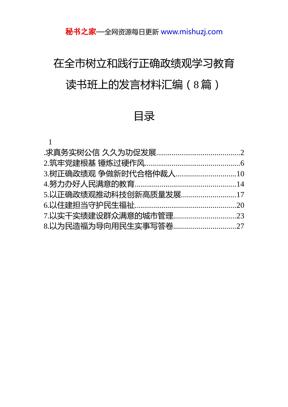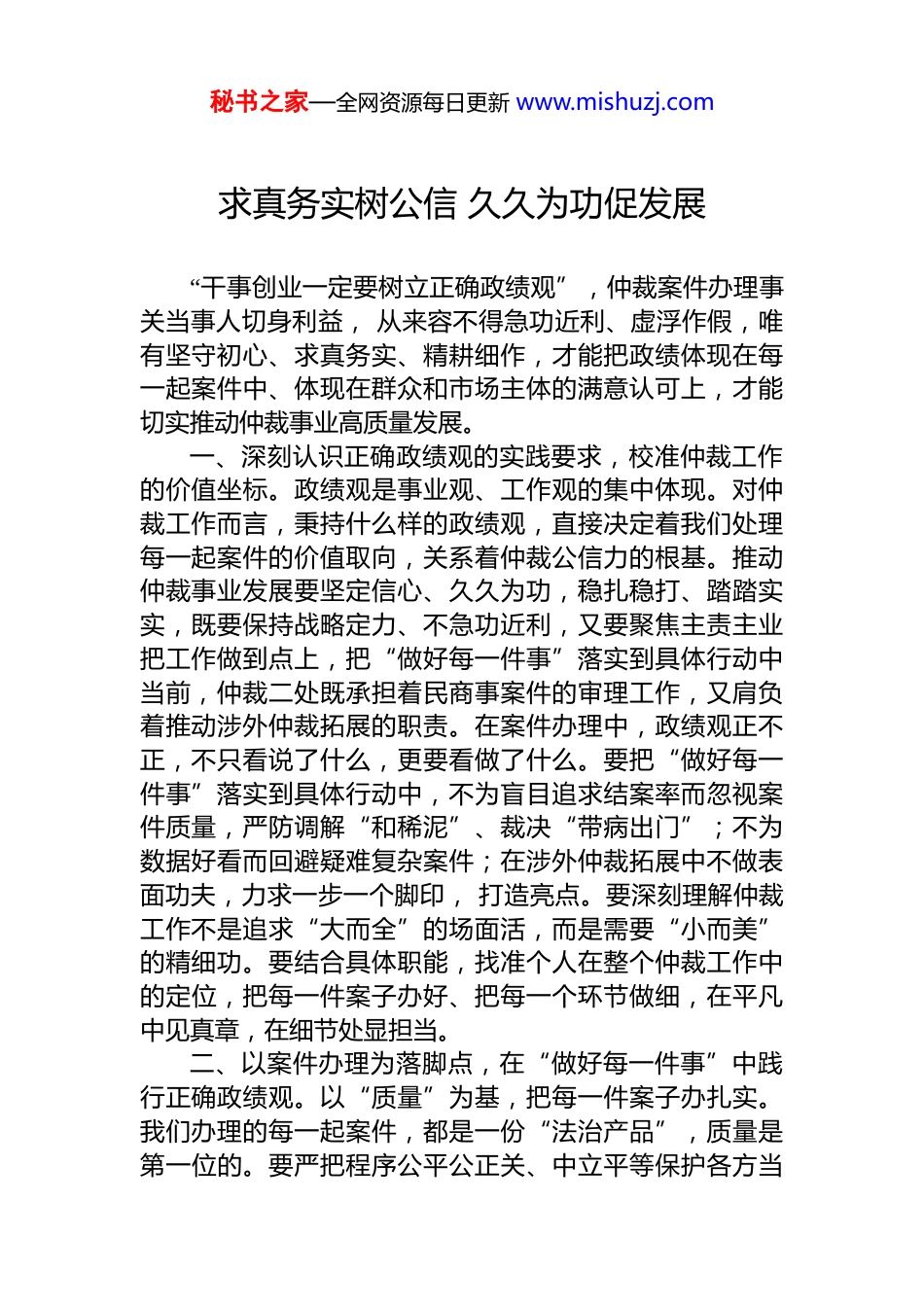 秘书之家—全网资源每日更新 www.mishuzj.com在全市树立和践行正确政绩观学习教育读书班上的发言材料汇编(8 篇)目录1.求真务实树公信 久久为功促发展...........................................22.筑牢党建根基 锤炼过硬作风.................................................63.树正确政绩观 争做新时代合格仲裁人...............................104.努力办好人民满意的教育....................................................145.以正确政绩观推动科技创新高质量发展............................176.以住建担当守护民生福祉....................................................207.以实干实绩建设群众满意的城市管理................................238.以为民造福为导向用民生实事写答卷................................27秘书之家—全网资源每日更新 www.mishuzj.com求真务实树公信 久久为功促发展“干事创业一定要树立正确政绩观”,仲裁案件办理事关当事人切身利益, 从来容不得急功近利、虚浮作假,唯有坚守初心、求真务实、精耕细作,才能把政绩体现在每一起案件中、体现在群众和市场主体的满意认可上,才能切实推动仲裁事业高质量发展。一、深刻认识正确政绩观的实践要求,校准仲裁工作的价值坐标。政绩观是事业观、工作观的集中体现。对仲裁工作而言,秉持什么样的政绩观,直接决定着我们处理每一起案件的价值取向,关系着仲裁公信力的根基。推动仲裁事业发展要坚定信心、久久为功,稳扎稳打、踏踏实实,既要保持战略定力、不急功近利,又要聚焦主责主业把工作做到点上,把“做好每一件事”落实到具体行动中当前,仲裁二处既承担着民商事案件的审理工作,又肩负着推动涉外仲裁拓展的职责。在案件办理中,政绩观正不正,不只看说了什么,更要看做了什么。要把“做好每一件事”落实到具体行动中,不为盲目追求结案率而忽视案件质量,严防调解“和稀泥”、裁决“带病出门”;不为数据好看而回避疑难复杂案件;在涉外仲裁拓展中不做表面功夫,力求一步一个脚印, 打造亮点。要深刻理解仲裁工作不是追求“大而全”的场面活,而是需要“小而美”的精细功。要结合具体职能,找准个人在整个仲裁工作中的定位,把每一件案子办好、把每一个环节做细,在平凡中见真章,在细节处显担当。二、以案件办理为落脚点,在“做好每一件事”中践行正确政绩观。以“质量”为基,把每一件案子办扎实。我们办理的每一起案件,都是一份“法治产品”,质量是第一位的。要严把程序公平公正关、中立平等保护各方当秘书之家—全网资源每日更新 www.mishuzj.com事人的合法权益。要严格依法核阅,避免没有深入阅卷、没有充分听取意见、没有深入探讨研究,就匆忙下结论,确保案件核阅建议和有关判断经得起推敲,力促裁决结果公平公正。特别在处理涉及民生、涉及弱势群体、涉及新业态新模式等复杂敏感案件时,更要审慎权衡。要建立健全案件质量管控体系,严格落实专家咨询等制度,加强对重大疑难复杂案件的研究论证。避免片面追求效率、轻率下定论而导致实体或程序出错,损害当事人利益,侵蚀仲裁公信力。以“效率”为要,把每一个环节做精细。效率的提升,关键就在于把每一个环节做实、做细、做到位。近期,仲裁二处围绕案件审理中的关键节点,进一步完善庭前程序指引,明确庭前审理措施的具体要求,把功夫下在庭审之前;完善在线视频开庭程序指引,针对线上审理的特点,细化身份核验、证据展示、庭审秩序维护等操作规范;配合仲裁一处完善裁决期限管理规范,加强立案、组庭、开庭、合议、裁决等各环节时间节点动态跟踪和预警提醒,防止无故拖延。力求将政绩体现在当事人对仲裁程序的满意度上,体现在每一个环节的精细运转上。三、以服务大局为使命,在涉外仲裁中找准定位、做出特色。在当下主动有所作为。主动靠前服务,针对企业“走出去”过程中常见的合同争议,依托 xx 自贸片区和上合示范区政策优势,打造服务亮点,帮助企业提升风险防范意识和争议应对能力。要以案件办理为抓手,在每一个涉外案件中精准把握国际条约、国际惯例的适用,尊重当事人意思自治,注重积累涉外...