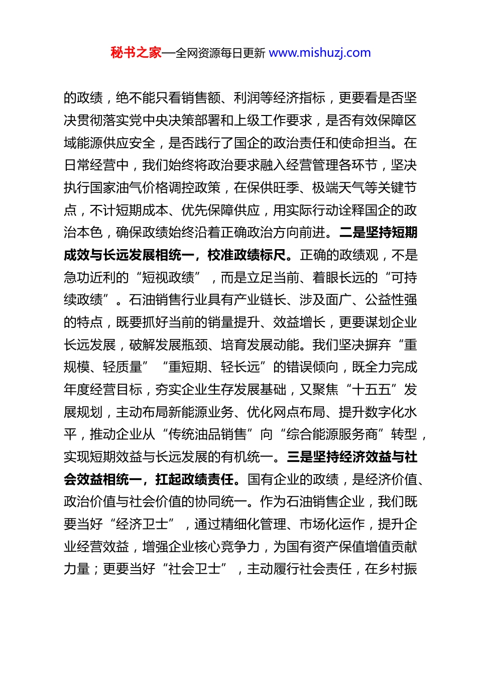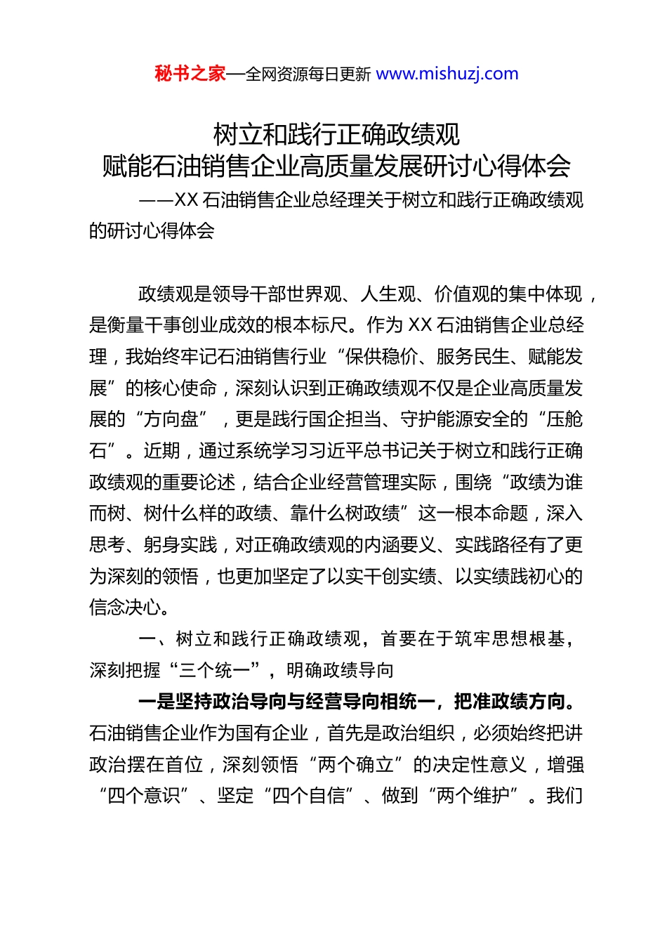 秘书之家—全网资源每日更新 www.mishuzj.com树立和践行正确政绩观赋能石油销售企业高质量发展研讨心得体会——XX 石油销售企业总经理关于树立和践行正确政绩观的研讨心得体会政绩观是领导干部世界观、人生观、价值观的集中体现,是衡量干事创业成效的根本标尺。作为 XX 石油销售企业总经理,我始终牢记石油销售行业“保供稳价、服务民生、赋能发展”的核心使命,深刻认识到正确政绩观不仅是企业高质量发展的“方向盘”,更是践行国企担当、守护能源安全的“压舱石”。近期,通过系统学习习近平总书记关于树立和践行正确政绩观的重要论述,结合企业经营管理实际,围绕“政绩为谁而树、树什么样的政绩、靠什么树政绩”这一根本命题,深入思考、躬身实践,对正确政绩观的内涵要义、实践路径有了更为深刻的领悟,也更加坚定了以实干创实绩、以实绩践初心的信念决心。一、树立和践行正确政绩观,首要在于筑牢思想根基,深刻把握“三个统一”,明确政绩导向一是坚持政治导向与经营导向相统一,把准政绩方向。石油销售企业作为国有企业,首先是政治组织,必须始终把讲政治摆在首位,深刻领悟“两个确立”的决定性意义,增强“四个意识”、坚定“四个自信”、做到“两个维护”。我们秘书之家—全网资源每日更新 www.mishuzj.com的政绩,绝不能只看销售额、利润等经济指标,更要看是否坚决贯彻落实党中央决策部署和上级工作要求,是否有效保障区域能源供应安全,是否践行了国企的政治责任和使命担当。在日常经营中,我们始终将政治要求融入经营管理各环节,坚决执行国家油气价格调控政策,在保供旺季、极端天气等关键节点,不计短期成本、优先保障供应,用实际行动诠释国企的政治本色,确保政绩始终沿着正确政治方向前进。二是坚持短期成效与长远发展相统一,校准政绩标尺。正确的政绩观,不是急功近利的“短视政绩”,而是立足当前、着眼长远的“可持续政绩”。石油销售行业具有产业链长、涉及面广、公益性强的特点,既要抓好当前的销量提升、效益增长,更要谋划企业长远发展,破解发展瓶颈、培育发展动能。我们坚决摒弃“重规模、轻质量”“重短期、轻长远”的错误倾向,既全力完成年度经营目标,夯实企业生存发展基础,又聚焦“十五五”发展规划,主动布局新能源业务、优化网点布局、提升数字化水平,推动企业从“传统油品销售”向“综合能源服务商”转型,实现短期效益与长远发展的有机统一。三是坚持经济效益与社会效益相统一,扛起政绩责任。国有企业的政绩,是经济价值、政治价值与社会价值的协同统一。作为石油销售企业,我们既要当好“经济卫士”,通过精细化管理、市场化运作,提升企业经营效益,增强企业核心竞争力,为国有资产保值增值贡献力量;更要当好“社会卫士”,主动履行社会责任,在乡村振秘书之家—全网资源每日更新 www.mishuzj.com兴、公益帮扶、生态环保、应急保供等方面主动作为,既要让企业发展有“厚度”,也要让民生服务有“温度”,真正做到以发展惠民生、以民生促发展。二、树立和践行正确政绩观,核心在于聚焦主责主业,深耕“四个发力”,彰显政绩实效。作为企业经营管理的“领头人”,我始终坚持把正确政绩观融入经营管理全过程,以实干破解难题、以实绩诠释担当,推动各项工作落地见效。一是在提质增效上发力,筑牢经营发展根基。提质增效是企业生存发展的永恒课题,也是践行正确政绩观的重要体现。我们坚持“精准施策、精细管理”,一方面优化油品进销存管理,精准研判市场走势,合理调控库存,降低物流运输成本,提升资金使用效率,实现“降本、增效、控险”三位一体;另一方面聚焦非油业务提质,优化非油商品结构,打造特色服务场景,推动“油品+非油”协同发展,培育新的利润增长点。同时,强化全员成本意识,健全成本管控体系,将成本管控责任落实到每个岗位、每个环节,坚决杜绝铺张浪费、粗放经营,以精细化管理提升经营质效,让每一分投入都产生实实在在的效益。二是在改革创新上发力,激活企业发展动能。创新是引领发展的第一动力,也是打破发展瓶颈、实现高质量发展的关键。我们坚决摒弃墨守成规、安于现状的思维定式,以正确政绩观引领...