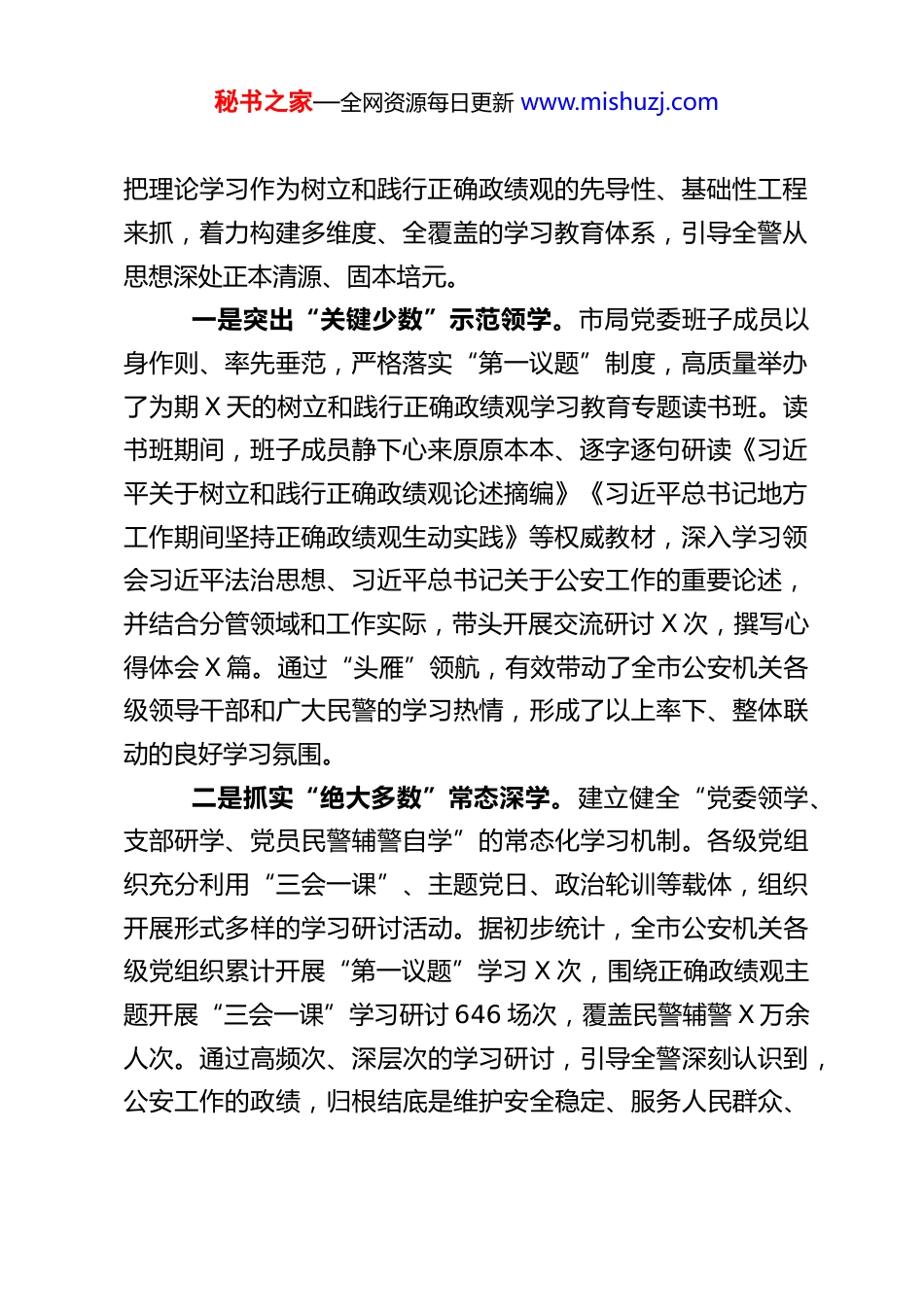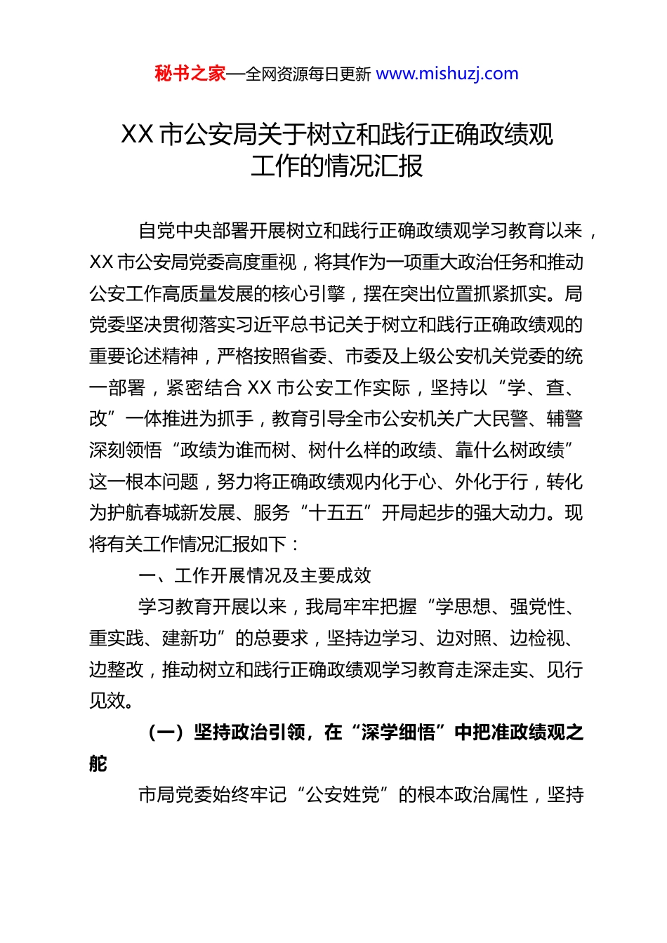 秘书之家—全网资源每日更新 www.mishuzj.comXX 市公安局关于树立和践行正确政绩观工作的情况汇报自党中央部署开展树立和践行正确政绩观学习教育以来,XX 市公安局党委高度重视,将其作为一项重大政治任务和推动公安工作高质量发展的核心引擎,摆在突出位置抓紧抓实。局党委坚决贯彻落实习近平总书记关于树立和践行正确政绩观的重要论述精神,严格按照省委、市委及上级公安机关党委的统一部署,紧密结合 XX 市公安工作实际,坚持以“学、查、改”一体推进为抓手,教育引导全市公安机关广大民警、辅警深刻领悟“政绩为谁而树、树什么样的政绩、靠什么树政绩”这一根本问题,努力将正确政绩观内化于心、外化于行,转化为护航春城新发展、服务“十五五”开局起步的强大动力。现将有关工作情况汇报如下:一、工作开展情况及主要成效学习教育开展以来,我局牢牢把握“学思想、强党性、重实践、建新功”的总要求,坚持边学习、边对照、边检视、边整改,推动树立和践行正确政绩观学习教育走深走实、见行见效。(一)坚持政治引领,在“深学细悟”中把准政绩观之舵市局党委始终牢记“公安姓党”的根本政治属性,坚持秘书之家—全网资源每日更新 www.mishuzj.com把理论学习作为树立和践行正确政绩观的先导性、基础性工程来抓,着力构建多维度、全覆盖的学习教育体系,引导全警从思想深处正本清源、固本培元。一是突出“关键少数”示范领学。市局党委班子成员以身作则、率先垂范,严格落实“第一议题”制度,高质量举办了为期 X 天的树立和践行正确政绩观学习教育专题读书班。读书班期间,班子成员静下心来原原本本、逐字逐句研读《习近平关于树立和践行正确政绩观论述摘编》《习近平总书记地方工作期间坚持正确政绩观生动实践》等权威教材,深入学习领会习近平法治思想、习近平总书记关于公安工作的重要论述,并结合分管领域和工作实际,带头开展交流研讨 X 次,撰写心得体会 X 篇。通过“头雁”领航,有效带动了全市公安机关各级领导干部和广大民警的学习热情,形成了以上率下、整体联动的良好学习氛围。二是抓实“绝大多数”常态深学。建立健全“党委领学、支部研学、党员民警辅警自学”的常态化学习机制。各级党组织充分利用“三会一课”、主题党日、政治轮训等载体,组织开展形式多样的学习研讨活动。据初步统计,全市公安机关各级党组织累计开展“第一议题”学习 X 次,围绕正确政绩观主题开展“三会一课”学习研讨 646 场次,覆盖民警辅警 X 万余人次。通过高频次、深层次的学习研讨,引导全警深刻认识到,公安工作的政绩,归根结底是维护安全稳定、服务人民群众、秘书之家—全网资源每日更新 www.mishuzj.com促进公平正义的政绩,必须坚决摒弃“重打击轻防范、重显绩轻潜绩、重短期轻长远”的错误观念。三是创新“多元载体”融合促学。为增强学习的吸引力和感染力,市局积极创新学习载体。一是开设“政绩观大家谈”线上专栏。邀请功模民警、基层所队长、青年骨干结合岗位实际谈认识、谈体会、谈打算,累计发布学习心得 X 篇,营造了浓厚的讨论氛围。二是组织参观红色教育基地、观看专题警示教育片。通过正反两方面典型案例,教育引导民警知敬畏、存戒惧、守底线,深刻理解什么才是经得起实践、人民、历史检验的实绩。三是将正确政绩观教育纳入新警入警、警衔晋升、干部任职等各类培训的必修课程,从职业生涯的各个关键节点持续强化思想淬炼。通过系统深入的学习,全警进一步筑牢了信仰之基、补足了精神之钙、把稳了思想之舵,“人民公安为人民”的初心使命更加坚定,为后续查摆问题、整改落实奠定了坚实的思想基础。(二)坚持问题导向,在“刀刃向内”中检视政绩观之偏局党委坚持把发现问题、剖析问题、解决问题作为衡量学习教育成效的重要标尺,大力发扬自我革命精神,构建了“内部自查+外部纳谏+多维监督”的立体化查摆机制,力求把问题找准、把根源挖深、把清单列实。一是开门纳谏,广泛倾听民声民意。市局党委班子成员秘书之家—全网资源每日更新 www.mishuzj.com带头深入分管联系单位、基层所队、社区街道、重点企业开展“解剖麻雀”式调研 X 余次,面...