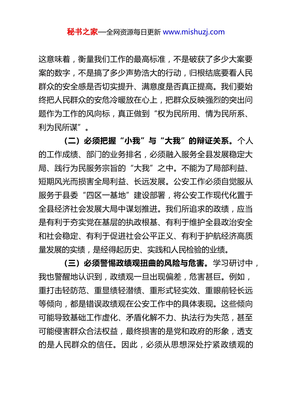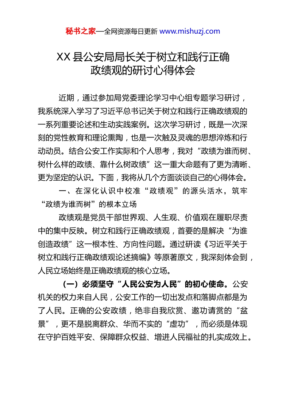 秘书之家—全网资源每日更新 www.mishuzj.comXX 县公安局局长关于树立和践行正确政绩观的研讨心得体会近期,通过参加局党委理论学习中心组专题学习研讨,我系统深入学习了习近平总书记关于树立和践行正确政绩观的一系列重要论述和生动实践案例。这次学习研讨,既是一次深刻的党性教育和理论熏陶,也是一次触及灵魂的思想淬炼和行动动员。结合公安工作实际和个人思考,我对“政绩为谁而树、树什么样的政绩、靠什么树政绩”这一重大命题有了更为清晰、更为坚定的认识。下面,我将从几个方面谈谈自己的心得体会。一、在深化认识中校准“政绩观”的源头活水,筑牢“政绩为谁而树”的根本立场政绩观是党员干部世界观、人生观、价值观在履职尽责中的集中反映。树立和践行正确政绩观,首要的是解决“为谁创造政绩”这一根本性、方向性问题。通过研读《习近平关于树立和践行正确政绩观论述摘编》等原著原文,我深刻体会到,人民立场始终是正确政绩观的核心立场。(一)必须坚守“人民公安为人民”的初心使命。公安机关的权力来自人民,公安工作的一切出发点和落脚点都是为了人民。正确的公安政绩,绝非自我欣赏、邀功请赏的“盆景”,更不是脱离群众、华而不实的“虚功”,而必须是体现在守护百姓平安、保障群众权益、增进人民福祉的扎实成效上。秘书之家—全网资源每日更新 www.mishuzj.com这意味着,衡量我们工作的最高标准,不是破获了多少大案要案的数字,不是搞了多少声势浩大的行动,归根结底要看人民群众的安全感是否切实提升、满意度是否真正提高。我们要始终把人民群众的安危冷暖放在心上,把群众反映强烈的突出问题作为工作的风向标,真正做到“权为民所用、情为民所系、利为民所谋”。(二)必须把握“小我”与“大我”的辩证关系。个人的工作成绩、部门的业务排名,必须融入服务全县发展稳定大局、践行为民服务宗旨的“大我”之中。不能为了局部利益、短期风光而损害全局利益、长远发展。公安工作必须自觉服从服务于县委“四区一基地”建设部署,将公安工作现代化置于全县经济社会发展大局中谋划推进。我们所追求的政绩,应当是有利于夯实党在基层的执政根基、有利于维护全县政治安全和社会稳定、有利于促进社会公平正义、有利于护航经济高质量发展的实绩,是经得起历史、实践和人民检验的业绩。(三)必须警惕政绩观扭曲的风险与危害。学习研讨中,我也警醒地认识到,政绩观一旦出现偏差,危害甚巨。例如,重打击轻防范、重显绩轻潜绩、重形式轻实效、重眼前轻长远等倾向,都是错误政绩观在公安工作中的具体表现。这些倾向可能导致基础工作虚化、矛盾化解不力、执法行为失范,甚至可能侵害群众合法权益,最终损害的是党和政府的形象,透支的是人民群众的信任。因此,必须从思想深处拧紧政绩观的秘书之家—全网资源每日更新 www.mishuzj.com“总开关”,时刻警惕和纠正任何背离初心使命的政绩冲动。二、在锚定导向中明晰“政绩观”的实践维度,把准“树什么样的政绩”的鲜明导向明确了“为谁树政绩”,接下来就要解决“树什么政绩”的问题。公安机关的主责主业是维护安全稳定,但这决不意味着政绩是单一的、片面的。结合我县公安工作实际,树立正确的政绩观,必须坚持全面、辩证、长远的眼光,处理好“显”与“潜”、“近”与“远”、“打”与“防”等多重关系。一是既要抓实“攻坚克难”的显绩,也要做深“夯基垒台”的潜绩。打击犯罪、侦破大案要案、完成重大安保任务,这些工作社会关注度高,成效显著,是公安机关必须扛起的硬责任,是“显绩”的重要组成部分。我们必须始终保持对黑恶势力、电信网络诈骗、严重暴力犯罪、盗抢骗、黄赌毒等突出违法犯罪的严打高压态势,打出声势、打出声威,切实保护人民群众生命财产安全。然而,公安工作不能止步于此。矛盾排查化解、重点人稳控、社会治安防控体系建设、基层基础工作、执法规范化建设、队伍能力素质提升等,这些工作周期长、见效慢,却是公安事业长远发展的根基,是更高层次的“潜绩”。我们必须有“功成不必在我,功成必定有我”的境界,甘于做铺垫性的工作,甘于抓未成之事,在“润物细无声”中筑牢社会长治久安的基...