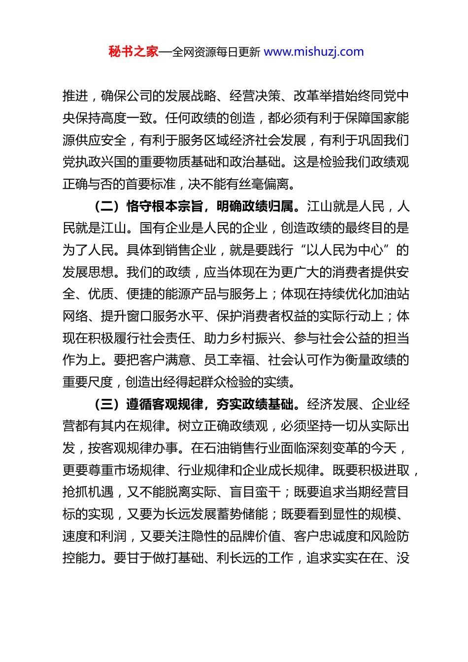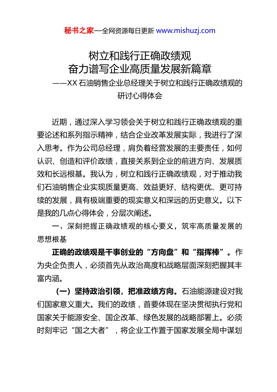 秘书之家—全网资源每日更新 www.mishuzj.com树立和践行正确政绩观奋力谱写企业高质量发展新篇章——XX 石油销售企业总经理关于树立和践行正确政绩观的研讨心得体会近期,通过深入学习领会关于树立和践行正确政绩观的重要论述和系列指示精神,结合企业改革发展实际,我进行了深入思考。作为公司总经理,肩负着经营发展的主要责任,如何认识、创造和评价政绩,直接关系到企业的前进方向、发展质效和长远根基。我认为,树立和践行正确政绩观,对于推动我们石油销售企业实现质量更高、效益更好、结构更优、更可持续的发展,具有极端重要的现实意义和深远的历史意义。以下是我的几点心得体会,分层次阐述。一、深刻把握正确政绩观的核心要义,筑牢高质量发展的思想根基正确的政绩观是干事创业的“方向盘”和“指挥棒”。作为央企负责人,必须首先从政治高度和战略层面深刻把握其丰富内涵。(一)坚持政治引领,把准政绩方向。石油能源建设对我们国家意义重大。我们的政绩,首要体现在坚决贯彻执行党和国家关于能源安全、国企改革、绿色发展的战略部署上。必须时刻牢记“国之大者”,将企业工作置于国家发展全局中谋划秘书之家—全网资源每日更新 www.mishuzj.com推进,确保公司的发展战略、经营决策、改革举措始终同党中央保持高度一致。任何政绩的创造,都必须有利于保障国家能源供应安全,有利于服务区域经济社会发展,有利于巩固我们党执政兴国的重要物质基础和政治基础。这是检验我们政绩观正确与否的首要标准,决不能有丝毫偏离。(二)恪守根本宗旨,明确政绩归属。江山就是人民,人民就是江山。国有企业是人民的企业,创造政绩的最终目的是为了人民。具体到销售企业,就是要践行“以人民为中心”的发展思想。我们的政绩,应当体现在为更广大的消费者提供安全、优质、便捷的能源产品与服务上;体现在持续优化加油站网络、提升窗口服务水平、保护消费者权益的实际行动上;体现在积极履行社会责任、助力乡村振兴、参与社会公益的担当作为上。要把客户满意、员工幸福、社会认可作为衡量政绩的重要尺度,创造出经得起群众检验的实绩。(三)遵循客观规律,夯实政绩基础。经济发展、企业经营都有其内在规律。树立正确政绩观,必须坚持一切从实际出发,按客观规律办事。在石油销售行业面临深刻变革的今天,更要尊重市场规律、行业规律和企业成长规律。既要积极进取,抢抓机遇,又不能脱离实际、盲目蛮干;既要追求当期经营目标的实现,又要为长远发展蓄势储能;既要看到显性的规模、速度和利润,又要关注隐性的品牌价值、客户忠诚度和风险防控能力。要甘于做打基础、利长远的工作,追求实实在在、没秘书之家—全网资源每日更新 www.mishuzj.com有水分的发展。二、清醒审视政绩观上可能存在的偏差,增强整改提升的行动自觉对照正确政绩观的要求,反思我们以往的工作,在某些方面、某种程度上,可能还存在一些认识或实践上的偏差,需要高度警惕并切实加以纠正。(一)克服“重显绩轻潜绩”的倾向。销售企业业绩直观,易导致对容易看得见的销量、利润、网点数量等“显绩”关注多,而对需要久久为功的体系建设、人才培养、技术储备、管理提升、品牌塑造、安全文化培育等“潜绩”投入精力不足。这种倾向可能使企业缺乏持续发展的后劲,在长期竞争中处于不利地位。必须树立“十年树木,百年树人”的政绩观,像重视经营指标一样重视基础管理,像抓当期促销一样抓长期能力建设。(二)纠正“重速度轻质量”的偏向。在激烈的市场竞争中,有时为了追求规模扩张和市场占有率,可能不自觉地过于看重发展速度,而对发展的质量和效益关注不够。比如,可能忽视单站创效能力、忽视投资回报周期、忽视非油业务质量、忽视安全环保的刚性约束。高质量发展是新时代的硬道理。必须彻底扭转单纯追求速度和规模的惯性思维,把发展的着力点放到提升全要素生产率、优化业务结构、推动效率变革上来,实现更高质量、更有效率、更可持续的发展。秘书之家—全网资源每日更新 www.mishuzj.com(三)防范“重当前轻长远”的短视。任期考核压力有时可能导致过于关注任期内可完成的、能立竿见影的项目和指标,而对那...