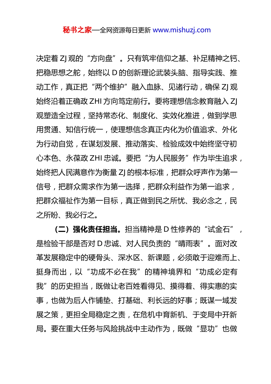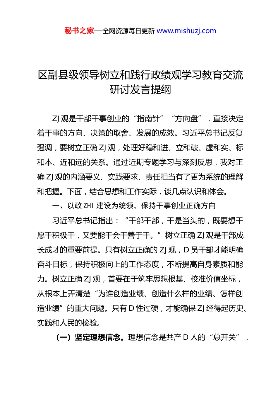 秘书之家—全网资源每日更新 www.mishuzj.com区副县级领导树立和践行政绩观学习教育交流研讨发言提纲ZJ 观是干部干事创业的“指南针”“方向盘”,直接决定着干事的方向、决策的取舍、发展的成效。习近平总书记反复强调,要树立正确 ZJ 观,处理好稳和进、立和破、虚和实、标和本、近和远的关系。通过近期专题学习与深刻反思,我对正确 ZJ 观的内涵要义、实践要求、责任担当有了更为系统的理解和把握。下面,结合思想和工作实际,谈几点认识和体会。一、以政 ZHI 建设为统领,保持干事创业正确方向习近平总书记指出:“干部干部,干是当头的,既要想干愿干积极干,又要能干会干善于干。”树立正确 ZJ 观是干部成长成才的重要前提。只有树立正确的 ZJ 观,D 员干部才能明确奋斗目标,保持积极向上的工作态度,不断提高自身素质和能力。树立正确 ZJ 观,首要在于筑牢思想根基、校准价值坐标,从根本上弄清楚“为谁创造业绩、创造什么样的业绩、怎样创造业绩”的重大问题。只有 D 性过硬,才能确保 ZJ 经得起历史、实践和人民的检验。(一)坚定理想信念。理想信念是共产 D 人的“总开关”,秘书之家—全网资源每日更新 www.mishuzj.com决定着 ZJ 观的“方向盘”。只有筑牢信仰之基、补足精神之钙、把稳思想之舵,始终以 D 的创新理论武装头脑、指导实践、推动工作,真正把“两个维护”融入血脉、见诸行动,确保 ZJ 观始终沿着正确政 ZHI 方向笃定前行。要将理想信念教育融入 ZJ观塑造全过程,坚持常态化、制度化、实效化推进,做到学思用贯通、知信行统一,使理想信念真正内化为价值追求、外化为行动自觉,在谋划发展、推动落实、检验成效中始终坚守初心本色、永葆政 ZHI 忠诚。要把“为人民服务”作为毕生追求,始终把人民满意作为衡量 ZJ 的根本标准,把群众呼声作为第一信号,把群众需求作为第一选择,把群众利益作为第一追求,把群众福祉作为第一目标,真正做到民之所忧、我必念之,民之所盼、我必行之。(二)强化责任担当。担当精神是 D 性修养的“试金石”,是检验干部是否对 D 忠诚、对人民负责的“晴雨表”。面对改革发展稳定中的硬骨头、深水区、新课题,必须敢于迎难而上、挺身而出,以“功成不必在我”的精神境界和“功成必定有我”的历史担当,既做让老百姓看得见、摸得着、得实惠的实事,也做为后人作铺垫、打基础、利长远的好事;既谋一域发展之策,更担全局稳定之责,在危机中育新机、于变局中开新局。要在重大任务与风险挑战中主动作为,既做“显功”也做秘书之家—全网资源每日更新 www.mishuzj.com“潜功”,更要甘当“铺路石”、勇做“栽树人”,以“钉钉子”精神一锤接着一锤敲,以“滴水穿石”韧劲一任接着一任干,把每一项工作都落到为民造福的实处、谋到高质量发展的关键处、守到清正廉洁的底线处。(三)严守纪律规矩。“清廉是福、贪欲是祸”,习近平总书记以“打铁必须自身硬”的要求,为 D 员干部划定了底线。必须把纪律规矩挺在前面,时刻自重自省、自警自励,慎独慎微、慎始慎终,始终做到心有所畏、言有所戒、行有所止。要严守政 ZHI 纪律和政 ZHI 规矩,坚决防止“七个有之”,做到“五个必须”,在大是大非面前旗帜鲜明,在风浪考验面前无所畏惧,在各种诱惑面前立场坚定。只有清正廉洁,才能赢得群众真心拥护,确保 ZJ“干净可信”,必须坚持把“干净”与“干事”统一起来,既在廉洁自律上作表率,更在担当作为上当先锋;既严防“不作为”的懒政怠政,也力戒“乱作为”的任性妄为,始终以敬畏之心对待权力、以审慎之态行使权力、以公仆之情用好权力,真正让清廉成为 ZJ 最坚实的底色、最厚重的成色。二、以人民立场为根本,保持一心为民公仆本色江山就是人民,人民就是江山。为民造福是正确 ZJ 观的本质要求,也是一切工作的出发点和落脚点。践行正确 ZJ 观,必秘书之家—全网资源每日更新 www.mishuzj.com须始终站稳人民立场,把群众的急难愁盼放在心上、抓在手上,把群众满意不满意、高兴不高兴、答应不答应作为衡量工作成效的根本标准。聚焦群众急难愁盼,紧盯就业、教育、医疗、养老、...