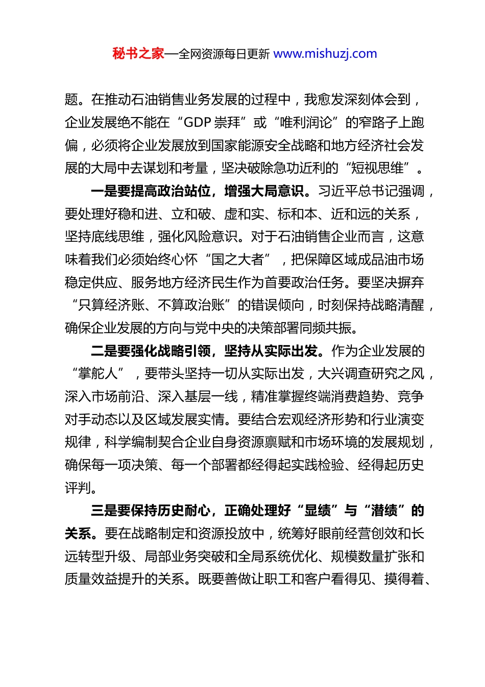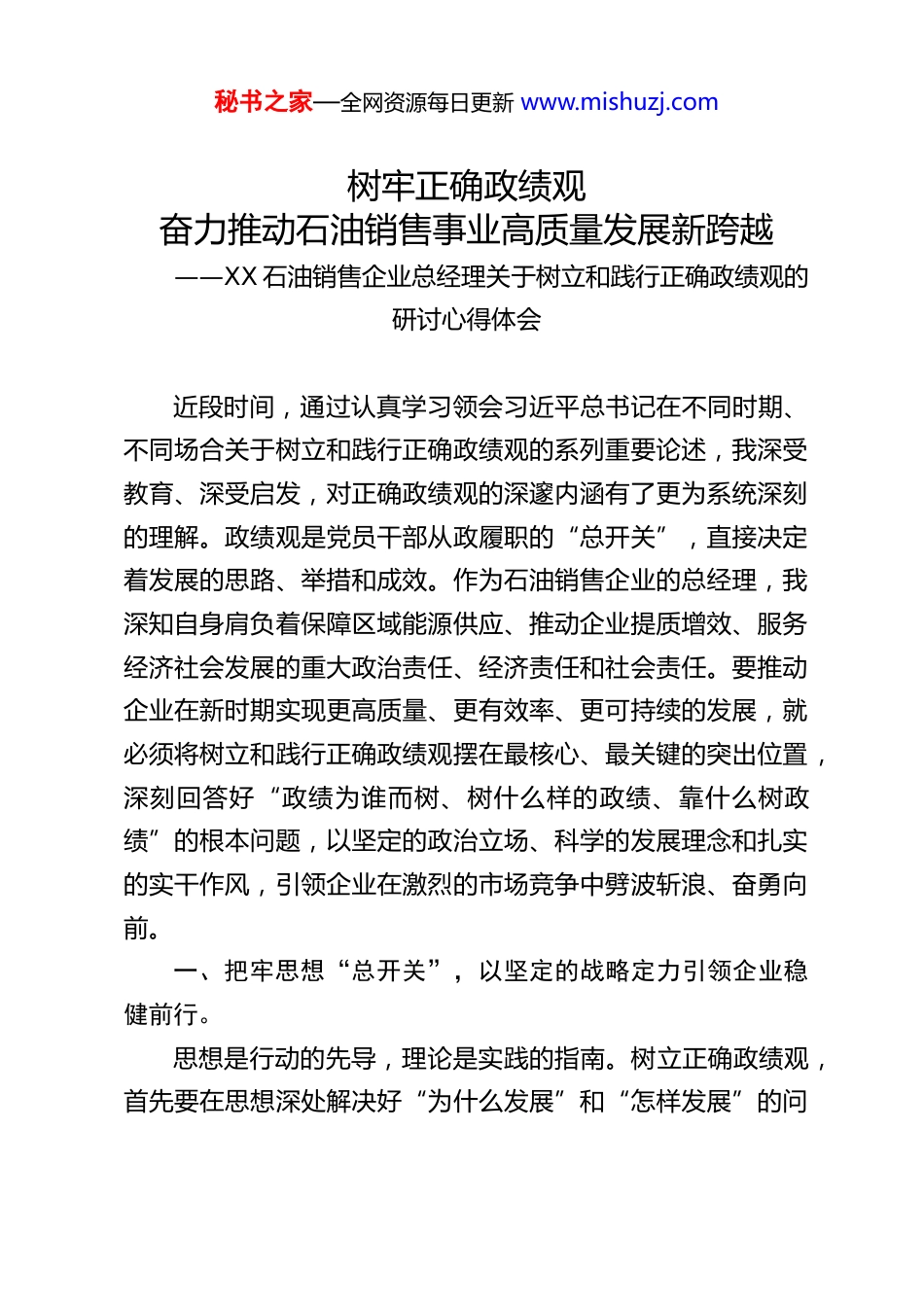 秘书之家—全网资源每日更新 www.mishuzj.com树牢正确政绩观奋力推动石油销售事业高质量发展新跨越——XX 石油销售企业总经理关于树立和践行正确政绩观的研讨心得体会近段时间,通过认真学习领会习近平总书记在不同时期、不同场合关于树立和践行正确政绩观的系列重要论述,我深受教育、深受启发,对正确政绩观的深邃内涵有了更为系统深刻的理解。政绩观是党员干部从政履职的“总开关”,直接决定着发展的思路、举措和成效。作为石油销售企业的总经理,我深知自身肩负着保障区域能源供应、推动企业提质增效、服务经济社会发展的重大政治责任、经济责任和社会责任。要推动企业在新时期实现更高质量、更有效率、更可持续的发展,就必须将树立和践行正确政绩观摆在最核心、最关键的突出位置,深刻回答好“政绩为谁而树、树什么样的政绩、靠什么树政绩”的根本问题,以坚定的政治立场、科学的发展理念和扎实的实干作风,引领企业在激烈的市场竞争中劈波斩浪、奋勇向前。一、把牢思想“总开关”,以坚定的战略定力引领企业稳健前行。思想是行动的先导,理论是实践的指南。树立正确政绩观,首先要在思想深处解决好“为什么发展”和“怎样发展”的问秘书之家—全网资源每日更新 www.mishuzj.com题。在推动石油销售业务发展的过程中,我愈发深刻体会到,企业发展绝不能在“GDP 崇拜”或“唯利润论”的窄路子上跑偏,必须将企业发展放到国家能源安全战略和地方经济社会发展的大局中去谋划和考量,坚决破除急功近利的“短视思维”。一是要提高政治站位,增强大局意识。习近平总书记强调,要处理好稳和进、立和破、虚和实、标和本、近和远的关系,坚持底线思维,强化风险意识。对于石油销售企业而言,这意味着我们必须始终心怀“国之大者”,把保障区域成品油市场稳定供应、服务地方经济民生作为首要政治任务。要坚决摒弃“只算经济账、不算政治账”的错误倾向,时刻保持战略清醒,确保企业发展的方向与党中央的决策部署同频共振。二是要强化战略引领,坚持从实际出发。作为企业发展的“掌舵人”,要带头坚持一切从实际出发,大兴调查研究之风,深入市场前沿、深入基层一线,精准掌握终端消费趋势、竞争对手动态以及区域发展实情。要结合宏观经济形势和行业演变规律,科学编制契合企业自身资源禀赋和市场环境的发展规划,确保每一项决策、每一个部署都经得起实践检验、经得起历史评判。三是要保持历史耐心,正确处理好“显绩”与“潜绩”的关系。要在战略制定和资源投放中,统筹好眼前经营创效和长远转型升级、局部业务突破和全局系统优化、规模数量扩张和质量效益提升的关系。既要善做让职工和客户看得见、摸得着、秘书之家—全网资源每日更新 www.mishuzj.com得实惠的“显功”,又要甘于做打基础、增后劲、利长远的“潜功”,涵养“功成不必在我”的精神境界,以“一张蓝图绘到底”的决心,一步一个脚印推进企业转型升级。二、找准发展“压舱石”,以科学的高效统筹驱动经营提质增效。对于石油销售企业而言,创造实实在在的经济效益、实现国有资产的保值增值是树政绩的重要体现。但真正的效益绝不是靠粗放扩张和急功近利刷出来的“数字泡沫”,而是源于对市场规律和发展规律的深刻把握。作为总经理,我深刻认识到,必须牢牢守住主责主业,以精益求精的管理和科学的经营统筹来提升发展质效。一是要坚决扛起能源保供的政治担当,稳固主业基本盘。油气销售是石油销售企业的立身之本。我们要紧紧围绕集团公司的战略部署,千方百计开拓市场、稳固份额,把守牢油气销售基本盘作为履职尽责的核心要务。要不断强化资源统筹与精准调配能力,构建高效的现代物流体系,全力确保炼厂生产后路畅通和区域终端资源稳定供应,以强大韧性的产业链支撑彰显能源央企的政治担当。二是要加速推进转型升级,积极培育新质生产力。面对“双碳”目标引领下的能源转型浪潮,企业的发展不能固步自封、止步不前。要敏锐洞察行业“危”与“机”,主动顺应绿色低碳发展趋势,积极布局“油、气、氢、电、服”综合能源秘书之家—全网资源每日更新 www.mishuzj.com服务体系建设,加大对充电桩、光伏发电、LNG 加气网络以...