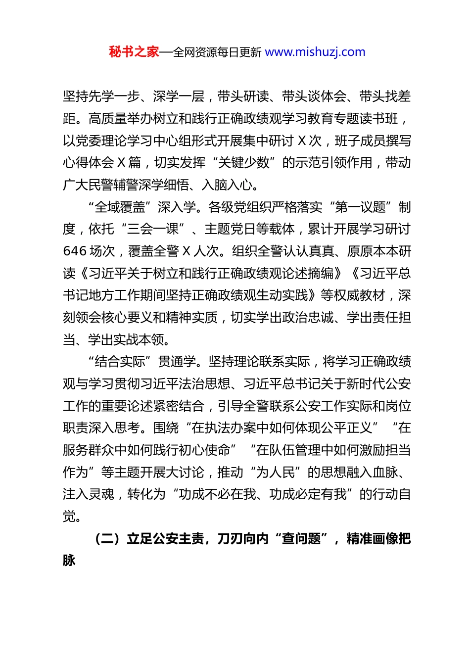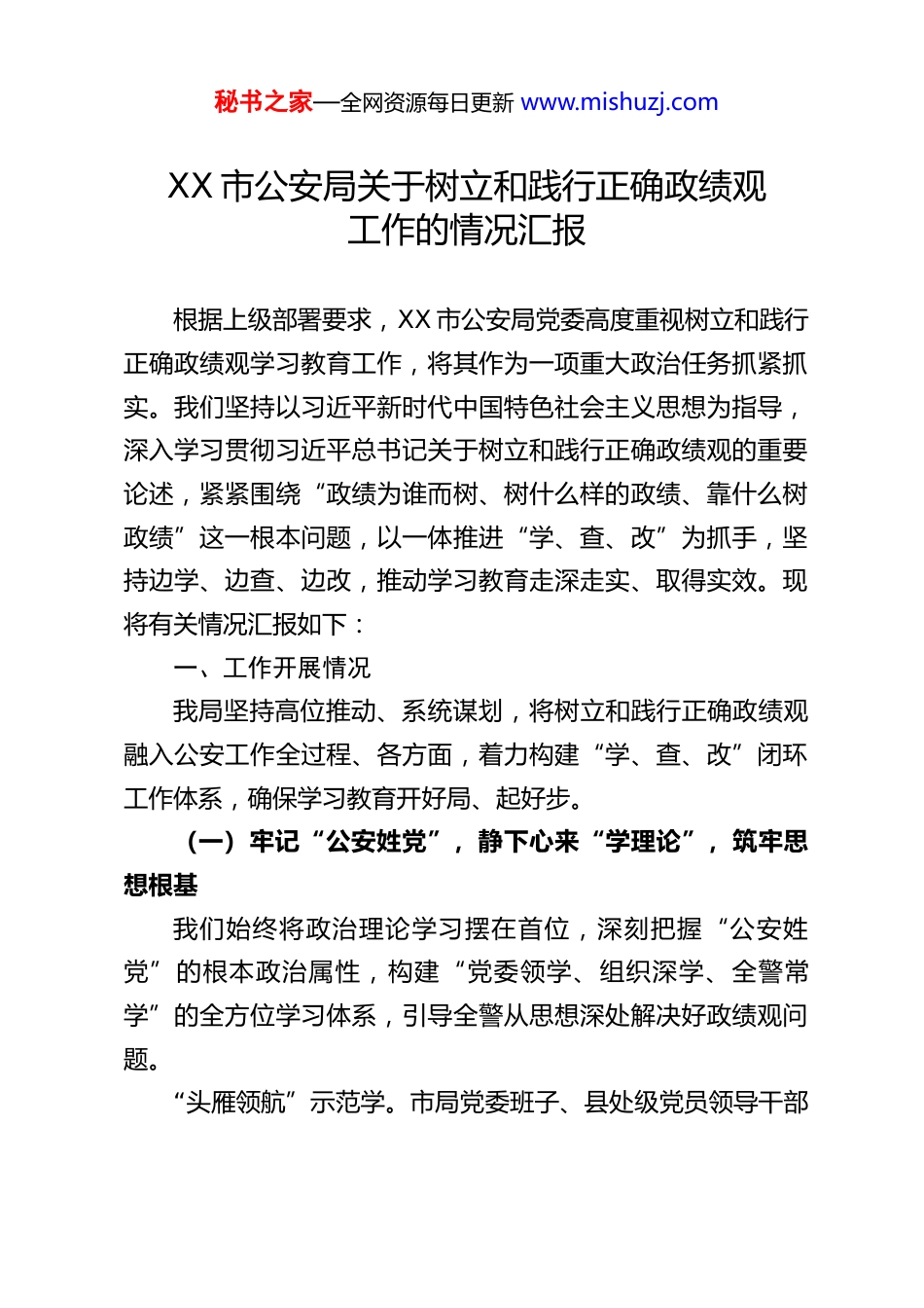 秘书之家—全网资源每日更新 www.mishuzj.comXX 市公安局关于树立和践行正确政绩观工作的情况汇报根据上级部署要求,XX 市公安局党委高度重视树立和践行正确政绩观学习教育工作,将其作为一项重大政治任务抓紧抓实。我们坚持以习近平新时代中国特色社会主义思想为指导,深入学习贯彻习近平总书记关于树立和践行正确政绩观的重要论述,紧紧围绕“政绩为谁而树、树什么样的政绩、靠什么树政绩”这一根本问题,以一体推进“学、查、改”为抓手,坚持边学、边查、边改,推动学习教育走深走实、取得实效。现将有关情况汇报如下:一、工作开展情况我局坚持高位推动、系统谋划,将树立和践行正确政绩观融入公安工作全过程、各方面,着力构建“学、查、改”闭环工作体系,确保学习教育开好局、起好步。(一)牢记“公安姓党”,静下心来“学理论”,筑牢思想根基我们始终将政治理论学习摆在首位,深刻把握“公安姓党”的根本政治属性,构建“党委领学、组织深学、全警常学”的全方位学习体系,引导全警从思想深处解决好政绩观问题。“头雁领航”示范学。市局党委班子、县处级党员领导干部秘书之家—全网资源每日更新 www.mishuzj.com坚持先学一步、深学一层,带头研读、带头谈体会、带头找差距。高质量举办树立和践行正确政绩观学习教育专题读书班,以党委理论学习中心组形式开展集中研讨 X 次,班子成员撰写心得体会 X 篇,切实发挥“关键少数”的示范引领作用,带动广大民警辅警深学细悟、入脑入心。“全域覆盖”深入学。各级党组织严格落实“第一议题”制度,依托“三会一课”、主题党日等载体,累计开展学习研讨646 场次,覆盖全警 X 人次。组织全警认认真真、原原本本研读《习近平关于树立和践行正确政绩观论述摘编》《习近平总书记地方工作期间坚持正确政绩观生动实践》等权威教材,深刻领会核心要义和精神实质,切实学出政治忠诚、学出责任担当、学出实战本领。“结合实际”贯通学。坚持理论联系实际,将学习正确政绩观与学习贯彻习近平法治思想、习近平总书记关于新时代公安工作的重要论述紧密结合,引导全警联系公安工作实际和岗位职责深入思考。围绕“在执法办案中如何体现公平正义”“在服务群众中如何践行初心使命”“在队伍管理中如何激励担当作为”等主题开展大讨论,推动“为人民”的思想融入血脉、注入灵魂,转化为“功成不必在我、功成必定有我”的行动自觉。(二)立足公安主责,刀刃向内“查问题”,精准画像把脉秘书之家—全网资源每日更新 www.mishuzj.com我们坚持问题导向,发扬自我革命精神,严格落实“三个对照”要求,构建“内部自查+外部征求+跨岗联动”三维查摆机制,深挖政绩观上的偏差和不足。“开门纳谏”听民声。班子成员带头开展自查自纠,深入分管联系部门、基层所队开展走访调研 X 次。坚持开门搞教育,通过设立意见箱、召开座谈会、发放征求意见函等形式,面向各县(市)区公安局(分局)、局直各单位及社会各界广泛征求意见建议,累计收集各类意见 913 条。对这些意见进行梳理归类,为精准画像提供了第一手资料。“协同监督”查病灶。依托督察审计、警务保障、环食药侦等警种协同机制,对近年来巡视巡察、纪检监察、财费监督、审计监督、生态环保督察等反馈的问题进行全量梳理、汇总分析。重点回溯上级关心关注、群众反映强烈的“痛点堵点”问题,确保查摆无死角、无盲区,从多维度检视政绩观偏差在具体工作中的表现。“精准聚焦”找靶向。紧扣群众急难愁盼和公安主责主业,围绕“化解信访积案”“治理城市交通拥堵”“守护群众‘舌尖上的安全’”“净化重点区域社会治安”“服务经济高质量发展”“规范执法行为”等六个方面,深入开展分析研判。通过层层筛选、集体研究,最终形成了市局党委班子及成员个人的“问题清单”,共梳理出 X 个方面 XX 个具体问题,并开列了集中整治的“作战任务图”,做到了靶向精准、有的放矢。秘书之家—全网资源每日更新 www.mishuzj.com(三)践行公安初心,多措并举“改不足”,务求工作实效我们坚持学用结合、查改贯通,把整改整治与我市“三区四定位”总体目标和公安“1234567”工作思路深度融...