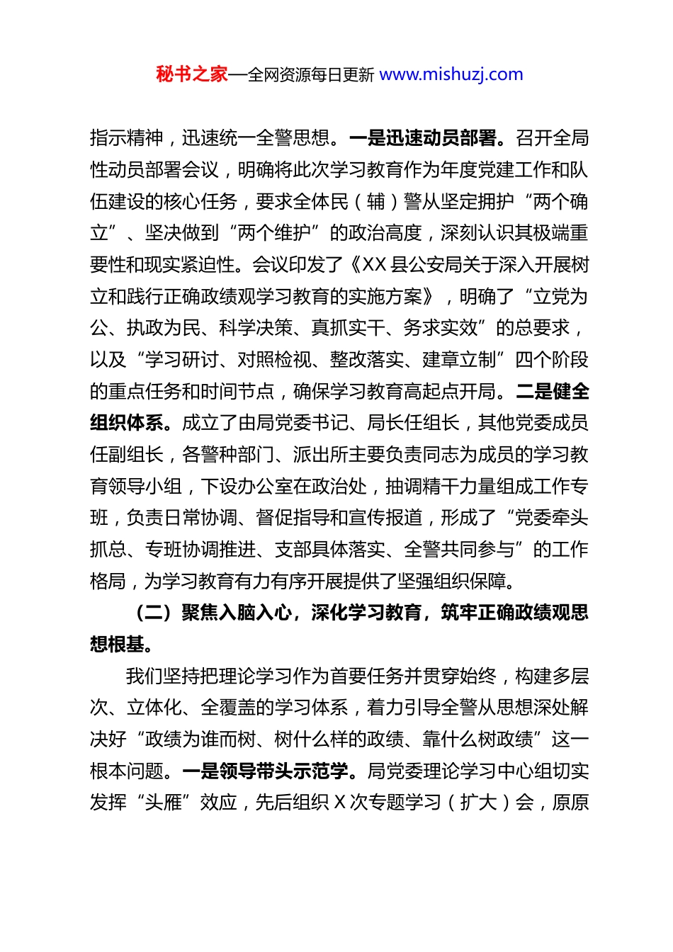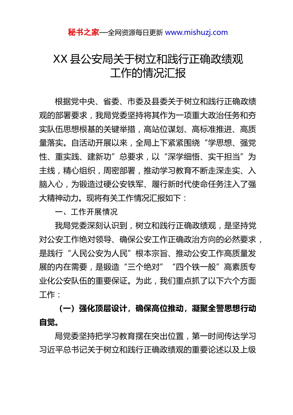 秘书之家—全网资源每日更新 www.mishuzj.comXX 县公安局关于树立和践行正确政绩观工作的情况汇报根据党中央、省委、市委及县委关于树立和践行正确政绩观的部署要求,我局党委坚持将其作为一项重大政治任务和夯实队伍思想根基的关键举措,高站位谋划、高标准推进、高质量落实。自活动开展以来,全局上下紧紧围绕“学思想、强党性、重实践、建新功”总要求,以“深学细悟、实干担当”为主线,精心组织,周密部署,推动学习教育不断走深走实、入脑入心,为锻造过硬公安铁军、履行新时代使命任务注入了强大精神动力。现将有关工作情况汇报如下:一、工作开展情况我局党委深刻认识到,树立和践行正确政绩观,是坚持党对公安工作绝对领导、确保公安工作正确政治方向的必然要求,是践行“人民公安为人民”根本宗旨、推动公安工作高质量发展的内在需要,是锻造“三个绝对”“四个铁一般”高素质专业化公安队伍的重要保证。为此,我们重点抓了以下六个方面工作:(一)强化顶层设计,确保高位推动,凝聚全警思想行动自觉。局党委坚持把学习教育摆在突出位置,第一时间传达学习习近平总书记关于树立和践行正确政绩观的重要论述以及上级秘书之家—全网资源每日更新 www.mishuzj.com指示精神,迅速统一全警思想。一是迅速动员部署。召开全局性动员部署会议,明确将此次学习教育作为年度党建工作和队伍建设的核心任务,要求全体民(辅)警从坚定拥护“两个确立”、坚决做到“两个维护”的政治高度,深刻认识其极端重要性和现实紧迫性。会议印发了《XX 县公安局关于深入开展树立和践行正确政绩观学习教育的实施方案》,明确了“立党为公、执政为民、科学决策、真抓实干、务求实效”的总要求,以及“学习研讨、对照检视、整改落实、建章立制”四个阶段的重点任务和时间节点,确保学习教育高起点开局。二是健全组织体系。成立了由局党委书记、局长任组长,其他党委成员任副组长,各警种部门、派出所主要负责同志为成员的学习教育领导小组,下设办公室在政治处,抽调精干力量组成工作专班,负责日常协调、督促指导和宣传报道,形成了“党委牵头抓总、专班协调推进、支部具体落实、全警共同参与”的工作格局,为学习教育有力有序开展提供了坚强组织保障。(二)聚焦入脑入心,深化学习教育,筑牢正确政绩观思想根基。我们坚持把理论学习作为首要任务并贯穿始终,构建多层次、立体化、全覆盖的学习体系,着力引导全警从思想深处解决好“政绩为谁而树、树什么样的政绩、靠什么树政绩”这一根本问题。一是领导带头示范学。局党委理论学习中心组切实发挥“头雁”效应,先后组织 X 次专题学习(扩大)会,原原秘书之家—全网资源每日更新 www.mishuzj.com本本、逐字逐句学习《习近平关于树立和践行正确政绩观论述摘编》等指定学习材料,并结合分管领域和公安工作实际开展深入研讨。党委成员带头撰写学习体会、带头参加支部活动、带头讲授专题党课,以“关键少数”带动“绝大多数”。二是举办读书班集中学。集中时间、集中精力,举办了为期 X 天的专题读书班,组织局领导班子成员、四级高级警长以上职级干部、各警种部门及派出所主要负责人,静下心来读原著、学原文、悟原理。读书班通过专家辅导、观看专题片、分组研讨、交流发言等多种形式,引导参学人员深刻领悟正确政绩观的科学内涵、精神实质和实践要求,达到了相互启发、共同提高的目的。目前,此项工作已按计划完成,取得了良好效果。三是支部全员覆盖学。各党支部充分发挥战斗堡垒作用,依托“三会一课”、主题党日、周学习例会等载体,采取“集中学习+个人自学”“线上推送+线下研讨”相结合的方式,组织全体民(辅)警开展学习。为增强学习效果,我们编印了《学习资料汇编》,利用“学习强国”、公安网络学院等线上平台推送学习内容,并组织开展知识测试、主题征文、演讲比赛等活动,营造了浓厚的学习氛围,确保了学习教育不漏一人、不留死角,有效延伸至“神经末梢”。(三)坚持问题导向,深入查摆整改,着力纠治政绩观偏差。我们坚持把发现问题、解决问题作为学习教育的出发点和秘书之家—全网资源每日更新 www.mishuzj.com落脚点,...