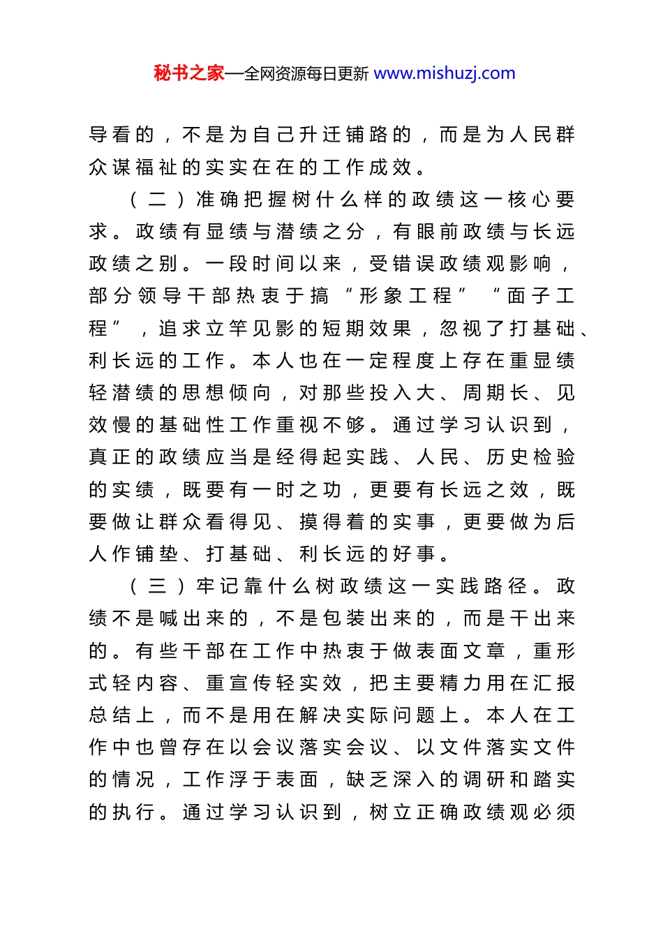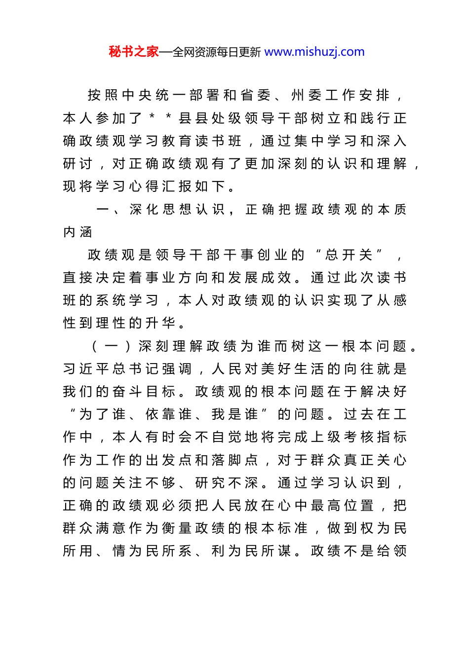 秘书之家—全网资源每日更新 www.mishuzj.com按 照 中 央 统 一 部 署 和 省 委 、 州 委 工 作 安 排 ,本 人 参 加 了 * * 县 县 处 级 领 导 干 部 树 立 和 践 行 正确 政 绩 观 学 习 教 育 读 书 班 , 通 过 集 中 学 习 和 深 入研 讨 , 对 正 确 政 绩 观 有 了 更 加 深 刻 的 认 识 和 理 解 ,现 将 学 习 心 得 汇 报 如 下 。一 、 深 化 思 想 认 识 , 正 确 把 握 政 绩 观 的 本 质内 涵政 绩 观 是 领 导 干 部 干 事 创 业 的 “ 总 开 关 ” ,直 接 决 定 着 事 业 方 向 和 发 展 成 效 。 通 过 此 次 读 书班 的 系 统 学 习 , 本 人 对 政 绩 观 的 认 识 实 现 了 从 感性 到 理 性 的 升 华 。( 一 ) 深 刻 理 解 政 绩 为 谁 而 树 这 一 根 本 问 题 。习 近 平 总 书 记 强 调 , 人 民 对 美 好 生 活 的 向 往 就 是我 们 的 奋 斗 目 标 。 政 绩 观 的 根 本 问 题 在 于 解 决 好“ 为 了 谁 、 依 靠 谁 、 我 是 谁 ” 的 问 题 。 过 去 在 工作 中 , 本 人 有 时 会 不 自 觉 地 将 完 成 上 级 考 核 指 标作 为 工 作 的 出 发 点 和 落 脚 点 , 对 于 群 众 真 正 关 心的 问 题 关 注 不 够 、 研 究 不 深 。 通 过 学 习 认 识 到 ,正 确 的 政 绩 观 必 须 把 人 民 放 在 心 中 最 高 位 置 , 把群 众 满 意 作 为 衡 量 政 绩 的 根 本 标 准 , 做 到 权 为 民所 用 、 情 为 民 所 系 、 利 为 民 所 谋 。 政 绩 不 是 给 领秘书之家—全网资源每日更新 www.mishuzj.com导 看 的 , 不 是 为 自 己 升 迁 铺 路 的 , 而 是 为 人 民 群众 谋 福 祉 的 实 实 在 在 的 工 作 成 效 。( 二 ) 准 确 把 握 树 什 么 样 的 政 绩 这 一 核 心 要求 。 政 绩 有 显 绩 与 潜 绩 之 分 , 有 眼 前 政 绩 与 长 远政 绩 之 别 。 一 段 时 间 以 来 , 受 错 误 政 绩 观 影 响 ,部 分 领 导 干 部 热 衷 于 搞 “ 形 象 工 程 ” “ 面 子 工程 ” , 追 求 立 竿 见 影 的 短 期 效 果 , 忽 视 了 打 基 础 、利 长 远 的 工 作 。 本 人 也 在 一 定 程 度 上 存 在 重 显 绩轻 潜 绩 的 思 想 倾 向 , 对 那 些 投 入 大 、 周 期 长 、 见效 慢 的 基 础 性 工 作 重 视 不 够 。 通 过 学 习 认 识 到 ,真 正 的 政 绩 应 当 是 经 得 起 实 践 、 人 民 、 历 史 检 验的 实 绩 , 既 要 有 一 时 之 功 , 更 要 有 长 远 之 效 , 既要 做 让 群 众 看 得 见 、 摸 得 着 的 实 事 , 更 要 做 为 后人 作 铺 垫 、 打 基 础 、 利 长 远 的 好 事 。( 三 ) 牢 记 靠 什 么 树 政 绩 这 一 实 践 路 径 。 政绩 不 是 喊 出 来 的 , 不 是 包 装 出 来 的 , 而 是 干 出 来的 。 有 些 干 部 在 工 作 中 热 衷 于 做 表 面 文 章 , 重 形式 轻 内 容 、 重 宣 传 轻 实 效 , 把 主 要 精 力 用 在 汇 报总 结 上 , 而 不 是 用 在 解 决 实 际 问 题 上 。 本 人 在 工作 中 也 曾 存 在 以 会 议 落 实 会 议 、 以 文 件 落 实 文 件的 情 况 , 工 作 浮 于 表 面 , 缺 乏 深 入 的 调 研 和 踏 实的 执 行 。 通 过 学 习 认 识 到 , 树 ...