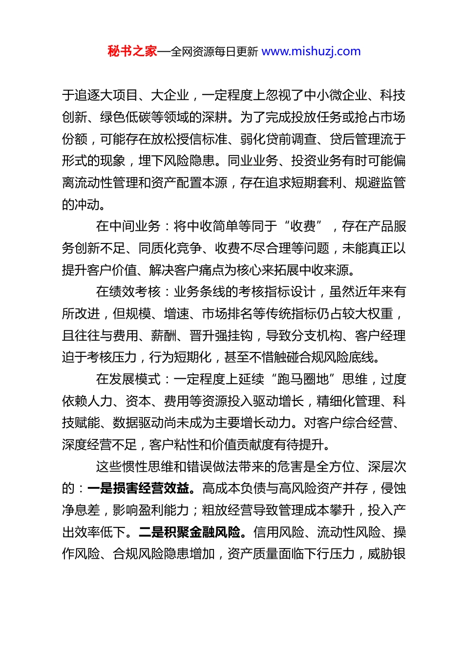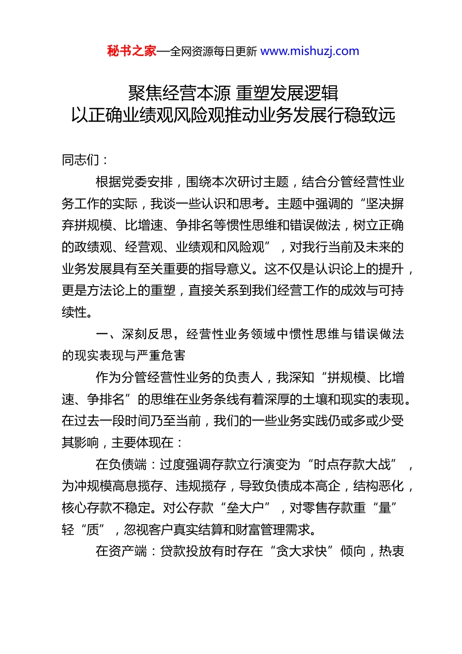 秘书之家—全网资源每日更新 www.mishuzj.com聚焦经营本源 重塑发展逻辑以正确业绩观风险观推动业务发展行稳致远同志们:根据党委安排,围绕本次研讨主题,结合分管经营性业务工作的实际,我谈一些认识和思考。主题中强调的“坚决摒弃拼规模、比增速、争排名等惯性思维和错误做法,树立正确的政绩观、经营观、业绩观和风险观”,对我行当前及未来的业务发展具有至关重要的指导意义。这不仅是认识论上的提升,更是方法论上的重塑,直接关系到我们经营工作的成效与可持续性。一、深刻反思,经营性业务领域中惯性思维与错误做法的现实表现与严重危害作为分管经营性业务的负责人,我深知“拼规模、比增速、争排名”的思维在业务条线有着深厚的土壤和现实的表现。在过去一段时间乃至当前,我们的一些业务实践仍或多或少受其影响,主要体现在:在负债端:过度强调存款立行演变为“时点存款大战”,为冲规模高息揽存、违规揽存,导致负债成本高企,结构恶化,核心存款不稳定。对公存款“垒大户”,对零售存款重“量”轻“质”,忽视客户真实结算和财富管理需求。在资产端:贷款投放有时存在“贪大求快”倾向,热衷秘书之家—全网资源每日更新 www.mishuzj.com于追逐大项目、大企业,一定程度上忽视了中小微企业、科技创新、绿色低碳等领域的深耕。为了完成投放任务或抢占市场份额,可能存在放松授信标准、弱化贷前调查、贷后管理流于形式的现象,埋下风险隐患。同业业务、投资业务有时可能偏离流动性管理和资产配置本源,存在追求短期套利、规避监管的冲动。在中间业务:将中收简单等同于“收费”,存在产品服务创新不足、同质化竞争、收费不尽合理等问题,未能真正以提升客户价值、解决客户痛点为核心来拓展中收来源。在绩效考核:业务条线的考核指标设计,虽然近年来有所改进,但规模、增速、市场排名等传统指标仍占较大权重,且往往与费用、薪酬、晋升强挂钩,导致分支机构、客户经理迫于考核压力,行为短期化,甚至不惜触碰合规风险底线。在发展模式:一定程度上延续“跑马圈地”思维,过度依赖人力、资本、费用等资源投入驱动增长,精细化管理、科技赋能、数据驱动尚未成为主要增长动力。对客户综合经营、深度经营不足,客户粘性和价值贡献度有待提升。这些惯性思维和错误做法带来的危害是全方位、深层次的:一是损害经营效益。高成本负债与高风险资产并存,侵蚀净息差,影响盈利能力;粗放经营导致管理成本攀升,投入产出效率低下。二是积聚金融风险。信用风险、流动性风险、操作风险、合规风险隐患增加,资产质量面临下行压力,威胁银秘书之家—全网资源每日更新 www.mishuzj.com行稳健经营根基。三是扭曲内部生态。助长浮躁风气,导致部分员工热衷于搞关系、冲时点,而不是潜心研究客户、提升专业能力、做好风险管理。四是损害客户关系与社会形象。以自我为中心的考核导向,可能导致忽视客户体验,甚至侵害消费者权益,影响银行长期信誉。五是偏离主责主业。可能使银行资源过度集中于某些领域,削弱了对实体经济重点领域和薄弱环节的支持力度。当前,利率市场化深化、金融脱媒加速、监管持续趋严、客户需求迭代、科技变革迅猛,银行业传统盈利模式和增长逻辑受到根本性挑战。继续沿袭旧有思维和做法,无异于“饮鸩止渴”,最终将导致竞争力丧失、发展陷入困境。因此,彻底扭转经营性业务领域的错误导向,牢固树立并践行正确的业绩观和风险观,已成为我们迫在眉睫、必须打赢的一场硬仗。二、笃行实干,在经营性业务全链条中全面践行正确的业绩观与风险观摒弃错误思维,树立正确观念,最终要落脚到经营管理的具体行动上。结合分管工作,我认为必须在以下关键环节实现根本转变:(一)在发展战略与规划上,从“速度情结”转向“质量优先”。制定和实施业务发展规划时,要坚决破除“规模情结”和“速度焦虑”,将发展的重心从“有多快”转向“有多好”。要深入分析宏观经济、区域经济、产业周期和监管导向,秘书之家—全网资源每日更新 www.mishuzj.com明确我行的市场定位和比较优势。业务规划要突出结构优化、特色打造、效能提升和风险可控,明确哪些领域要重点发展、哪些领域要...