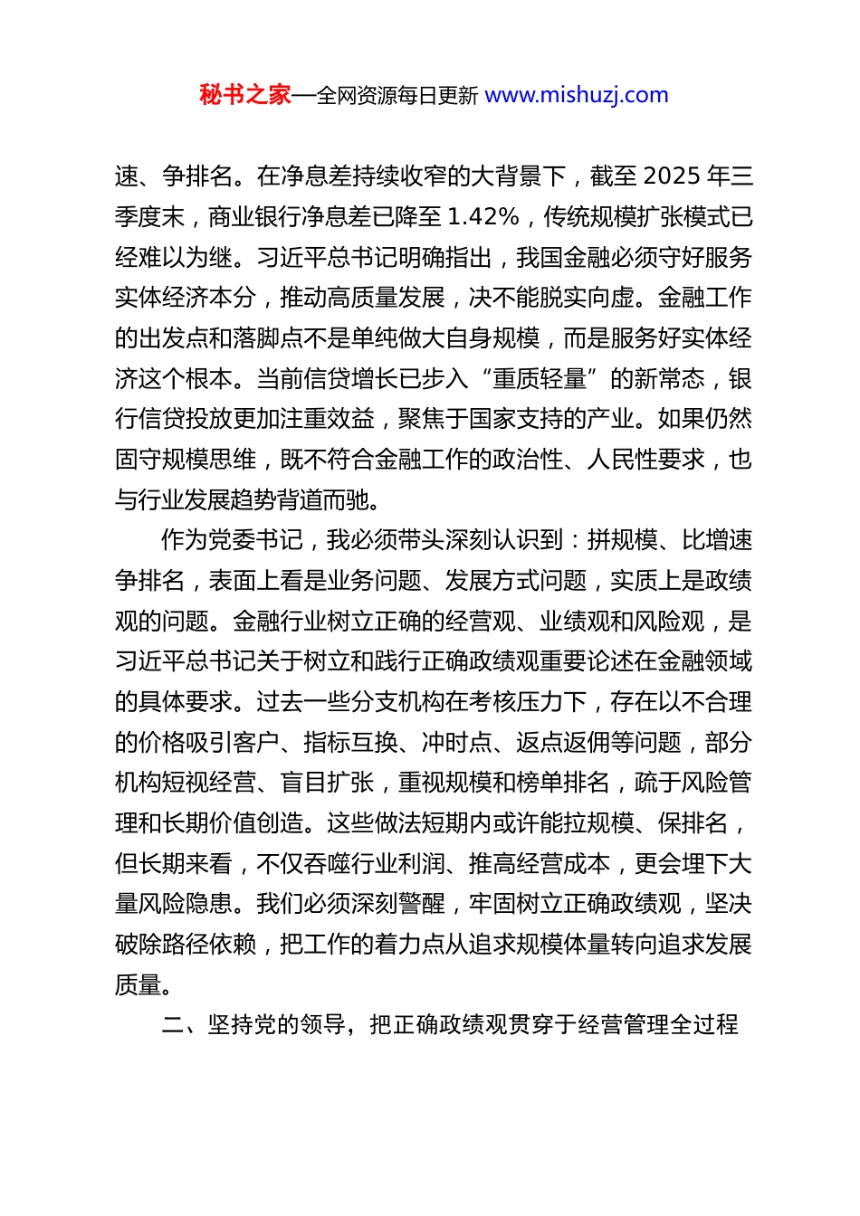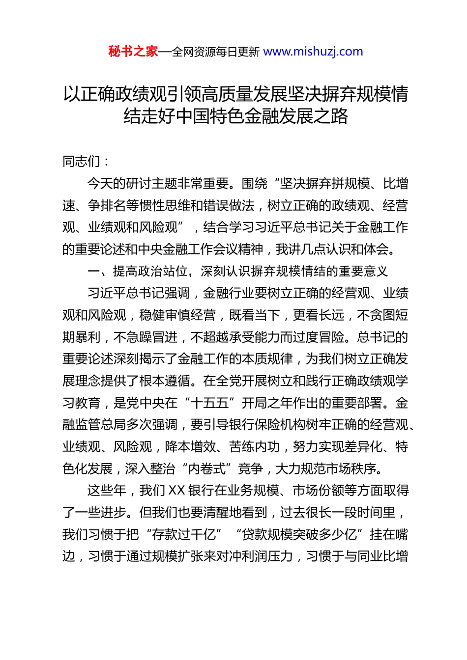 秘书之家—全网资源每日更新 www.mishuzj.com以正确政绩观引领高质量发展坚决摒弃规模情结走好中国特色金融发展之路同志们:今天的研讨主题非常重要。围绕“坚决摒弃拼规模、比增速、争排名等惯性思维和错误做法,树立正确的政绩观、经营观、业绩观和风险观”,结合学习习近平总书记关于金融工作的重要论述和中央金融工作会议精神,我讲几点认识和体会。一、提高政治站位,深刻认识摒弃规模情结的重要意义习近平总书记强调,金融行业要树立正确的经营观、业绩观和风险观,稳健审慎经营,既看当下,更看长远,不贪图短期暴利,不急躁冒进,不超越承受能力而过度冒险。总书记的重要论述深刻揭示了金融工作的本质规律,为我们树立正确发展理念提供了根本遵循。在全党开展树立和践行正确政绩观学习教育,是党中央在“十五五”开局之年作出的重要部署。金融监管总局多次强调,要引导银行保险机构树牢正确的经营观、业绩观、风险观,降本增效、苦练内功,努力实现差异化、特色化发展,深入整治“内卷式”竞争,大力规范市场秩序。这些年,我们 XX 银行在业务规模、市场份额等方面取得了一些进步。但我们也要清醒地看到,过去很长一段时间里,我们习惯于把“存款过千亿”“贷款规模突破多少亿”挂在嘴边,习惯于通过规模扩张来对冲利润压力,习惯于与同业比增秘书之家—全网资源每日更新 www.mishuzj.com速、争排名。在净息差持续收窄的大背景下,截至 2025 年三季度末,商业银行净息差已降至 1.42%,传统规模扩张模式已经难以为继。习近平总书记明确指出,我国金融必须守好服务实体经济本分,推动高质量发展,决不能脱实向虚。金融工作的出发点和落脚点不是单纯做大自身规模,而是服务好实体经济这个根本。当前信贷增长已步入“重质轻量”的新常态,银行信贷投放更加注重效益,聚焦于国家支持的产业。如果仍然固守规模思维,既不符合金融工作的政治性、人民性要求,也与行业发展趋势背道而驰。作为党委书记,我必须带头深刻认识到:拼规模、比增速争排名,表面上看是业务问题、发展方式问题,实质上是政绩观的问题。金融行业树立正确的经营观、业绩观和风险观,是习近平总书记关于树立和践行正确政绩观重要论述在金融领域的具体要求。过去一些分支机构在考核压力下,存在以不合理的价格吸引客户、指标互换、冲时点、返点返佣等问题,部分机构短视经营、盲目扩张,重视规模和榜单排名,疏于风险管理和长期价值创造。这些做法短期内或许能拉规模、保排名,但长期来看,不仅吞噬行业利润、推高经营成本,更会埋下大量风险隐患。我们必须深刻警醒,牢固树立正确政绩观,坚决破除路径依赖,把工作的着力点从追求规模体量转向追求发展质量。二、坚持党的领导,把正确政绩观贯穿于经营管理全过程秘书之家—全网资源每日更新 www.mishuzj.com党的领导是中国特色金融发展之路最本质的特征,是我国金融发展最大的政治优势、制度优势。作为党委班子,我们肩负着把方向、管大局、促落实的政治责任。全行上下要旗帜鲜明地把正确政绩观作为考核评价、干部选拔、资源配置的根本标尺。一是在考核导向上,坚决打破“唯规模论英雄”的惯性。过去,我们考核体系中规模类指标权重偏高,一些分支机构为完成规模任务,不惜以价格换规模,甚至陷入“赔本赚吆喝”的困境。从今年开始,我们要下大力气调整绩效考核结构,大幅压降存贷款规模类指标权重,更加关注战略转型方向、长期价值创造等核心目标,增加非利息收入占比、轻资本业务收入占比、客户价值贡献、资产质量等质量效益类指标权重,将服务实体经济的质效、普惠金融的覆盖面、科技金融的创新力度等纳入考核范畴,引导全行从“以量补价”转向“以质取胜”。二是在资源配置上,把有限资源向高质量发展方向倾斜。过去资源跟着规模走,谁规模大谁拿资源多,导致资源配置效率不高、重点领域投入不足。今后,资源配置要与战略方向、资本回报、风险收益相匹配,优先保障“五篇大文章”等重点领域,推动信贷资源向新质生产力、小微企业、绿色产业等国家战略方向集中。必须摒弃过去“撒胡椒面”式的粗放投放,聚焦高资本回报、低风险占用、高客户粘性的业务...