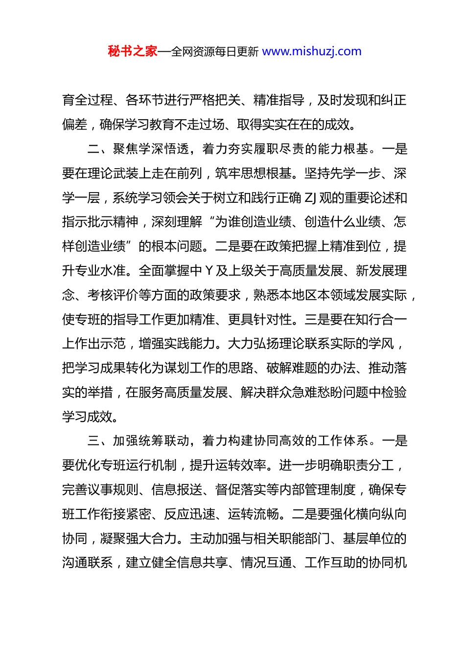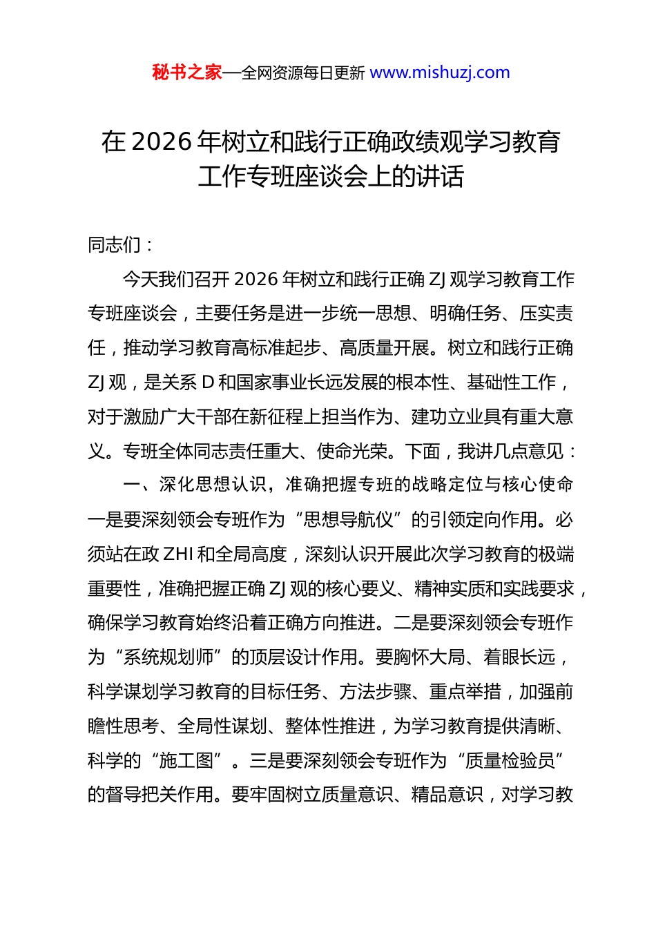 秘书之家—全网资源每日更新 www.mishuzj.com在 2026 年树立和践行正确政绩观学习教育工作专班座谈会上的讲话同志们:今天我们召开 2026 年树立和践行正确 ZJ 观学习教育工作专班座谈会,主要任务是进一步统一思想、明确任务、压实责任,推动学习教育高标准起步、高质量开展。树立和践行正确ZJ 观,是关系 D 和国家事业长远发展的根本性、基础性工作,对于激励广大干部在新征程上担当作为、建功立业具有重大意义。专班全体同志责任重大、使命光荣。下面,我讲几点意见:一、深化思想认识,准确把握专班的战略定位与核心使命一是要深刻领会专班作为“思想导航仪”的引领定向作用。必须站在政 ZHI 和全局高度,深刻认识开展此次学习教育的极端重要性,准确把握正确 ZJ 观的核心要义、精神实质和实践要求,确保学习教育始终沿着正确方向推进。二是要深刻领会专班作为“系统规划师”的顶层设计作用。要胸怀大局、着眼长远,科学谋划学习教育的目标任务、方法步骤、重点举措,加强前瞻性思考、全局性谋划、整体性推进,为学习教育提供清晰、科学的“施工图”。三是要深刻领会专班作为“质量检验员”的督导把关作用。要牢固树立质量意识、精品意识,对学习教秘书之家—全网资源每日更新 www.mishuzj.com育全过程、各环节进行严格把关、精准指导,及时发现和纠正偏差,确保学习教育不走过场、取得实实在在的成效。二、聚焦学深悟透,着力夯实履职尽责的能力根基。一是要在理论武装上走在前列,筑牢思想根基。坚持先学一步、深学一层,系统学习领会关于树立和践行正确 ZJ 观的重要论述和指示批示精神,深刻理解“为谁创造业绩、创造什么业绩、怎样创造业绩”的根本问题。二是要在政策把握上精准到位,提升专业水准。全面掌握中 Y 及上级关于高质量发展、新发展理念、考核评价等方面的政策要求,熟悉本地区本领域发展实际,使专班的指导工作更加精准、更具针对性。三是要在知行合一上作出示范,增强实践能力。大力弘扬理论联系实际的学风,把学习成果转化为谋划工作的思路、破解难题的办法、推动落实的举措,在服务高质量发展、解决群众急难愁盼问题中检验学习成效。三、加强统筹联动,着力构建协同高效的工作体系。一是要优化专班运行机制,提升运转效率。进一步明确职责分工,完善议事规则、信息报送、督促落实等内部管理制度,确保专班工作衔接紧密、反应迅速、运转流畅。二是要强化横向纵向协同,凝聚强大合力。主动加强与相关职能部门、基层单位的沟通联系,建立健全信息共享、情况互通、工作互助的协同机秘书之家—全网资源每日更新 www.mishuzj.com制,形成上下贯通、左右联动、齐抓共管的工作格局。三是要坚持围绕中心服务大局,促进深度融合。自觉将学习教育工作置于 2026 年经济社会发展全局中去思考、去定位、去推进,与年度重点工作任务紧密结合,做到两手抓、两不误、两促进。四、坚持问题导向,着力推动学习教育向纵深发展。一是要深入基层精准调研,全面掌握实情。扑下身子、沉到一线,多层次、多方位、多渠道了解 D 员干部 ZJ 观方面存在的突出问题、具体表现和思想根源,为精准施策打下坚实基础。二是要动真碰硬抓好整改,务求取得实效。对调研发现和各方面反映的问题,建立清单台账,明确整改责任和时限,加强跟踪问效,确保问题整改到位、见到实效,坚决防止形式主义。三是要注重长效机制建设,巩固拓展成果。坚持“当下改”与“长久立”相结合,及时总结提炼学习教育中的好经验好做法,将其固化为制度规范,推动树立和践行正确 ZJ 观常态化、长效化。五、锤炼过硬作风,着力打造忠诚干净担当的专班队伍。一是要旗帜鲜明讲政 ZHI,严守纪律规矩。始终把政 ZHI 建设摆在首位,严格遵守 D 的政 ZHI 纪律和政 ZHI 规矩,在思想上政 ZHI 上行动上同 D 中 Y 保持高度一致,确保专班工作的政ZHI 性、严肃性。二是要大力弘扬务实作风,狠抓工作落实。坚持实事求是,察实情、说实话、办实事、求实效。力戒形式秘书之家—全网资源每日更新 www.mishuzj.com主义、官僚主义,以钉钉子精神推动各项任务落地生根。三是要自觉维护团结协...