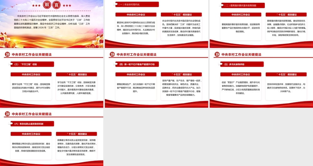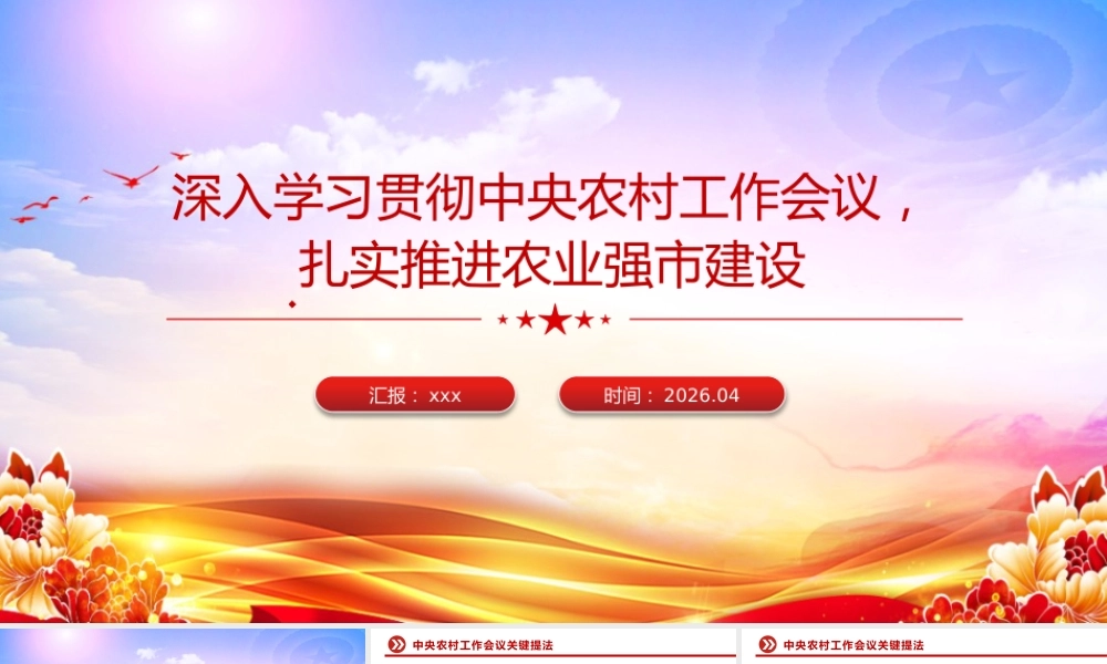 深入学习贯彻中央农村工作会议,扎实推进农业强市建设汇报: xxx时间: 2026.04 中央农村工作会议以习近平新时代中国特色社会主义思想为指导,深入贯彻党的二十大和二十届历次全会精神,全面贯彻习近平总书记关于“三农”工作的重要论述和重要指示精神,落实中央经济工作会议精神,分析当前“三农”工作面临的形势和挑战,部署 2026 年“三农”工作。前言中央农村工作会议关键提法(一)农业农村现代化要坚持以新时代中国特色社会主义思想为指导,深入贯彻党的二十大和二十届历次全会精神,锚定农业农村现代化,扎实推进乡村全面振兴,推动城乡融合发展。中央农村工作会议农业农村现代化关系中国式现代化全局和成色。坚持把解决好“三农”问题作为全党工作重中之重,促进城乡融合发展,持续巩固拓展脱贫攻坚成果,推动农村基本具备现代生活条件,加快建设农业强国。“ 十五五”规划建议中央农村工作会议关键提法要提高强农惠农富农政策效能,促进粮食等重要农产品价格保持在合理水平,促进农民稳定增收。中央农村工作会议提高强农惠农富农政策效能。健全财政优先保障、金融重点倾斜、社会积极参与的多元投入格局,确保乡村振兴投入力度不断增强。保护和调动农民务农种粮积极性,强化价格、补贴、保险等政策支持和协同。“ 十五五”规划建议(二)提高强农惠农富农政策效能中央农村工作会议关键提法(三)“千万工程”经验要学习运用“千万工程”经验,因地制宜推进宜居宜业和美乡村建设,提升乡村治理和文明乡风建设水平。中央农村工作会议学习运用“千万工程”经验,因地制宜完善乡村建设实施机制,分类有序、片区化推进乡村振兴,逐步提高农村基础设施完备度、公共服务便利度、人居环境舒适度。“ 十五五”规划建议中央农村工作会议关键提法(四)新一轮千亿斤粮食产能提升行动要稳定粮油生产,加力实施新一轮千亿斤粮食产能提升行动,推动粮食品种培优和品质提升。中央农村工作会议坚持产量产能、生产生态、增产增收一起抓,统筹发展科技农业、绿色农业、质量农业、品牌农业,把农业建成现代化大产业。加力实施新一轮千亿斤粮食产能提升行动,增强粮食等重要农产品供给保障能力。“ 十五五”规划建议中央农村工作会议关键提法(五)多元化食物供给促进“菜篮子”产业提质增效,提升多元化食物供给能力。加强耕地保护和质量提升,严守耕地红线,分区分类高质量推进高标准农田建设。中央农村工作会议坚持农林牧渔并举,发展现代设施农业,构建多元化食物供给体系。发展林下经济,壮大林草产业。“ 十五五”规划建议中央农村工作会议关键提法(六)常态化防止返贫致贫机制要统筹建立常态化防止返贫致贫机制,健全常态化帮扶政策体系,接续支持欠发达地区发展,持续巩固拓展脱贫攻坚成果。中央农村工作会议统筹建立常态化防止返贫致贫机制,坚持精准帮扶,完善兜底式保障,强化开发式帮扶,增强内生动力,分层分类帮扶欠发达地区,健全乡村振兴重点帮扶县支持政策,确保不发生规模性返贫致贫。“ 十五五”规划建议