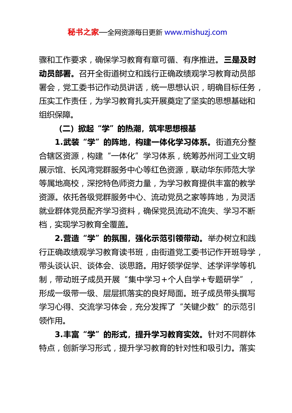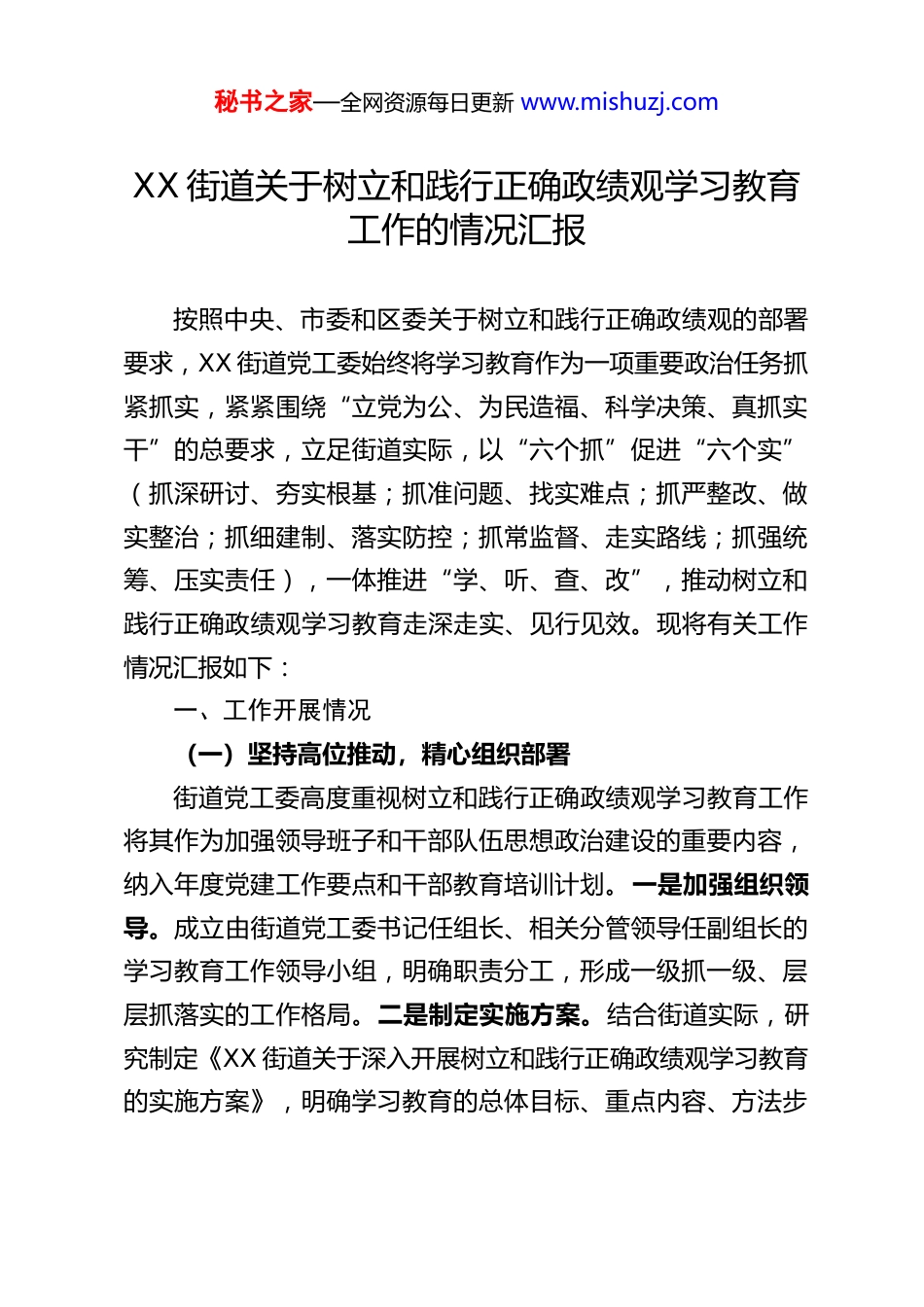 秘书之家—全网资源每日更新 www.mishuzj.comXX 街道关于树立和践行正确政绩观学习教育工作的情况汇报按照中央、市委和区委关于树立和践行正确政绩观的部署要求,XX 街道党工委始终将学习教育作为一项重要政治任务抓紧抓实,紧紧围绕“立党为公、为民造福、科学决策、真抓实干”的总要求,立足街道实际,以“六个抓”促进“六个实”(抓深研讨、夯实根基;抓准问题、找实难点;抓严整改、做实整治;抓细建制、落实防控;抓常监督、走实路线;抓强统筹、压实责任),一体推进“学、听、查、改”,推动树立和践行正确政绩观学习教育走深走实、见行见效。现将有关工作情况汇报如下:一、工作开展情况(一)坚持高位推动,精心组织部署街道党工委高度重视树立和践行正确政绩观学习教育工作将其作为加强领导班子和干部队伍思想政治建设的重要内容,纳入年度党建工作要点和干部教育培训计划。一是加强组织领导。成立由街道党工委书记任组长、相关分管领导任副组长的学习教育工作领导小组,明确职责分工,形成一级抓一级、层层抓落实的工作格局。二是制定实施方案。结合街道实际,研究制定《XX 街道关于深入开展树立和践行正确政绩观学习教育的实施方案》,明确学习教育的总体目标、重点内容、方法步秘书之家—全网资源每日更新 www.mishuzj.com骤和工作要求,确保学习教育有章可循、有序推进。三是及时动员部署。召开全街道树立和践行正确政绩观学习教育动员部署会,党工委书记作动员讲话,统一思想认识,明确目标任务,压实工作责任,为学习教育扎实开展奠定了坚实的思想基础和组织保障。(二)掀起“学”的热潮,筑牢思想根基1.武装“学”的阵地,构建一体化学习体系。街道充分整合辖区资源,构建“一体化”学习体系,统筹苏州河工业文明展示馆、长风湾党群服务中心等红色资源,联动华东师范大学等属地高校,深挖特色师资力量,为学习教育提供丰富的教学资源。依托各级党群服务中心、流动党员之家等阵地,为灵活就业群体党员配齐学习资料,确保党员流动不流失、学习不断档,实现学习教育全覆盖。2.营造“学”的氛围,强化示范引领带动。举办树立和践行正确政绩观学习教育读书班,由街道党工委书记作开班导学,带头谈认识、谈体会、谈思路。用好领学促学、述学评学等机制,带动班子成员开展“集中学习+个人自学+专题研学”,形成一级带一级、层层抓落实的良好局面。班子成员带头撰写学习心得、交流学习体会,充分发挥了“关键少数”的示范引领作用。3.丰富“学”的形式,提升学习教育实效。针对不同群体特点,创新学习形式,提升学习教育的针对性和吸引力。落实秘书之家—全网资源每日更新 www.mishuzj.com“抱团式”共学,通过支部共学、街楼联学、片区统学等方式,服务零散党员开展学习教育。针对新兴领域党员工作节奏快、时间碎片化等特点,定制“1+1+1 随心配”课程清单,指导楼宇党支部推出“午间一刻钟”“周末集中学”等灵活学习形式,确保学习教育与日常工作两不误、两促进。(三)畅通“听”的渠道,精准把握民意1.深入一线“听”实情,问需于民问需于企。结合“四百”大走访(进百家门、访百家情、解百家难、暖百家心),街道领导班子成员带头深入居民区、楼宇企业,面对面倾听群众和企业的需求与问题。将学习教育与点亮“侨心侨愿”行动相结合,快速响应并点亮早期归侨提出的“看看科创上海”微心愿;针对楼宇走访中了解到的企业法律服务需求,第一时间启动“书记来楼”机制,统筹群团、律所资源,送法律服务进大宗贸易企业,切实将问需于民、问需于企的要求落到实处。2.座谈交流“听”心声,激发干事创业热情。围绕“树立正确政绩观勇担使命建新功”主题,组织召开“年轻干部与党工委书记面对面”座谈会。街道党工委书记与年轻干部代表深入交流,听取他们在成长过程中的思考、立足本职岗位的认识以及下一步工作打算。通过面对面交流,进一步了解了年轻干部的思想动态,引导他们扣好从政的“第一粒扣子”,树立正确的政绩观。3.数字赋能“听”民意,拓宽意见收集渠道。充分运用秘书之家—全网资源每日更新 www.mishuzj.com12345 市民服务热线、人民建议征集、“小事...