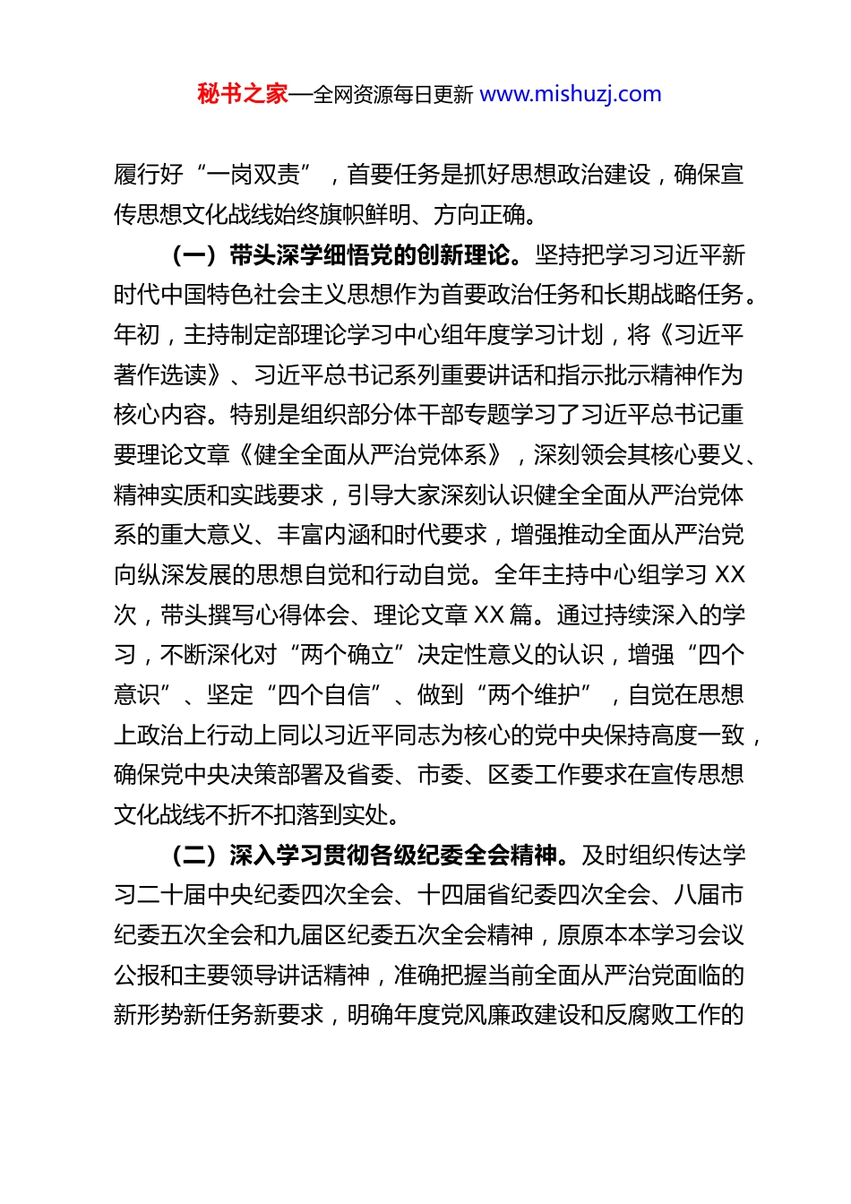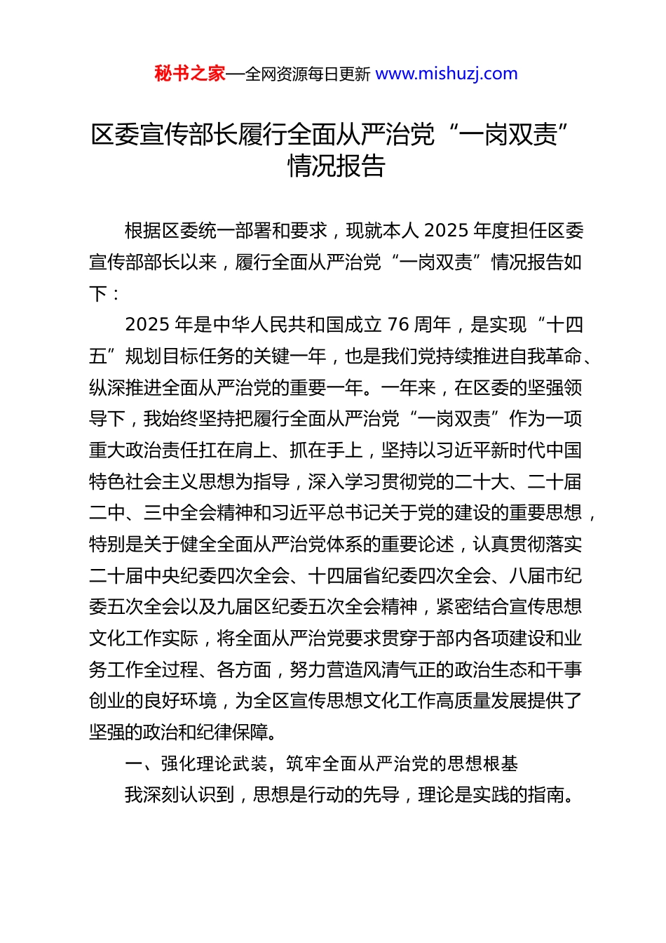 秘书之家—全网资源每日更新 www.mishuzj.com区委宣传部长履行全面从严治党“一岗双责”情况报告根据区委统一部署和要求,现就本人 2025 年度担任区委宣传部部长以来,履行全面从严治党“一岗双责”情况报告如下:2025 年是中华人民共和国成立 76 周年,是实现“十四五”规划目标任务的关键一年,也是我们党持续推进自我革命、纵深推进全面从严治党的重要一年。一年来,在区委的坚强领导下,我始终坚持把履行全面从严治党“一岗双责”作为一项重大政治责任扛在肩上、抓在手上,坚持以习近平新时代中国特色社会主义思想为指导,深入学习贯彻党的二十大、二十届二中、三中全会精神和习近平总书记关于党的建设的重要思想,特别是关于健全全面从严治党体系的重要论述,认真贯彻落实二十届中央纪委四次全会、十四届省纪委四次全会、八届市纪委五次全会以及九届区纪委五次全会精神,紧密结合宣传思想文化工作实际,将全面从严治党要求贯穿于部内各项建设和业务工作全过程、各方面,努力营造风清气正的政治生态和干事创业的良好环境,为全区宣传思想文化工作高质量发展提供了坚强的政治和纪律保障。一、强化理论武装,筑牢全面从严治党的思想根基我深刻认识到,思想是行动的先导,理论是实践的指南。秘书之家—全网资源每日更新 www.mishuzj.com履行好“一岗双责”,首要任务是抓好思想政治建设,确保宣传思想文化战线始终旗帜鲜明、方向正确。(一)带头深学细悟党的创新理论。坚持把学习习近平新时代中国特色社会主义思想作为首要政治任务和长期战略任务。年初,主持制定部理论学习中心组年度学习计划,将《习近平著作选读》、习近平总书记系列重要讲话和指示批示精神作为核心内容。特别是组织部分体干部专题学习了习近平总书记重要理论文章《健全全面从严治党体系》,深刻领会其核心要义、精神实质和实践要求,引导大家深刻认识健全全面从严治党体系的重大意义、丰富内涵和时代要求,增强推动全面从严治党向纵深发展的思想自觉和行动自觉。全年主持中心组学习 XX次,带头撰写心得体会、理论文章 XX 篇。通过持续深入的学习,不断深化对“两个确立”决定性意义的认识,增强“四个意识”、坚定“四个自信”、做到“两个维护”,自觉在思想上政治上行动上同以习近平同志为核心的党中央保持高度一致,确保党中央决策部署及省委、市委、区委工作要求在宣传思想文化战线不折不扣落到实处。(二)深入学习贯彻各级纪委全会精神。及时组织传达学习二十届中央纪委四次全会、十四届省纪委四次全会、八届市纪委五次全会和九届区纪委五次全会精神,原原本本学习会议公报和主要领导讲话精神,准确把握当前全面从严治党面临的新形势新任务新要求,明确年度党风廉政建设和反腐败工作的秘书之家—全网资源每日更新 www.mishuzj.com重点方向。将各级纪委全会精神纳入干部教育培训重要内容,要求各科室、下属单位结合工作实际抓好贯彻落实,切实把思想和行动统一到中央和省委、市委、区委关于全面从严治党的战略部署上来。(三)扎实开展纪律教育学习。结合上级部署,在部机关深入开展了以学习贯彻中央八项规定精神及其实施细则为重点的纪律作风学习教育。组织全体干部重温党章、《中国共产党纪律处分条例》、《中国共产党廉洁自律准则》等党内法规,将党章党规党纪教育作为干部教育培训的必修课。主持召开部机关党风廉政建设专题会议,对年度纪律建设工作进行安排部署,强调要始终突出“严”的基调,把纪律和规矩挺在前面。通过定期通报典型案例、组织观看警示教育片《持续发力纵深推进》等方式,用身边事教育身边人,引导党员干部知敬畏、存戒惧、守底线,习惯在受监督和约束的环境中工作生活。组织全体党员干部签订了《2025 年党员干部廉洁自律公开承诺书》,强化自我约束。二、压实主体责任,扛稳抓牢管党治党政治担当作为区委宣传部全面从严治党第一责任人,我始终坚持把抓好党建作为最大政绩,切实履行好领导责任和示范责任。(一)健全工作机制,明确责任分工。坚持将全面从严治党工作与宣传业务工作同谋划、同部署、同推进、同考核。年初,主持召开部务会专题研究年度全面从严治党暨...