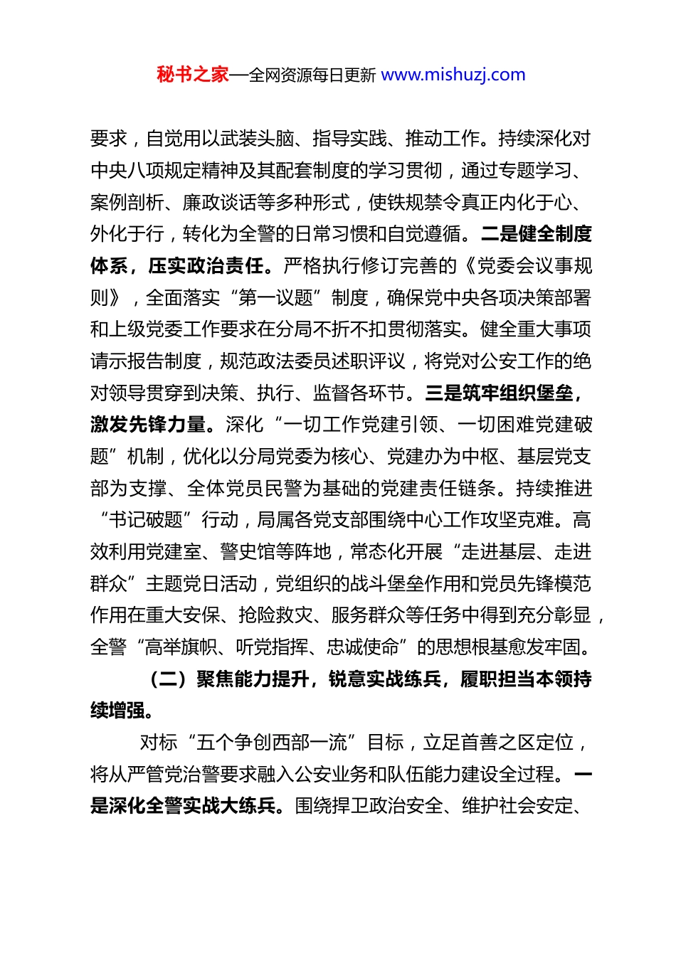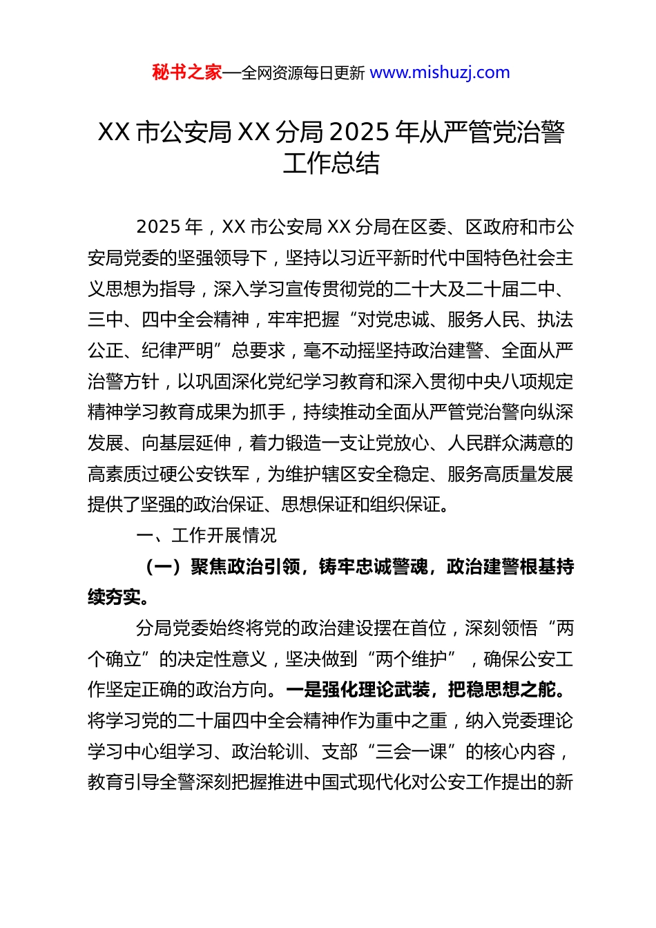 秘书之家—全网资源每日更新 www.mishuzj.comXX 市公安局 XX 分局 2025 年从严管党治警工作总结2025 年,XX 市公安局 XX 分局在区委、区政府和市公安局党委的坚强领导下,坚持以习近平新时代中国特色社会主义思想为指导,深入学习宣传贯彻党的二十大及二十届二中、三中、四中全会精神,牢牢把握“对党忠诚、服务人民、执法公正、纪律严明”总要求,毫不动摇坚持政治建警、全面从严治警方针,以巩固深化党纪学习教育和深入贯彻中央八项规定精神学习教育成果为抓手,持续推动全面从严管党治警向纵深发展、向基层延伸,着力锻造一支让党放心、人民群众满意的高素质过硬公安铁军,为维护辖区安全稳定、服务高质量发展提供了坚强的政治保证、思想保证和组织保证。一、工作开展情况(一)聚焦政治引领,铸牢忠诚警魂,政治建警根基持续夯实。分局党委始终将党的政治建设摆在首位,深刻领悟“两个确立”的决定性意义,坚决做到“两个维护”,确保公安工作坚定正确的政治方向。一是强化理论武装,把稳思想之舵。将学习党的二十届四中全会精神作为重中之重,纳入党委理论学习中心组学习、政治轮训、支部“三会一课”的核心内容,教育引导全警深刻把握推进中国式现代化对公安工作提出的新秘书之家—全网资源每日更新 www.mishuzj.com要求,自觉用以武装头脑、指导实践、推动工作。持续深化对中央八项规定精神及其配套制度的学习贯彻,通过专题学习、案例剖析、廉政谈话等多种形式,使铁规禁令真正内化于心、外化于行,转化为全警的日常习惯和自觉遵循。二是健全制度体系,压实政治责任。严格执行修订完善的《党委会议事规则》,全面落实“第一议题”制度,确保党中央各项决策部署和上级党委工作要求在分局不折不扣贯彻落实。健全重大事项请示报告制度,规范政法委员述职评议,将党对公安工作的绝对领导贯穿到决策、执行、监督各环节。三是筑牢组织堡垒,激发先锋力量。深化“一切工作党建引领、一切困难党建破题”机制,优化以分局党委为核心、党建办为中枢、基层党支部为支撑、全体党员民警为基础的党建责任链条。持续推进“书记破题”行动,局属各党支部围绕中心工作攻坚克难。高效利用党建室、警史馆等阵地,常态化开展“走进基层、走进群众”主题党日活动,党组织的战斗堡垒作用和党员先锋模范作用在重大安保、抢险救灾、服务群众等任务中得到充分彰显,全警“高举旗帜、听党指挥、忠诚使命”的思想根基愈发牢固。(二)聚焦能力提升,锐意实战练兵,履职担当本领持续增强。对标“五个争创西部一流”目标,立足首善之区定位,将从严管党治警要求融入公安业务和队伍能力建设全过程。一是深化全警实战大练兵。围绕捍卫政治安全、维护社会安定、秘书之家—全网资源每日更新 www.mishuzj.com保障人民安宁的使命任务,2025 年共组织政治理论、法律法规、应急处突、科技应用、群众工作、心理疏导等各类专题培训 40 余期,参训民警达 1800 余人次。突出“智慧警务”导向,加强大数据、人工智能等新技术新手段的应用培训,提升民警运用现代科技打防管控、服务群众的能力。二是推进执法规范化提档升级。坚持法治公安建设目标,深化执法监督管理机制改革。运用“抓培训、抓监督、抓考核、抓源头”的“四抓”机制,强化执法全流程、全要素管理。常态化开展执法质量考评和典型案例评析,通过集中培训、旁听庭审、案例教学等方式,提升民警法治素养和执法水平,全年涉警信访投诉率同比下降 X%,群众对公安机关执法满意度稳步提升。三是提升风险防控与攻坚克难能力。在打击突出违法犯罪、化解重大风险隐患、处置突发敏感案事件等实践中锤炼队伍,完善合成作战、快速反应机制,民警在复杂环境和严峻考验下的实战能力得到有效检验和提升。(三)聚焦科学管理,激励担当作为,队伍内生动力持续迸发。坚持严管与厚爱结合、激励与约束并重,着力建设充满活力、担当作为的公安队伍。一是优化干部选拔培养机制。严格执行《党政领导干部选拔任用工作条例》,树立重实干、重实绩、重担当的用人导向。结合现代警务发展需要,深化人才警务建设,新增 X 名专业技术人才入选省级公安人才库,涵盖...