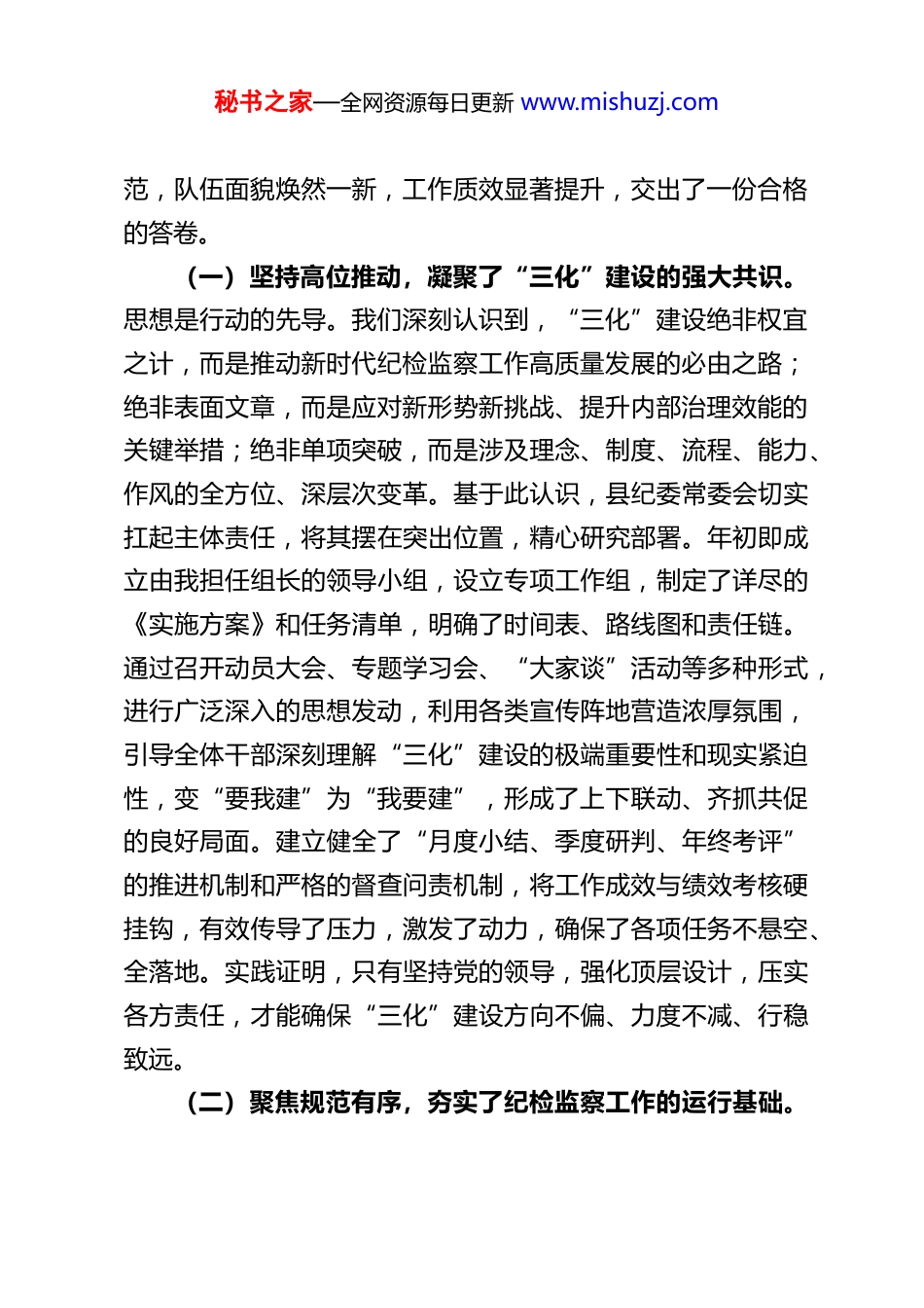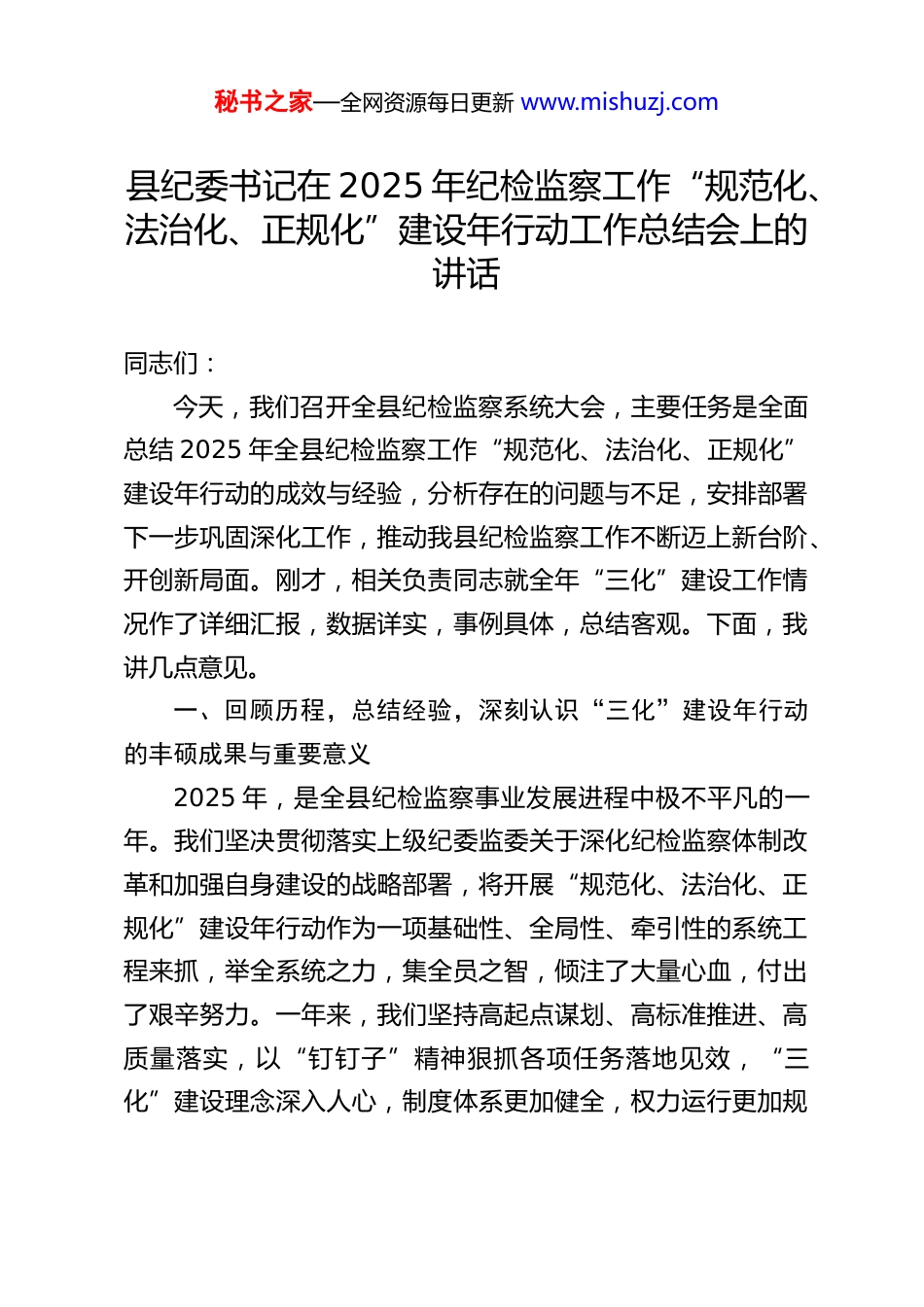 秘书之家—全网资源每日更新 www.mishuzj.com县纪委书记在 2025 年纪检监察工作“规范化、法治化、正规化”建设年行动工作总结会上的讲话同志们:今天,我们召开全县纪检监察系统大会,主要任务是全面总结 2025 年全县纪检监察工作“规范化、法治化、正规化”建设年行动的成效与经验,分析存在的问题与不足,安排部署下一步巩固深化工作,推动我县纪检监察工作不断迈上新台阶、开创新局面。刚才,相关负责同志就全年“三化”建设工作情况作了详细汇报,数据详实,事例具体,总结客观。下面,我讲几点意见。一、回顾历程,总结经验,深刻认识“三化”建设年行动的丰硕成果与重要意义2025 年,是全县纪检监察事业发展进程中极不平凡的一年。我们坚决贯彻落实上级纪委监委关于深化纪检监察体制改革和加强自身建设的战略部署,将开展“规范化、法治化、正规化”建设年行动作为一项基础性、全局性、牵引性的系统工程来抓,举全系统之力,集全员之智,倾注了大量心血,付出了艰辛努力。一年来,我们坚持高起点谋划、高标准推进、高质量落实,以“钉钉子”精神狠抓各项任务落地见效,“三化”建设理念深入人心,制度体系更加健全,权力运行更加规秘书之家—全网资源每日更新 www.mishuzj.com范,队伍面貌焕然一新,工作质效显著提升,交出了一份合格的答卷。(一)坚持高位推动,凝聚了“三化”建设的强大共识。思想是行动的先导。我们深刻认识到,“三化”建设绝非权宜之计,而是推动新时代纪检监察工作高质量发展的必由之路;绝非表面文章,而是应对新形势新挑战、提升内部治理效能的关键举措;绝非单项突破,而是涉及理念、制度、流程、能力、作风的全方位、深层次变革。基于此认识,县纪委常委会切实扛起主体责任,将其摆在突出位置,精心研究部署。年初即成立由我担任组长的领导小组,设立专项工作组,制定了详尽的《实施方案》和任务清单,明确了时间表、路线图和责任链。通过召开动员大会、专题学习会、“大家谈”活动等多种形式,进行广泛深入的思想发动,利用各类宣传阵地营造浓厚氛围,引导全体干部深刻理解“三化”建设的极端重要性和现实紧迫性,变“要我建”为“我要建”,形成了上下联动、齐抓共促的良好局面。建立健全了“月度小结、季度研判、年终考评”的推进机制和严格的督查问责机制,将工作成效与绩效考核硬挂钩,有效传导了压力,激发了动力,确保了各项任务不悬空、全落地。实践证明,只有坚持党的领导,强化顶层设计,压实各方责任,才能确保“三化”建设方向不偏、力度不减、行稳致远。(二)聚焦规范有序,夯实了纪检监察工作的运行基础。秘书之家—全网资源每日更新 www.mishuzj.com规范化是“三化”建设的基石。我们坚持问题导向,瞄准运行中的堵点、痛点、难点,着力在建章立制、优化流程、强化内控上下功夫。一是内部管理日趋精细。全面梳理、修订和新制定了一系列内部管理制度,覆盖议事决策、干部行为、公文运转、机要保密、后勤保障等各方面,使机关运转有章可循、高效顺畅。比如,通过优化签报流程,文件流转时间明显缩短,行政效率得到提升。二是业务操作更加标准。对标上级要求,修订完善了监督检查、审查调查、案件审理等核心业务流程规范,统一了各类文书模板,细化了各环节审批权限和操作标准,特别是依托检举举报平台实现了问题线索的线上流转、闭环管理,处置及时率大幅提高,有效避免了随意性和廉政风险。三是权力制约持续强化。严格执行回避、保密、过问干预案件记录报告等制度,加强对审查调查措施使用的全程监督,确保每一项措施都于法有据、合规审慎。涉案财物管理实现“一案一账、一物一卡、全程留痕”,堵塞了管理漏洞。四是科技赋能成效初显。深化各类监督办案平台应用,数据质量稳步提升。积极探索大数据监督,围绕重点领域建立模型,发现了不少问题线索,提升了监督的精准度。基层公权力监督平台的覆盖和应用,拓宽了群众监督渠道,推动了一批群众急难愁盼问题的解决。这些举措,使得我们的工作链条更加清晰,环节衔接更加紧密,内部治理更加有序,为高质量发展奠定了坚实基础。(三)强化法治引领,坚守了纪检监察工作的生命...
