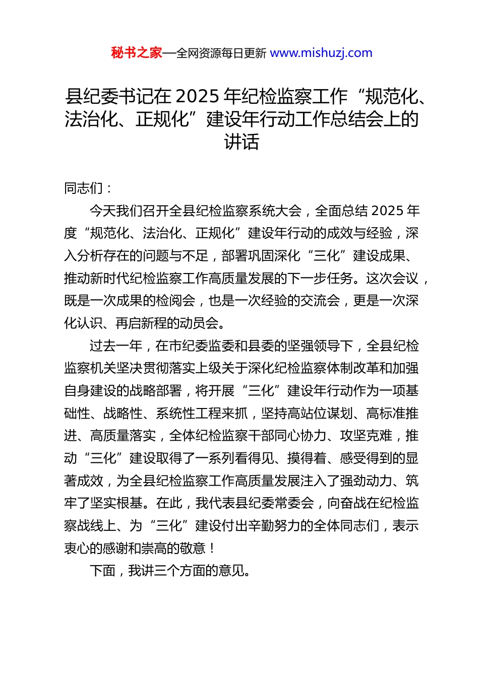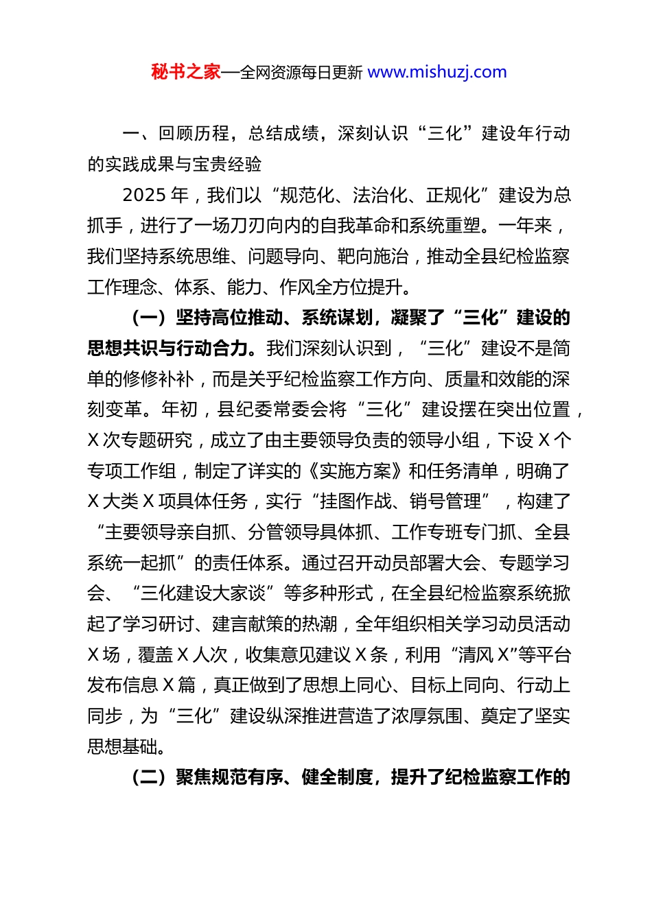 秘书之家—全网资源每日更新 www.mishuzj.com县纪委书记在 2025 年纪检监察工作“规范化、法治化、正规化”建设年行动工作总结会上的讲话同志们:今天我们召开全县纪检监察系统大会,全面总结 2025 年度“规范化、法治化、正规化”建设年行动的成效与经验,深入分析存在的问题与不足,部署巩固深化“三化”建设成果、推动新时代纪检监察工作高质量发展的下一步任务。这次会议,既是一次成果的检阅会,也是一次经验的交流会,更是一次深化认识、再启新程的动员会。过去一年,在市纪委监委和县委的坚强领导下,全县纪检监察机关坚决贯彻落实上级关于深化纪检监察体制改革和加强自身建设的战略部署,将开展“三化”建设年行动作为一项基础性、战略性、系统性工程来抓,坚持高站位谋划、高标准推进、高质量落实,全体纪检监察干部同心协力、攻坚克难,推动“三化”建设取得了一系列看得见、摸得着、感受得到的显著成效,为全县纪检监察工作高质量发展注入了强劲动力、筑牢了坚实根基。在此,我代表县纪委常委会,向奋战在纪检监察战线上、为“三化”建设付出辛勤努力的全体同志们,表示衷心的感谢和崇高的敬意!下面,我讲三个方面的意见。秘书之家—全网资源每日更新 www.mishuzj.com一、回顾历程,总结成绩,深刻认识“三化”建设年行动的实践成果与宝贵经验2025 年,我们以“规范化、法治化、正规化”建设为总抓手,进行了一场刀刃向内的自我革命和系统重塑。一年来,我们坚持系统思维、问题导向、靶向施治,推动全县纪检监察工作理念、体系、能力、作风全方位提升。(一)坚持高位推动、系统谋划,凝聚了“三化”建设的思想共识与行动合力。我们深刻认识到,“三化”建设不是简单的修修补补,而是关乎纪检监察工作方向、质量和效能的深刻变革。年初,县纪委常委会将“三化”建设摆在突出位置,X 次专题研究,成立了由主要领导负责的领导小组,下设 X 个专项工作组,制定了详实的《实施方案》和任务清单,明确了X 大类 X 项具体任务,实行“挂图作战、销号管理”,构建了“主要领导亲自抓、分管领导具体抓、工作专班专门抓、全县系统一起抓”的责任体系。通过召开动员部署大会、专题学习会、“三化建设大家谈”等多种形式,在全县纪检监察系统掀起了学习研讨、建言献策的热潮,全年组织相关学习动员活动X 场,覆盖 X 人次,收集意见建议 X 条,利用“清风 X”等平台发布信息 X 篇,真正做到了思想上同心、目标上同向、行动上同步,为“三化”建设纵深推进营造了浓厚氛围、奠定了坚实思想基础。(二)聚焦规范有序、健全制度,提升了纪检监察工作的秘书之家—全网资源每日更新 www.mishuzj.com运行效能与治理水平。规范化是“三化”建设的基础。我们着力在“立规矩、定流程、明权责”上下功夫。一是内部管理更精细。全面梳理修订内部管理制度 X 项,新制定《关于进一步规范常委会(委务会)议事决策程序的若干规定》等制度 X 项,优化各类流程 XX 项,机关运转效率平均提升约 X%。比如文件流转时间缩短 X 个工作日,就是以小切口推动效率大提升的生动例证。二是业务运作更标准。对标上级要求,修订完善监督检查、审查调查、案件审理等核心业务规范 X 项,统一文书模板 X 种,细化各环节审批权限和操作标准 X 处。特别是深化检举举报平台应用,实现了问题线索线上流转、闭环管理,全年X 件次信访举报处置及时率达到 X%,有效规范了权力运行的起点。三是风险防控更严密。严格执行回避、保密、记录报告等制度,全年记录报告相关情况 X 人次。强化对留置、搜查、查封扣押等重要措施使用的全程监督,确保合规率 X%。建成规范化涉案财物管理场所,运用信息系统实现“一案一账、一物一卡、全程留痕”,全年规范处置涉案款项 X 万元、物品 X件。四是科技赋能更深入。深化平台应用,业务数据录入完整率、准确率超 X%。积极探索大数据监督,围绕乡村振兴等重点领域建立监督模型 X 个,通过数据比对发现疑似问题线索 X条,成案 X 件。基层公权力监督平台覆盖全县所有乡镇(街道)、村(社区),公开信息 X 万余条,接收群众反馈 X 条,...