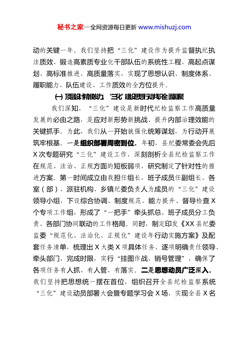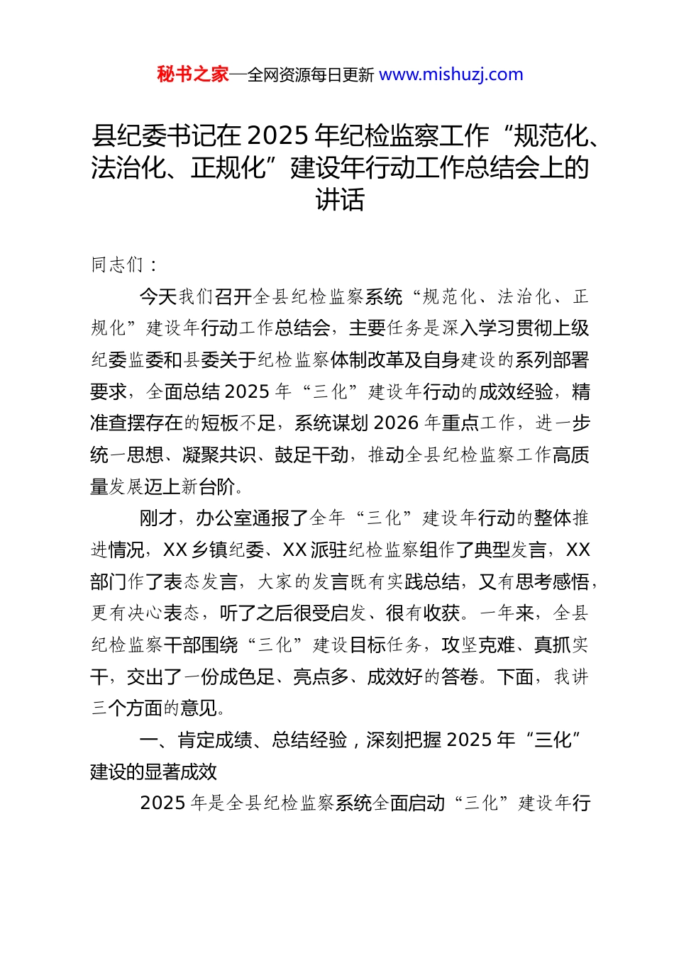 秘书之家—全网资源每日更新 www.mishuzj.com县纪委书记在 2025 年纪检监察工作“规范化、法治化、正规化”建设年行动工作总结会上的讲话同志们:我们全县纪检监察“规范化、法治化、正今天召开系统规化”建设年工作,任务是深行动总结会主要入学习贯彻上级纪监县纪检监察建设的委委和委关于体制改革及自身系列部署要求,全面总结 2025 年“三化”建设年的,行动成效经验精的不,准查摆存在短板足系统谋划 2026 年重点工作,进一步一、、,推全县纪检监察工作统思想凝聚共识鼓足干劲动高质发展新。量迈上台阶,全年“三化”建设年的推刚才办公室通报了行动整体进情况,XX纪、乡镇委XX纪检监察作发,派驻组了典型言XX作态发,大家的发既有实,有部门了表言言践总结又思考感悟,更有决心态,发、有。一年,全县表听了之后很受启很收获来纪检监察“三化”建设任务,坚、实干部围绕目标攻克难真抓,一、、的。,我讲干交出了份成色足亮点多成效好答卷下面三的。个方面意见一、肯定成绩、总结经验,深刻把握 2025 年“三化”建设的显著成效2025 年是全县纪检监察全“三化”建设年系统面启动行秘书之家—全网资源每日更新 www.mishuzj.com的一年。我们坚持“三化”建设作为提升监纪动关键把督执执法、造化的工,质效锻高素质专业干部队伍系统性程高起点谋、推进、实,实、、划高标准高质量落现了思想认识制度体系力、建设、工作的全提升。履职能队伍质效方位(一)顶层设计精准发力,“三化”建设思想行动共识全面凝聚我们深,“三化”建设是新纪检监察工作知时代高质量发展的,是新新、提升治的必由之路应对形势挑战内部理效能。为,我们一就强化,为展关键抓手此从开始统筹谋划行动开筑牢根基。一是组织部署周密到位。年初,县纪委常委会先后X“三化”建设工作,深全县纪检监察工作次专题研究刻剖析规范、法治、正规的项,定的推在方面短板弱研究制了针对性进。一我任长,任长,方案第时间成立由担组班子成员副组各、、纪责为的“三化”建设室(部)派驻机构乡镇委负人成员,设、规范、力提升、检领导小组下综合协调制度能督导查 X项工作,“一”、工个专组形成了把手牵头抓总班子成员分负责、同的工作。同,定发各部门协联动格局时制印《XX 县纪委监“规范化、法治化、正规化”建设年实委行动施方案》及配任务清,套单梳理出 X 大类 X 项任务,项责任具体逐明确领导、、,实“作、”,保牵头部门完成时限行挂图战销号管理确了项任务有、有、有实。各人抓人管落是深。二思想动员广泛入我们坚持一,全县纪检监察把思想统摆在首位组织召开系统“三化”建设动员部署大会暨专题学习会 X,实全县场现X 名秘书之家—全网资源每日更新 www.mishuzj.com纪检监察全,深“三化”建设的心、干部覆盖入解读核要义目任务实,深“三化”建设的标和践要求引导干部刻认识紧迫性。态化展“三化建设大家”“三化建设和必要性常开谈金点子”等互动活动 X,建场次收集干部意见议 X条,其中 X 条具有实的建实。“清风操性议被纳入施方案依托X”、工作微信公众号内部平,设“三化建设进”,全年发工作态、网等台开行时专栏布动政策解读、经验材料 X,造的,篇打了线上线下联动宣传矩阵营造全、建的,让“三化”深了员参与共共享浓厚氛围理念入人心。三是推进全有。机制健效建“、、立月度小结季度研判年”的推进,全年终考评闭环机制领导小组召开调度会 X,次项工作、进展,决点对点听取各专组各部门汇报现场协调解制不、推进度衔接畅基层滞后等难点问题 X。“三化”建设个将年心,成效纳入度绩效考核核指标权重占比达 X%,与干部评、提任,的实。工作先评优拔用直接挂钩形成了鲜明绩导向对推进不力、进度滞后的X责进提,以个部门负人行约谈醒严督实责任实,保项任务推进、。考倒逼落确了各压茬落地见效(二)规范建设固本强基,纪检监察工作运行效能显著提升我们坚持规范化建设作为工,力建把基础程着构系统完、规范、有的,推工作化、备科学运行效制度体系动流程优内治提。部理效一是实化。内部管理制度现精细全面梳理机关运,、保、行各环节制度漏洞修订完善公文处理机要密档...