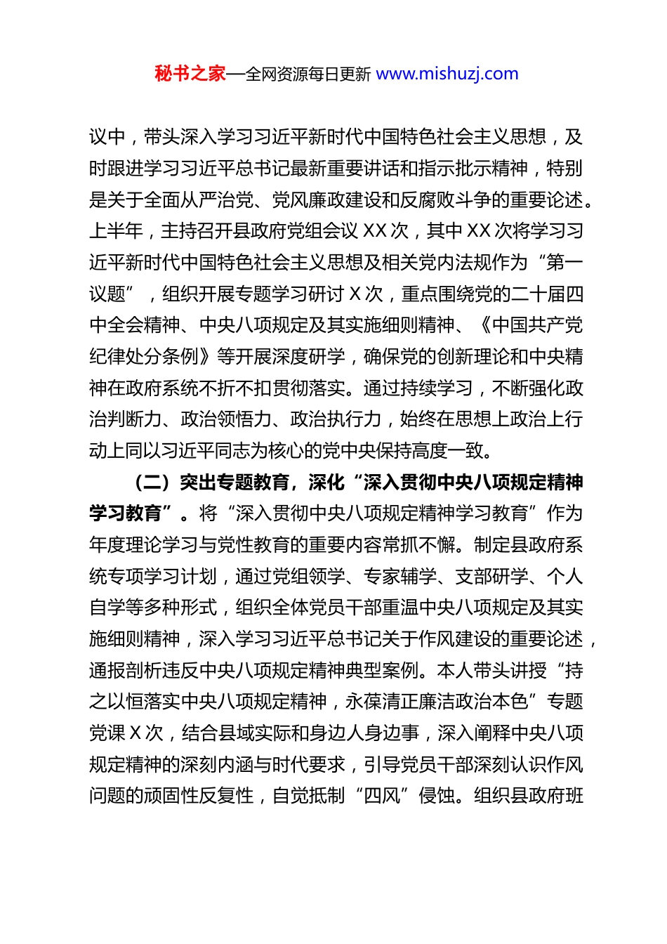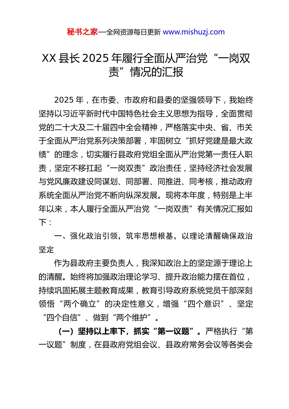 秘书之家—全网资源每日更新 www.mishuzj.comXX 县长 2025 年履行全面从严治党“一岗双责”情况的汇报2025 年,在市委、市政府和县委的坚强领导下,我始终坚持以习近平新时代中国特色社会主义思想为指导,全面贯彻党的二十大及二十届四中全会精神,严格落实中央、省、市关于全面从严治党系列决策部署,牢固树立“抓好党建是最大政绩”的理念,切实履行县政府党组全面从严治党第一责任人职责,坚定不移扛起“一岗双责”政治责任,坚持经济社会发展与党风廉政建设同谋划、同部署、同推进、同考核,推动政府系统全面从严治党不断向纵深发展。现将本年度,特别是上半年以来,本人履行全面从严治党“一岗双责”有关情况汇报如下:一、强化政治引领,筑牢思想根基,以理论清醒确保政治坚定作为县政府主要负责人,我深知政治上的坚定源于理论上的清醒。始终将加强政治理论学习、提升政治能力摆在首位,持续巩固拓展主题教育成果,教育引导政府系统党员干部深刻领悟“两个确立”的决定性意义,增强“四个意识”、坚定“四个自信”、做到“两个维护”。(一)坚持以上率下,抓实“第一议题”。严格执行“第一议题”制度,在县政府党组会议、县政府常务会议等各类会秘书之家—全网资源每日更新 www.mishuzj.com议中,带头深入学习习近平新时代中国特色社会主义思想,及时跟进学习习近平总书记最新重要讲话和指示批示精神,特别是关于全面从严治党、党风廉政建设和反腐败斗争的重要论述。上半年,主持召开县政府党组会议 XX 次,其中 XX 次将学习习近平新时代中国特色社会主义思想及相关党内法规作为“第一议题”,组织开展专题学习研讨 X 次,重点围绕党的二十届四中全会精神、中央八项规定及其实施细则精神、《中国共产党纪律处分条例》等开展深度研学,确保党的创新理论和中央精神在政府系统不折不扣贯彻落实。通过持续学习,不断强化政治判断力、政治领悟力、政治执行力,始终在思想上政治上行动上同以习近平同志为核心的党中央保持高度一致。(二)突出专题教育,深化“深入贯彻中央八项规定精神学习教育”。将“深入贯彻中央八项规定精神学习教育”作为年度理论学习与党性教育的重要内容常抓不懈。制定县政府系统专项学习计划,通过党组领学、专家辅学、支部研学、个人自学等多种形式,组织全体党员干部重温中央八项规定及其实施细则精神,深入学习习近平总书记关于作风建设的重要论述,通报剖析违反中央八项规定精神典型案例。本人带头讲授“持之以恒落实中央八项规定精神,永葆清正廉洁政治本色”专题党课 X 次,结合县域实际和身边人身边事,深入阐释中央八项规定精神的深刻内涵与时代要求,引导党员干部深刻认识作风问题的顽固性反复性,自觉抵制“四风”侵蚀。组织县政府班秘书之家—全网资源每日更新 www.mishuzj.com子成员及部门主要负责人赴廉政教育基地开展警示教育活动 X次,观看作风建设专题警示教育片 X 部,召开专题民主生活会和组织生活会,对照中央八项规定精神要求,深入查摆作风方面存在的问题与不足,推动学习教育入脑入心、触及灵魂。(三)注重学用结合,推动知行合一。大力弘扬理论联系实际的马克思主义学风,坚持将学习成果转化为谋划工作的思路、破解难题的办法、推动发展的实效。围绕县域高质量发展主线,聚焦乡村振兴、产业升级、民生保障、安全稳定、生态环保等重点领域,牵头确定 X 个重点调研课题,深入基层一线开展蹲点调研、解剖麻雀式调研 XX 次,形成高质量调研报告X 篇,推动解决了一批制约发展的瓶颈问题和群众反映强烈的急难愁盼问题。在决策过程中,始终坚持民主集中制原则,凡属“三重一大”事项,均提交县政府常务会议或党组会议集体研究决定,广泛听取意见建议,确保决策科学、民主、合法。二、坚持严于律己,严守纪律规矩,以“关键少数”示范带动“绝大多数”我始终牢记“执纪者必先守纪,律人者必先律己”的要求时刻自重自省自警自励,带头遵守党章党规党纪,严格执行廉洁自律各项规定,自觉接受各方监督,以自身清正廉洁的形象为政府系统党员干部立标杆、作表率。(一)带头严格执行中央八项规定精神。深刻认识中央...