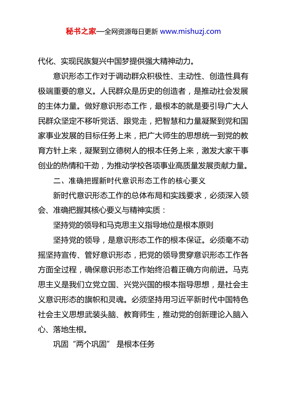 秘书之家—全网资源每日更新 www.mishuzj.com党课:新时代意识形态工作的核心要义、现实挑战与应对策略 一、深刻认识意识形态工作的极端重要性意识形态工作是党的一项极端重要的工作,事关党的前途命运、国家长治久安、民族凝聚力和向心力。历史和现实反复证明,一个政权的瓦解往往是从思想领域开始的,思想防线一旦被突破,其他防线就很难守住。苏联解体、东欧剧变的教训警示我们,放弃意识形态工作的领导权、管理权、话语权,必然导致亡党亡国。当前,我国意识形态领域面临的形势依然严峻复杂。西方敌对势力一直把我国作为意识形态渗透的重点目标,通过各种方式输出西方价值观和政治制度,妄图搞乱人心、颠覆政权。我们必须牢牢掌握意识形态工作领导权、管理权、话语权,坚决维护意识形态安全,为维护国家长治久安筑牢思想根基。实现中华民族伟大复兴,是近代以来中华民族最伟大的梦想。当前,我们比历史上任何时期都更接近、更有信心和能力实现中华民族伟大复兴的目标。同时,必须清醒看到,前进道路上风险挑战层出不穷。我们必须通过扎实有效的意识形态工作,凝聚全党全国人民团结奋斗的思想共识,为推进中国式现秘书之家—全网资源每日更新 www.mishuzj.com代化、实现民族复兴中国梦提供强大精神动力。意识形态工作对于调动群众积极性、主动性、创造性具有极端重要的意义。人民群众是历史的创造者,是推动社会发展的主体力量。做好意识形态工作,最根本的就是要引导广大人民群众坚定不移听党话、跟党走,把智慧和力量凝聚到党和国家事业发展的目标任务上来,把广大师生的思想统一到党的教育方针上来,凝聚到立德树人的根本任务上来,激发大家干事创业的热情和干劲,为推动学校各项事业高质量发展贡献力量。二、准确把握新时代意识形态工作的核心要义新时代意识形态工作的总体布局和实践要求,必须深入领会、准确把握其核心要义与精神实质:坚持党的领导和马克思主义指导地位是根本原则坚持党的领导,是意识形态工作的根本保证。必须毫不动摇坚持宣传、管好意识形态,把党的领导贯穿意识形态工作各方面全过程,确保意识形态工作始终沿着正确方向前进。马克思主义是我们立党立国、兴党兴国的根本指导思想,是社会主义意识形态的旗帜和灵魂。必须坚持用习近平新时代中国特色社会主义思想武装头脑、教育师生,推动党的创新理论入脑入心、落地生根。巩固“两个巩固” 是根本任务秘书之家—全网资源每日更新 www.mishuzj.com巩固马克思主义在意识形态领域的指导地位,巩固全党全国人民团结奋斗的共同思想基础,是意识形态工作的根本任务。这两个巩固明确了意识形态工作的根本目标和价值指向,是检验意识形态工作成效的根本标准。我们要紧紧围绕“两个巩固” 来谋划和推进工作,不断增强主流意识形态的凝聚力、引领力。坚持和加强党对意识形态工作的全面领导是根本保证意识形态工作在本质上是政治工作,必须旗帜鲜明讲政治把意识形态工作摆在全局工作的重要位置,纳入重要议事日程。党主要负责同志要切实履行第一责任人职责,带头抓意识形态工作,带头管阵地、把导向、强队伍,带头批评错误观点和错误倾向。领导班子成员要按照“一岗双责” 要求,抓好分管领域的意识形态工作。推进马克思主义中国化时代化是理论根基实践发展永无止境,理论创新也永无止境。新时代征程上必须坚持解放思想、实事求是、守正创新,坚持深化对共产党执政规律、社会主义建设规律、人类社会发展规律的认识,不断开辟马克思主义中国化时代化新境界,使马克思主义在新时代展现出更强大的真理力量和实践力量。建设具有强大凝聚力和引领力的社会主义意识形态是使命秘书之家—全网资源每日更新 www.mishuzj.com任务建设具有强大凝聚力和引领力的社会主义意识形态,是新时代意识形态工作的重大使命任务。具体来说,就是要高举马克思主义、中国特色社会主义的旗帜,建设具有强大生命力和创造力的社会主义精神文明;育新人,就是要培养担当民族复兴大任的时代新人;兴文化,就是要推动社会主义文化繁荣发展;展形象,就是要向世界展现真实、立体、全面的中国。这五个方面相互联系、有机统一,构成了新时代意...