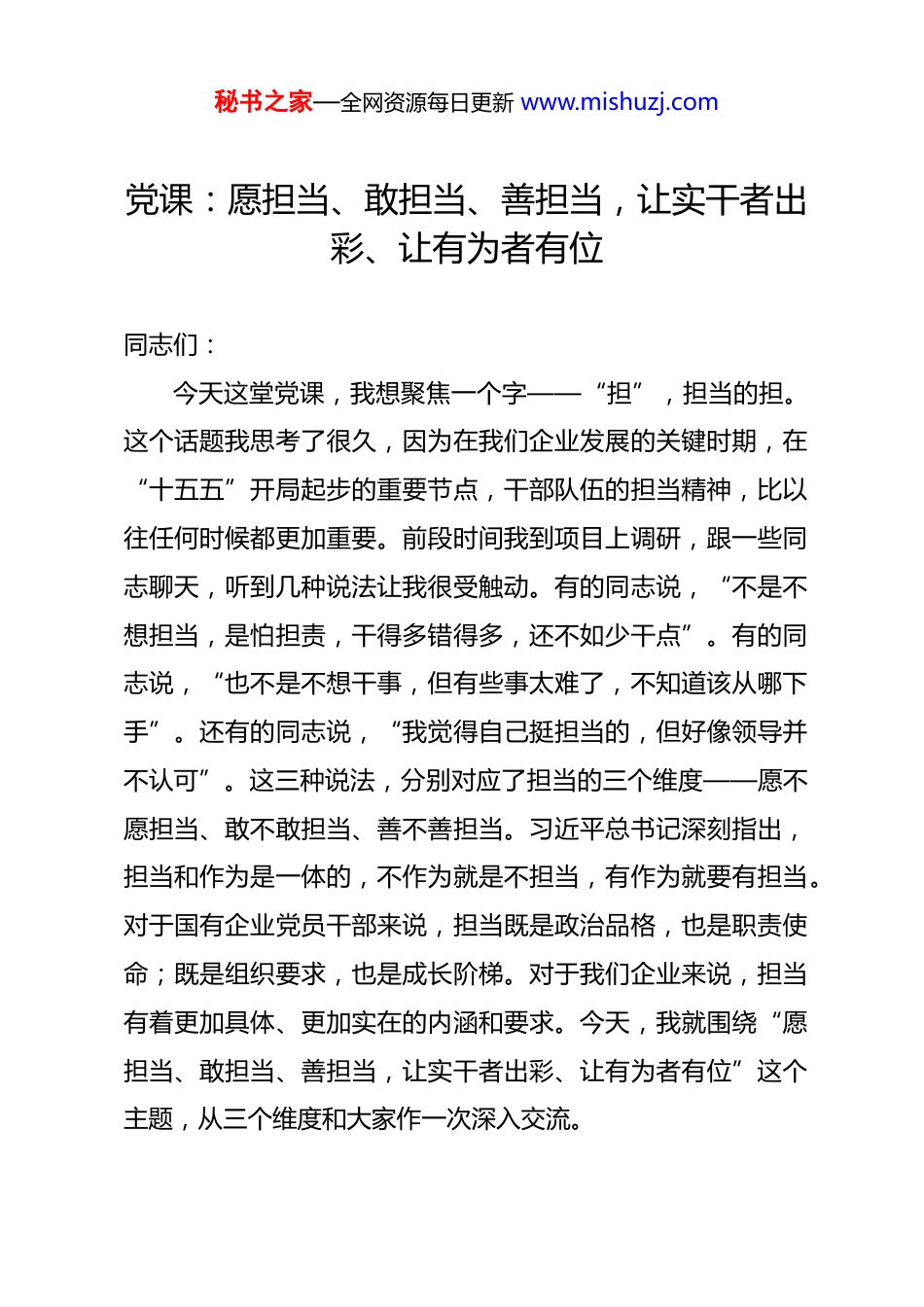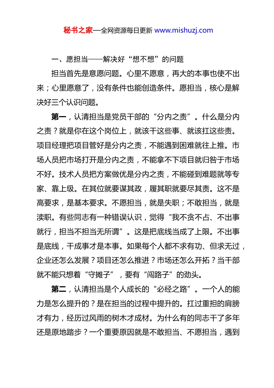 秘书之家—全网资源每日更新 www.mishuzj.com党课:愿担当、敢担当、善担当,让实干者出彩、让有为者有位 同志们:今天这堂党课,我想聚焦一个字——“担”,担当的担。这个话题我思考了很久,因为在我们企业发展的关键时期,在“十五五”开局起步的重要节点,干部队伍的担当精神,比以往任何时候都更加重要。前段时间我到项目上调研,跟一些同志聊天,听到几种说法让我很受触动。有的同志说,“不是不想担当,是怕担责,干得多错得多,还不如少干点”。有的同志说,“也不是不想干事,但有些事太难了,不知道该从哪下手”。还有的同志说,“我觉得自己挺担当的,但好像领导并不认可”。这三种说法,分别对应了担当的三个维度——愿不愿担当、敢不敢担当、善不善担当。习近平总书记深刻指出,担当和作为是一体的,不作为就是不担当,有作为就要有担当。对于国有企业党员干部来说,担当既是政治品格,也是职责使命;既是组织要求,也是成长阶梯。对于我们企业来说,担当有着更加具体、更加实在的内涵和要求。今天,我就围绕“愿担当、敢担当、善担当,让实干者出彩、让有为者有位”这个主题,从三个维度和大家作一次深入交流。秘书之家—全网资源每日更新 www.mishuzj.com一、愿担当——解决好“想不想”的问题担当首先是意愿问题。心里不愿意,再大的本事也使不出来;心里愿意了,没有条件也能创造条件。愿担当,核心是解决好三个认识问题。第一,认清担当是党员干部的“分内之责”。什么是分内之责?就是你在这个岗位上,就该干这些事、就该扛这些责。项目经理把项目管好是分内之责,不能遇到困难就往上推。市场人员把市场打开是分内之责,不能拿不下项目就归咎于市场不好。技术人员把方案做优是分内之责,不能碰到难题就等专家、靠上级。在其位就要谋其政,履其职就要尽其责。这不是高要求,是基本要求。不愿担当,就是失职;不敢担当,就是渎职。有些同志有一种错误认识,觉得“我不贪不占、不出事就行,担当不担当无所谓”。这是把底线当成了上限。不出事是底线,干成事才是本事。如果每个人都不求有功、但求无过,企业还怎么发展?项目还怎么推进?市场还怎么开拓?当干部就不能只想着“守摊子”,要有“闯路子”的劲头。第二,认清担当是个人成长的“必经之路”。一个人的能力是怎么提升的?是在担当的过程中提升的。扛过重担的肩膀才有力,经历过风雨的树木才成材。为什么有的同志干了多年还是原地踏步?一个重要原因就是不敢担当、不愿担当,遇到秘书之家—全网资源每日更新 www.mishuzj.com困难绕着走,碰到矛盾往上交,把成长的机会拱手让给了别人。反过来,那些成长快的干部,都有一个共同特点,就是敢于接烫手山芋、敢于啃硬骨头。他们在一件件难事中磨砺了意志、增长了才干、积累了经验,组织自然看在眼里、记在心上。从这个意义上说,担当就是给自己铺路,不担当就是给自己设限。第三,认清担当是企业发展的“迫切需要”。当前,行业正在经历深度调整,市场竞争越来越激烈,利润空间越来越薄,传统的发展模式难以为继。我们正处在爬坡过坎的关键时期,区域深耕需要人去扎根,技术创新需要人去攻关,精细管理需要人去推动,新兴市场需要人去开拓。这些都不是轻轻松松就能完成的,需要一大批愿担当、能担当的干部冲在前面。如果大家都不愿担当,都想着守摊子、过安稳日子,企业就会在竞争中掉队,最终损害的是全体职工的利益。解决愿担当的问题,既要靠思想教育,也要靠机制激励。组织上要旗帜鲜明地为担当者撑腰,让愿担当的人有舞台、有奔头、有实惠,让不愿担当的人有压力、没市场、待不住。二、敢担当——解决好“敢不敢”的问题愿担当是前提,敢担当是关键。光有愿望没有勇气,还是落不到行动上。敢担当,重点是要有“三股劲”。第一,要有敢于直面矛盾的“闯劲”。企业干的都是硬碰秘书之家—全网资源每日更新 www.mishuzj.com硬的活,矛盾无处不在、困难如影随形。工期紧张需要抢工,你上不上?技术难题攻克不了,你上不上?安全质量出了隐患,你敢不敢叫停?利益关系错综复杂,你敢不敢较真碰硬?这些都是考验。敢担当的人,就是要在矛盾面前不躲闪、困难...