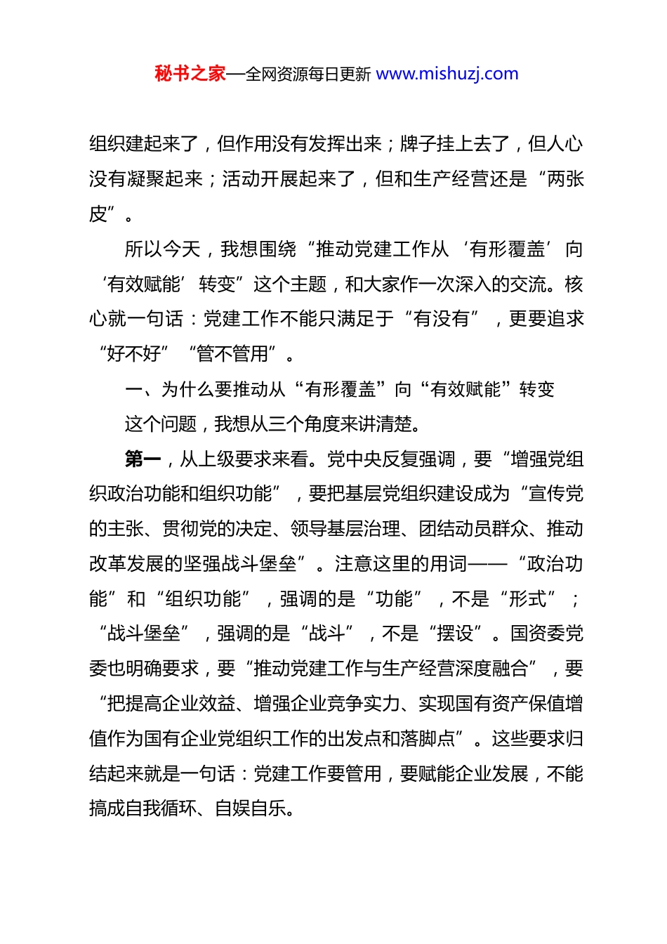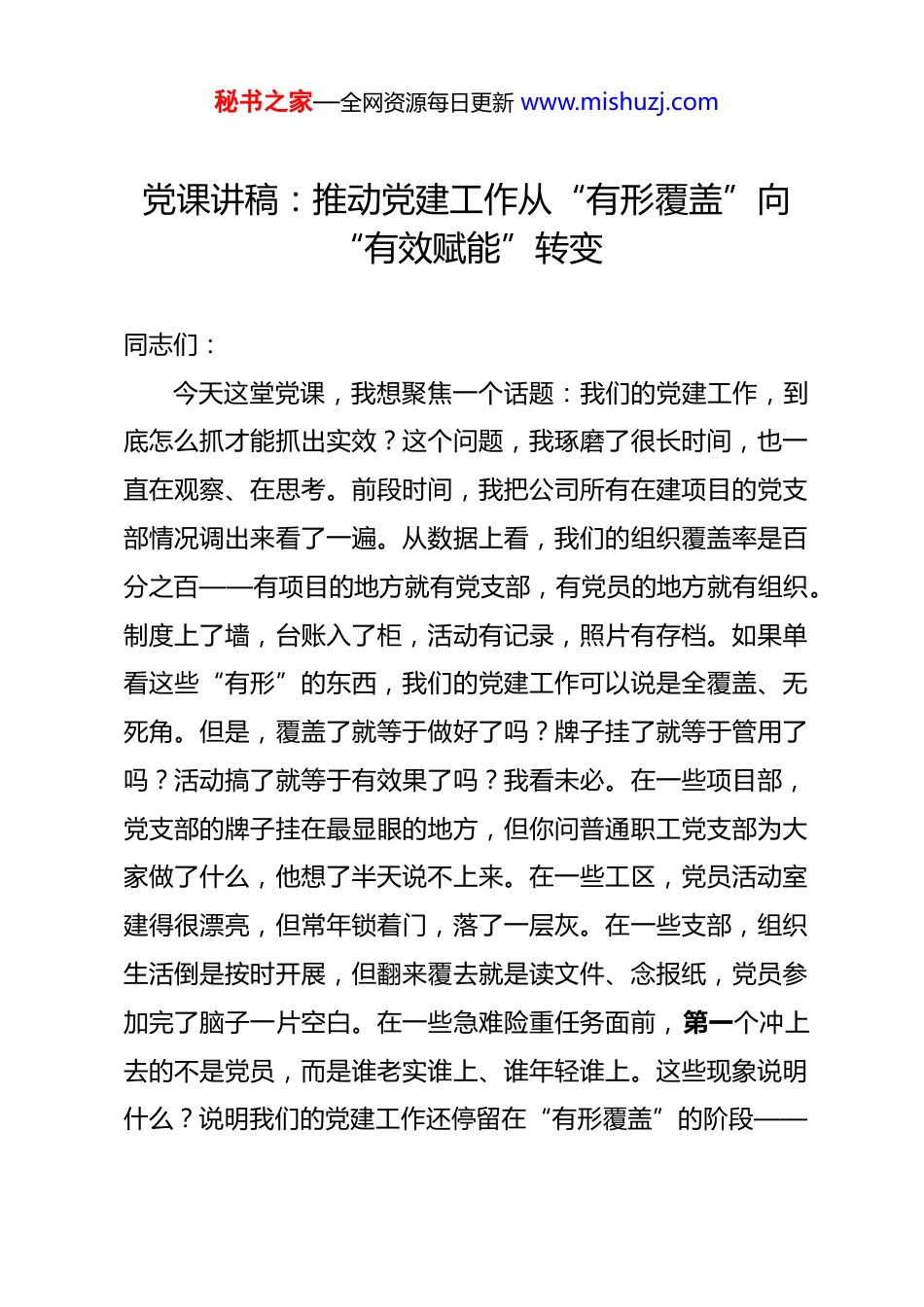 秘书之家—全网资源每日更新 www.mishuzj.com党课讲稿:推动党建工作从“有形覆盖”向“有效赋能”转变 同志们:今天这堂党课,我想聚焦一个话题:我们的党建工作,到底怎么抓才能抓出实效?这个问题,我琢磨了很长时间,也一直在观察、在思考。前段时间,我把公司所有在建项目的党支部情况调出来看了一遍。从数据上看,我们的组织覆盖率是百分之百——有项目的地方就有党支部,有党员的地方就有组织。制度上了墙,台账入了柜,活动有记录,照片有存档。如果单看这些“有形”的东西,我们的党建工作可以说是全覆盖、无死角。但是,覆盖了就等于做好了吗?牌子挂了就等于管用了吗?活动搞了就等于有效果了吗?我看未必。在一些项目部,党支部的牌子挂在最显眼的地方,但你问普通职工党支部为大家做了什么,他想了半天说不上来。在一些工区,党员活动室建得很漂亮,但常年锁着门,落了一层灰。在一些支部,组织生活倒是按时开展,但翻来覆去就是读文件、念报纸,党员参加完了脑子一片空白。在一些急难险重任务面前,第一个冲上去的不是党员,而是谁老实谁上、谁年轻谁上。这些现象说明什么?说明我们的党建工作还停留在“有形覆盖”的阶段——秘书之家—全网资源每日更新 www.mishuzj.com组织建起来了,但作用没有发挥出来;牌子挂上去了,但人心没有凝聚起来;活动开展起来了,但和生产经营还是“两张皮”。所以今天,我想围绕“推动党建工作从‘有形覆盖’向‘有效赋能’转变”这个主题,和大家作一次深入的交流。核心就一句话:党建工作不能只满足于“有没有”,更要追求“好不好”“管不管用”。一、为什么要推动从“有形覆盖”向“有效赋能”转变这个问题,我想从三个角度来讲清楚。第一,从上级要求来看。党中央反复强调,要“增强党组织政治功能和组织功能”,要把基层党组织建设成为“宣传党的主张、贯彻党的决定、领导基层治理、团结动员群众、推动改革发展的坚强战斗堡垒”。注意这里的用词——“政治功能”和“组织功能”,强调的是“功能”,不是“形式”;“战斗堡垒”,强调的是“战斗”,不是“摆设”。国资委党委也明确要求,要“推动党建工作与生产经营深度融合”,要“把提高企业效益、增强企业竞争实力、实现国有资产保值增值作为国有企业党组织工作的出发点和落脚点”。这些要求归结起来就是一句话:党建工作要管用,要赋能企业发展,不能搞成自我循环、自娱自乐。秘书之家—全网资源每日更新 www.mishuzj.com第二,从我们企业的行业特性来看。我们企业点多线长面广,项目遍布各地,人员高度流动。这种行业特性,给党建工作带来了特殊的挑战。一是组织难覆盖——项目工期短、人员流动快,支部刚建好,项目可能就结束了。二是活动难开展——党员分散在不同工点,集中起来搞一次活动不容易。三是作用难发挥——支部书记大多是兼职,既要管生产又要抓党建,精力顾不过来。这些客观困难确实存在,但不能成为党建工作“空转”的理由。恰恰相反,越是分散、越是流动,越需要党组织发挥凝聚人心、稳定队伍、攻坚克难的作用。如果党建工作只是走形式,那就更加剧了分散和流动带来的离心力。第三,从我们当前存在的突出问题来看。实事求是地讲,我们的党建工作还存在不少“有形无效”的问题。概括起来是“五多五少”:组织建得多,真正发挥作用的少;制度挂得多,严格执行的少;活动搞得多,入脑入心的少;台账做得多,解决实际问题的少;检查考核多,指导帮带得少。这些问题不解决,党建工作就会在一片“加强”声中削弱,在一片“落实”声中落空。职工群众看不到党建工作的实效,就会觉得党组织是“挂在那儿的牌子”,党员的先锋模范作用就是一句口号。长此以往,党的形象受损、组织威信下降,这才是最大的问题。基于以上分析,我想明确一个判断:党建工作从“有形覆秘书之家—全网资源每日更新 www.mishuzj.com盖”向“有效赋能”转变,不是一道选择题,而是一道必答题。谁转得快、转得彻底,谁就能让党建工作真正成为企业发展的“红色引擎”;谁还在原地踏步、满足于形式,谁的党建工作就会越来越边缘化。二、“有效赋能”赋的是什么能——厘清方向和重点推动党建...