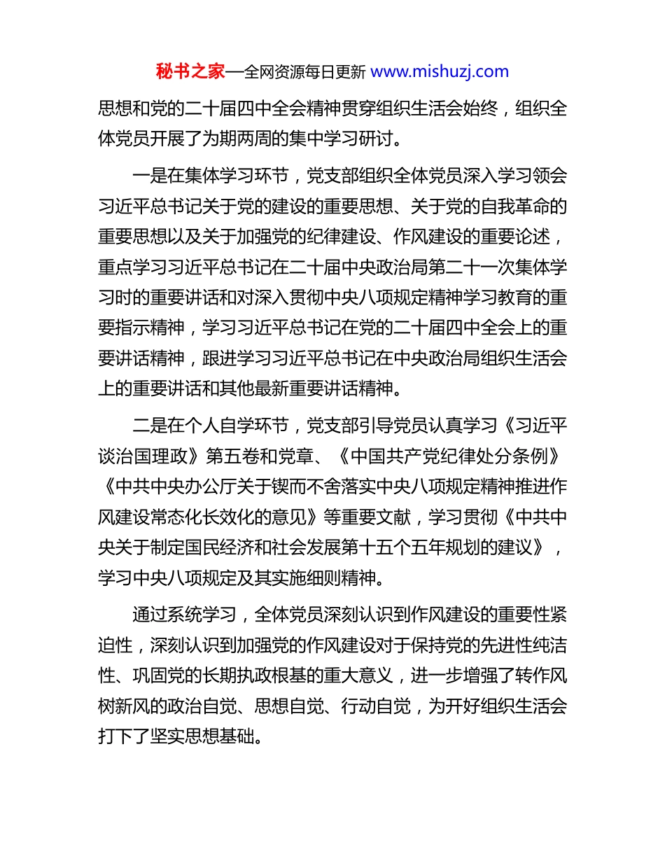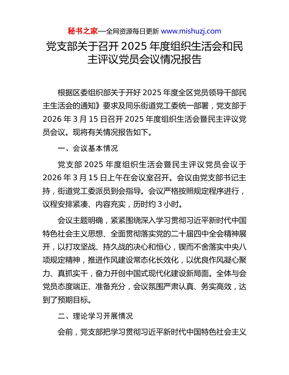 秘书之家—全网资源每日更新 www.mishuzj.com党支部关于召开 2025 年度组织生活会和民主评议党员会议情况报告根据区委组织部关于开好 2025 年度全区党员领导干部民主生活会的通知》要求及同乐街道党工委统一部署,党支部于2026 年 3 月 15 日召开 2025 年度组织生活会暨民主评议党员会议。现将有关情况报告如下。一、会议基本情况党支部 2025 年度组织生活会暨民主评议党员会议于2026 年 3 月 15 日上午在会议室召开。会议由党支部书记主持,街道党工委派员到会指导。会议严格按照规定程序进行,议程安排紧凑、内容充实,历时约 3 小时。会议主题明确,紧紧围绕深入学习贯彻习近平新时代中国特色社会主义思想、全面贯彻落实党的二十届四中全会精神展开,以打攻坚战、持久战的决心和恒心,锲而不舍落实中央八项规定精神,推进作风建设常态化长效化,以优良作风凝心聚力、真抓实干,奋力开创中国式现代化建设新局面。全体与会党员态度端正、准备充分,会议氛围严肃认真、务实高效,达到了预期目标。二、理论学习开展情况会前,党支部把学习贯彻习近平新时代中国特色社会主义秘书之家—全网资源每日更新 www.mishuzj.com思想和党的二十届四中全会精神贯穿组织生活会始终,组织全体党员开展了为期两周的集中学习研讨。一是在集体学习环节,党支部组织全体党员深入学习领会习近平总书记关于党的建设的重要思想、关于党的自我革命的重要思想以及关于加强党的纪律建设、作风建设的重要论述,重点学习习近平总书记在二十届中央政治局第二十一次集体学习时的重要讲话和对深入贯彻中央八项规定精神学习教育的重要指示精神,学习习近平总书记在党的二十届四中全会上的重要讲话精神,跟进学习习近平总书记在中央政治局组织生活会上的重要讲话和其他最新重要讲话精神。二是在个人自学环节,党支部引导党员认真学习《习近平谈治国理政》第五卷和党章、《中国共产党纪律处分条例》《中共中央办公厅关于锲而不舍落实中央八项规定精神推进作风建设常态化长效化的意见》等重要文献,学习贯彻《中共中央关于制定国民经济和社会发展第十五个五年规划的建议》,学习中央八项规定及其实施细则精神。通过系统学习,全体党员深刻认识到作风建设的重要性紧迫性,深刻认识到加强党的作风建设对于保持党的先进性纯洁性、巩固党的长期执政根基的重大意义,进一步增强了转作风树新风的政治自觉、思想自觉、行动自觉,为开好组织生活会打下了坚实思想基础。秘书之家—全网资源每日更新 www.mishuzj.com三、会前准备工作情况会前,党支部书记 XX 同志与街道党工委进行了充分沟通,汇报了组织生活会筹备情况,得到了上级党组织的指导和支持。党支部委员会高度重视会前准备工作,抓实抓好集体研讨和个人自学,广泛开展谈心谈话、征求意见等工作。一是在谈心谈话环节,党支部书记与支部委员之间、支部委员与党员之间、党员相互之间开展了深入谈心谈话,共计开展谈心谈话 56 人次。谈话内容紧扣组织生活会主题,既谈工作问题、也谈思想问题,既谈自身差距、也提醒对方不足,达到了沟通思想、交换意见、增进团结的目的。二是在征求意见环节,党支部通过发放征求意见表、设立意见箱、召开座谈会等多种形式,广泛征求党员群众对党支部班子及成员的意见建议,共收集各类意见建议 18 条,经梳理归纳为理论学习、工作作风、服务群众、制度执行等 4 个方面 12 条具体意见。党支部对照 2025 年度民主生活会主题,把开展深入贯彻中央八项规定精神学习教育情况作为对照检查的重要内容,组织党支部从加强理论武装、执行上级组织决定、严格组织生活、加强党员管理监督、做好群众工作、抓好自身建设等方面进行对照检查,组织党员从学习贯彻党的创新理论、加强党性锻炼、联系服务群众、发挥先锋模范作用、改作风树新风等方秘书之家—全网资源每日更新 www.mishuzj.com面查找差距不足,形成了支部班子对照检查材料和个人发言提纲,为开好组织生活会做好了充分准备。四、问题查摆情况会上,党支部书记 XX 同志首先代表党支部班子作对照检查,对照党章党规党纪,对照初心使命,对照 2025 年度组...