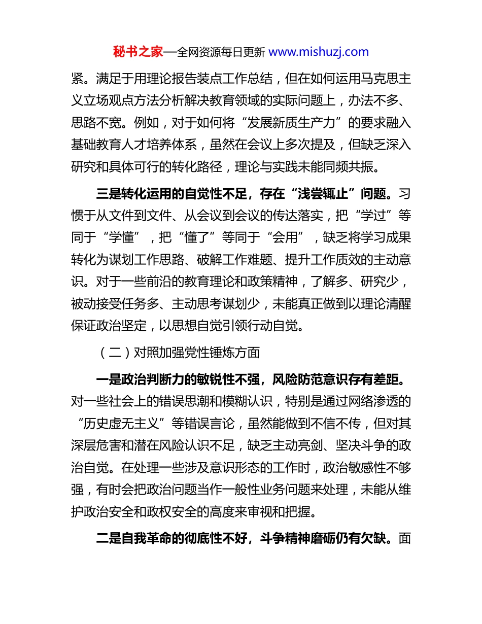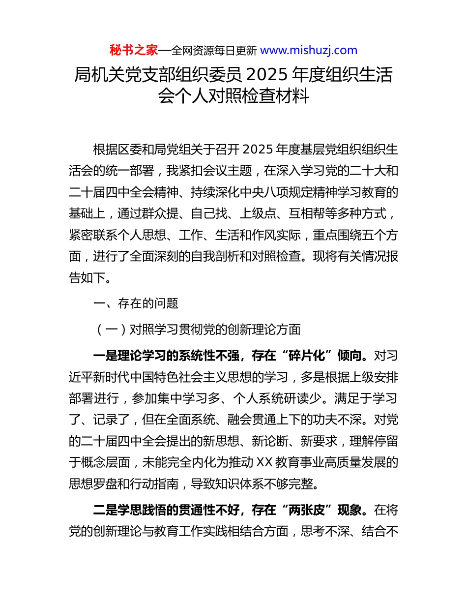 秘书之家—全网资源每日更新 www.mishuzj.com局机关党支部组织委员 2025 年度组织生活会个人对照检查材料根据区委和局党组关于召开 2025 年度基层党组织组织生活会的统一部署,我紧扣会议主题,在深入学习党的二十大和二十届四中全会精神、持续深化中央八项规定精神学习教育的基础上,通过群众提、自己找、上级点、互相帮等多种方式,紧密联系个人思想、工作、生活和作风实际,重点围绕五个方面,进行了全面深刻的自我剖析和对照检查。现将有关情况报告如下。一、存在的问题(一)对照学习贯彻党的创新理论方面一是理论学习的系统性不强,存在“碎片化”倾向。对习近平新时代中国特色社会主义思想的学习,多是根据上级安排部署进行,参加集中学习多、个人系统研读少。满足于学习了、记录了,但在全面系统、融会贯通上下的功夫不深。对党的二十届四中全会提出的新思想、新论断、新要求,理解停留于概念层面,未能完全内化为推动 XX 教育事业高质量发展的思想罗盘和行动指南,导致知识体系不够完整。二是学思践悟的贯通性不好,存在“两张皮”现象。在将党的创新理论与教育工作实践相结合方面,思考不深、结合不秘书之家—全网资源每日更新 www.mishuzj.com紧。满足于用理论报告装点工作总结,但在如何运用马克思主义立场观点方法分析解决教育领域的实际问题上,办法不多、思路不宽。例如,对于如何将“发展新质生产力”的要求融入基础教育人才培养体系,虽然在会议上多次提及,但缺乏深入研究和具体可行的转化路径,理论与实践未能同频共振。三是转化运用的自觉性不足,存在“浅尝辄止”问题。习惯于从文件到文件、从会议到会议的传达落实,把“学过”等同于“学懂”,把“懂了”等同于“会用”,缺乏将学习成果转化为谋划工作思路、破解工作难题、提升工作质效的主动意识。对于一些前沿的教育理论和政策精神,了解多、研究少,被动接受任务多、主动思考谋划少,未能真正做到以理论清醒保证政治坚定,以思想自觉引领行动自觉。(二)对照加强党性锤炼方面一是政治判断力的敏锐性不强,风险防范意识存有差距。对一些社会上的错误思潮和模糊认识,特别是通过网络渗透的“历史虚无主义”等错误言论,虽然能做到不信不传,但对其深层危害和潜在风险认识不足,缺乏主动亮剑、坚决斗争的政治自觉。在处理一些涉及意识形态的工作时,政治敏感性不够强,有时会把政治问题当作一般性业务问题来处理,未能从维护政治安全和政权安全的高度来审视和把握。二是自我革命的彻底性不好,斗争精神磨砺仍有欠缺。面秘书之家—全网资源每日更新 www.mishuzj.com对工作中的矛盾和困难,有时会产生畏难情绪和求稳心态,敢于斗争、善于斗争的劲头不足。对身边同志中存在的一些不良倾向和苗头性问题,有时碍于情面,不愿“红脸出汗”,批评与自我批评的武器运用得不充分、不经常。对照革命先辈“刀刃向内”的勇气,自身在思想深处革除“小我”、涵养“大我”的修炼还不到家,缺乏闻过则喜的胸襟和刮骨疗毒的决心。三是纪律规矩的执行性不足,日常言行约束偶有松懈。能够严格遵守党的政治纪律和政治规矩,在大是大非问题上始终保持头脑清醒、立场坚定,坚决维护民族团结、反对分裂。但在严格执行组织纪律和生活纪律等具体细节上,有时自我要求有所放松。例如,在参加某些非涉密工作会议时,偶尔会查看手机信息,反映出在任何场合都保持纪律严明性的自觉性不够,未能做到时时处处以最高标准严格要求自己。(三)对照联系服务群众方面一是深入基层的频率不够,调查研究存在“走马观花”。作为教育局机关干部,下到学校一线的次数虽然达到了规定要求,但真正沉下心来与一线教师、学生家长面对面交流的时间不多。调研活动有时程序化、路线化,听取学校领导汇报多,与普通教师、后勤职工的个别访谈少。满足于看到校园环境的整洁、教学秩序的井然,对教师队伍建设中存在的深层次困秘书之家—全网资源每日更新 www.mishuzj.com难、学生成长中面临的实际烦恼,了解得不深不透。二是服务群众的效率不高,解决诉求存在“时差温差”。对基层学校和师生反映的问题,虽然能够做到接诉即办,但在办理的效率和效果...