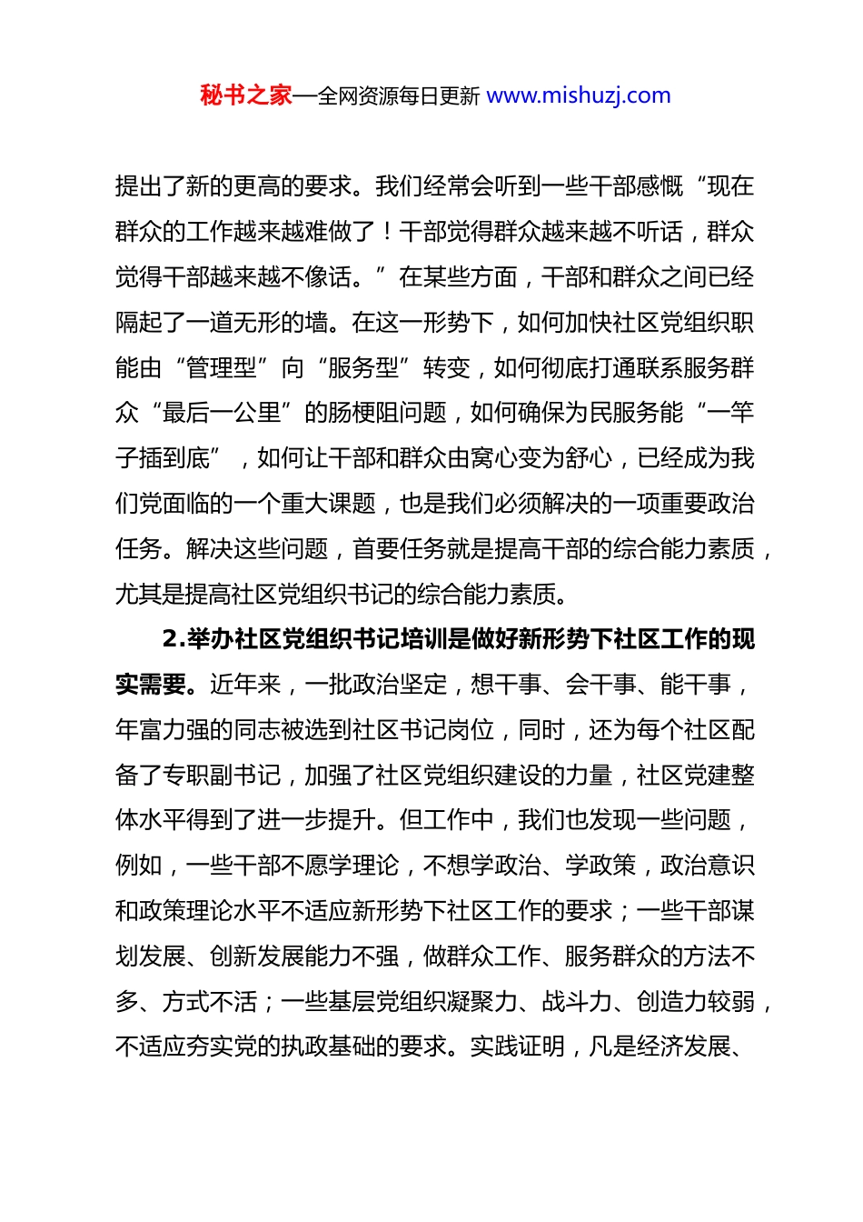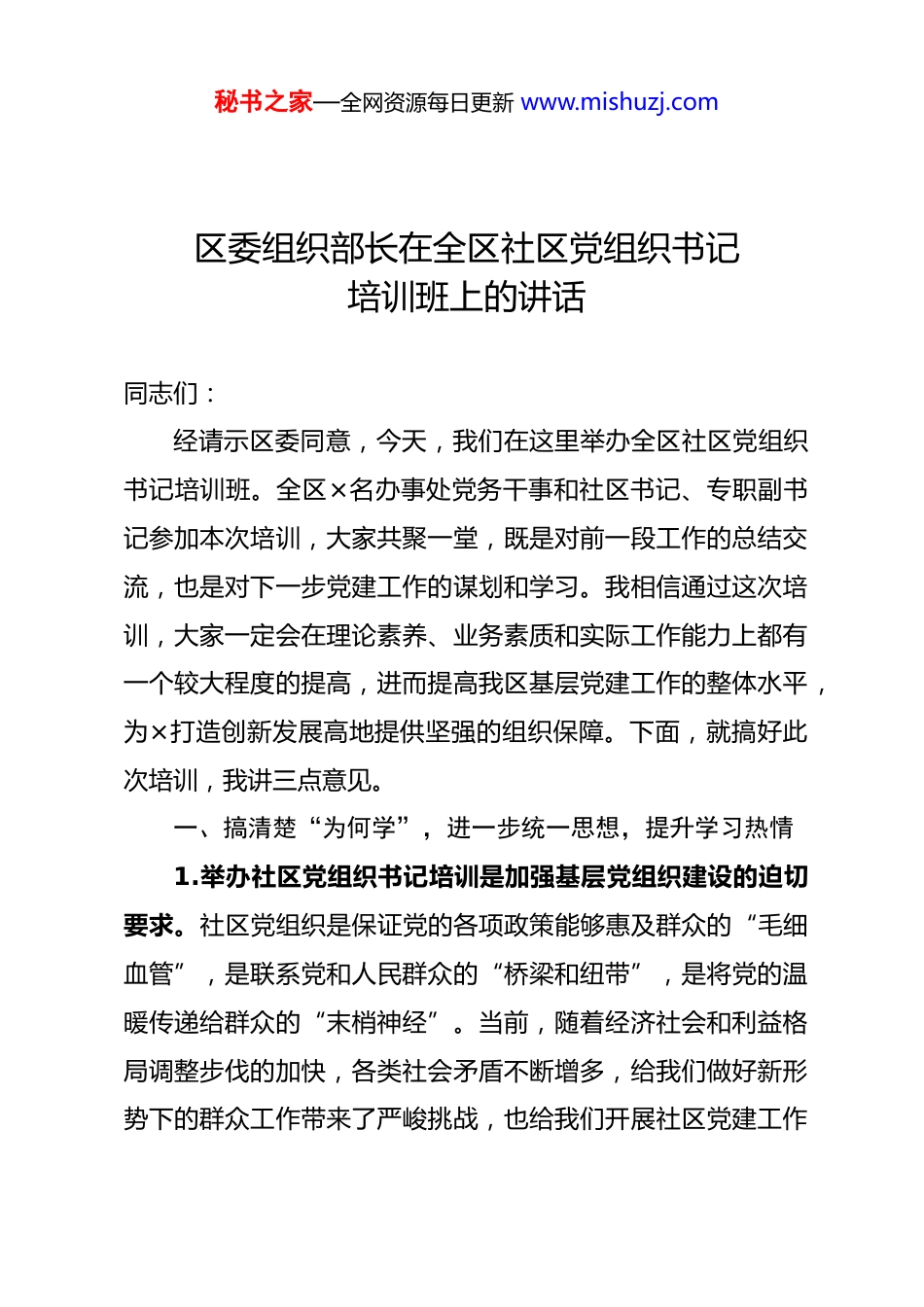 秘书之家—全网资源每日更新 www.mishuzj.com区委组织部长在全区社区党组织书记培训班上的讲话同志们:经请示区委同意,今天,我们在这里举办全区社区党组织书记培训班。全区×名办事处党务干事和社区书记、专职副书记参加本次培训,大家共聚一堂,既是对前一段工作的总结交流,也是对下一步党建工作的谋划和学习。我相信通过这次培训,大家一定会在理论素养、业务素质和实际工作能力上都有一个较大程度的提高,进而提高我区基层党建工作的整体水平,为×打造创新发展高地提供坚强的组织保障。下面,就搞好此次培训,我讲三点意见。一、搞清楚“为何学”,进一步统一思想,提升学习热情1.举办社区党组织书记培训是加强基层党组织建设的迫切要求。社区党组织是保证党的各项政策能够惠及群众的“毛细血管”,是联系党和人民群众的“桥梁和纽带”,是将党的温暖传递给群众的“末梢神经”。当前,随着经济社会和利益格局调整步伐的加快,各类社会矛盾不断增多,给我们做好新形势下的群众工作带来了严峻挑战,也给我们开展社区党建工作秘书之家—全网资源每日更新 www.mishuzj.com提出了新的更高的要求。我们经常会听到一些干部感慨“现在群众的工作越来越难做了!干部觉得群众越来越不听话,群众觉得干部越来越不像话。”在某些方面,干部和群众之间已经隔起了一道无形的墙。在这一形势下,如何加快社区党组织职能由“管理型”向“服务型”转变,如何彻底打通联系服务群众“最后一公里”的肠梗阻问题,如何确保为民服务能“一竿子插到底”,如何让干部和群众由窝心变为舒心,已经成为我们党面临的一个重大课题,也是我们必须解决的一项重要政治任务。解决这些问题,首要任务就是提高干部的综合能力素质,尤其是提高社区党组织书记的综合能力素质。2.举办社区党组织书记培训是做好新形势下社区工作的现实需要。近年来,一批政治坚定,想干事、会干事、能干事,年富力强的同志被选到社区书记岗位,同时,还为每个社区配备了专职副书记,加强了社区党组织建设的力量,社区党建整体水平得到了进一步提升。但工作中,我们也发现一些问题,例如,一些干部不愿学理论,不想学政治、学政策,政治意识和政策理论水平不适应新形势下社区工作的要求;一些干部谋划发展、创新发展能力不强,做群众工作、服务群众的方法不多、方式不活;一些基层党组织凝聚力、战斗力、创造力较弱,不适应夯实党的执政基础的要求。实践证明,凡是经济发展、秘书之家—全网资源每日更新 www.mishuzj.com社会稳定、群众安居乐业的社区,都有个好的党组织和好书记。因此,举办培训班的目的就是全面提升基层党组织书记的综合素质,努力锻造一支素质高、作风正、能力强的社区书记队伍。3.举办社区党组织书记培训是确保社区工作取得实效的有效措施。近年来,我区通过创新载体,建立机制,社区党建水平和服务居民的水平得到全面提升。“基层四项基础制度和机制”建设,推动了作风建设持续改善,夯实了基层工作基础;创新实施的基层服务型党组织建设“3+1”工作法,把社区党建与社区服务有机融合,进一步提升了社区党组织的服务水平;“红色系列工程”的实施,为全面落实市委、促进社区党建整体水平提升起到了积极的推动作用;社区干部后备人才储备机制,为社区干部、尤其是社区书记培育了一支后备力量。这些活动和机制运行的顺畅与否,取得的成效大小,离不开在座各位社区党组织书记的参与,更离不开大家的推动。所以,作为社区书记,只有不断提高综合能力素质,才能使这些工作落到实处,取得实效。二、弄明白“学什么”,进一步理清思路,增强工作实效这次培训班主题明确,形式多样,内容丰富,有理论知识讲授、现场实地观摩和先进社区党组织书记经验交流,希望大家能够珍惜难得的学习机会,真正弄明白“学什么”的问题,秘书之家—全网资源每日更新 www.mishuzj.com做到突出重点作思考、有的放矢抓学习,使此次培训活动成为一个提高认识、统一思想的过程,成为一个开阔视野、增长知识的过程,成为一个理清思路、提升能力的过程。1.准确定位,提升把握大局能力。社区党组织书记在社区处于统揽全局、协调各方的核心位置...