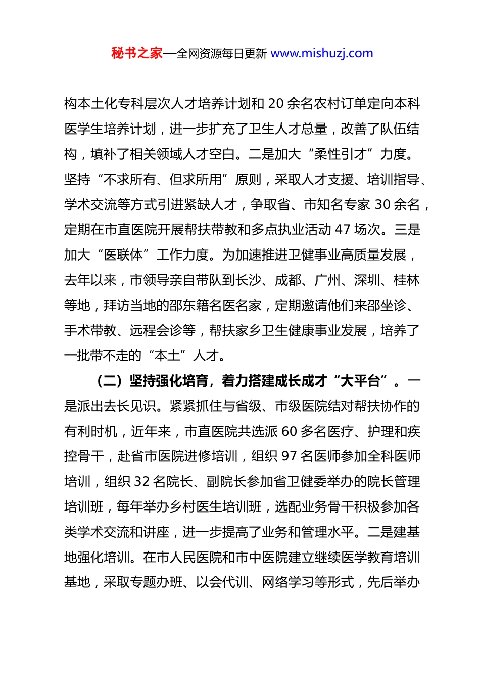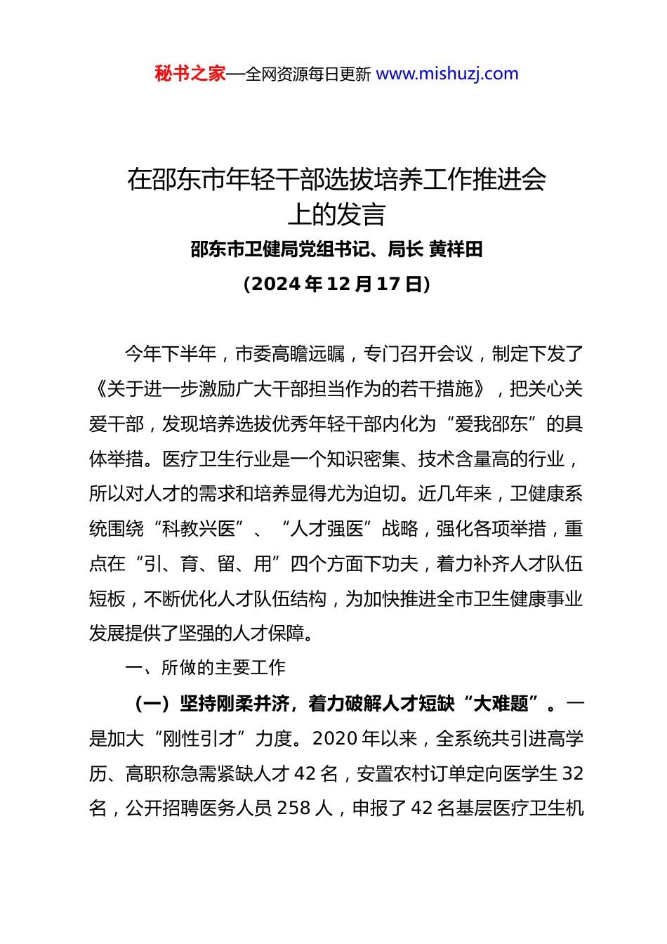 秘书之家—全网资源每日更新 www.mishuzj.com在邵东市年轻干部选拔培养工作推进会上的发言邵东市卫健局党组书记、局长 黄祥田(2024 年 12 月 17 日)今年下半年,市委高瞻远瞩,专门召开会议,制定下发了《关于进一步激励广大干部担当作为的若干措施》,把关心关爱干部,发现培养选拔优秀年轻干部内化为“爱我邵东”的具体举措。医疗卫生行业是一个知识密集、技术含量高的行业,所以对人才的需求和培养显得尤为迫切。近几年来,卫健康系统围绕“科教兴医”、“人才强医”战略,强化各项举措,重点在“引、育、留、用”四个方面下功夫,着力补齐人才队伍短板,不断优化人才队伍结构,为加快推进全市卫生健康事业发展提供了坚强的人才保障。一、所做的主要工作(一)坚持刚柔并济,着力破解人才短缺“大难题”。一是加大“刚性引才”力度。2020 年以来,全系统共引进高学历、高职称急需紧缺人才 42 名,安置农村订单定向医学生 32名,公开招聘医务人员 258 人,申报了 42 名基层医疗卫生机秘书之家—全网资源每日更新 www.mishuzj.com构本土化专科层次人才培养计划和 20 余名农村订单定向本科医学生培养计划,进一步扩充了卫生人才总量,改善了队伍结构,填补了相关领域人才空白。二是加大“柔性引才”力度。坚持“不求所有、但求所用”原则,采取人才支援、培训指导、学术交流等方式引进紧缺人才,争取省、市知名专家 30 余名,定期在市直医院开展帮扶带教和多点执业活动 47 场次。三是加大“医联体”工作力度。为加速推进卫健事业高质量发展,去年以来,市领导亲自带队到长沙、成都、广州、深圳、桂林等地,拜访当地的邵东籍名医名家,定期邀请他们来邵坐诊、手术带教、远程会诊等,帮扶家乡卫生健康事业发展,培养了一批带不走的“本土”人才。(二)坚持强化培育,着力搭建成长成才“大平台”。一是派出去长见识。紧紧抓住与省级、市级医院结对帮扶协作的有利时机,近年来,市直医院共选派 60 多名医疗、护理和疾控骨干,赴省市医院进修培训,组织 97 名医师参加全科医师培训,组织 32 名院长、副院长参加省卫健委举办的院长管理培训班,每年举办乡村医生培训班,选配业务骨干积极参加各类学术交流和讲座,进一步提高了业务和管理水平。二是建基地强化培训。在市人民医院和市中医院建立继续医学教育培训基地,采取专题办班、以会代训、网络学习等形式,先后举办秘书之家—全网资源每日更新 www.mishuzj.com中医适宜技术、急症急救、中医“治未病”培训和新录聘医生岗前培训,充分搭建医务人员学习交流平台,开阔眼界,增长技能。三是扎实举办岗位练兵活动。分年度举办中医适宜技术、护理技能、急症急救等岗位练兵和技术比武活动,通过以赛促学、以赛促练,提升技术水平。(三)坚持结对帮扶,着力打造以城带乡“新模式”。一是远程医疗全覆盖。全市 26 所乡镇卫生院(街道社区卫生服务中心)均与本市两所三级医院建立了远程医疗平台,开展“一对一”远程会诊和业务指导。二是县域医共体惠基层。以市人民医院和市中医医院为龙头,划片包干基层医疗机构组建区域医共体,开展人才服务和专家下乡服务活动。市直医疗单位每年都派出 70 余人到各乡镇卫生院开展为期 3 个月至半年的坐诊服务,采取查房带教、手术指导等方式,与乡村两级医师结成“师徒关系”或“帮扶对子”,通过“传、帮、带”,乡村两级医务人员的业务水平得到显著提高。(四)坚持评优选先,着力锻造优秀人才“先锋队”。一是加强对人才的政治引领。加强人才思想政治教育,充分发挥基层党组织的战斗堡垒作用和党员先锋模范作用,积极推荐符合条件的优秀人才为省、市、县“两代表一委员”人选,提升优秀人才的参政议政水平。二是加强优秀人才表彰奖励。培养秘书之家—全网资源每日更新 www.mishuzj.com和选拔省级重点学科建设领军人才 18 人、市级领军人才 9 名,获得省部级奖励 3 人、市厅级奖励 3 人,提拔为科级领导干部6 人。三是开展名医工作室创建评选。市人民医院已经授牌名医工作室 4 个,市中医医院授牌名医工作室 2 个,规范建设名中医传承工作室 12 个...