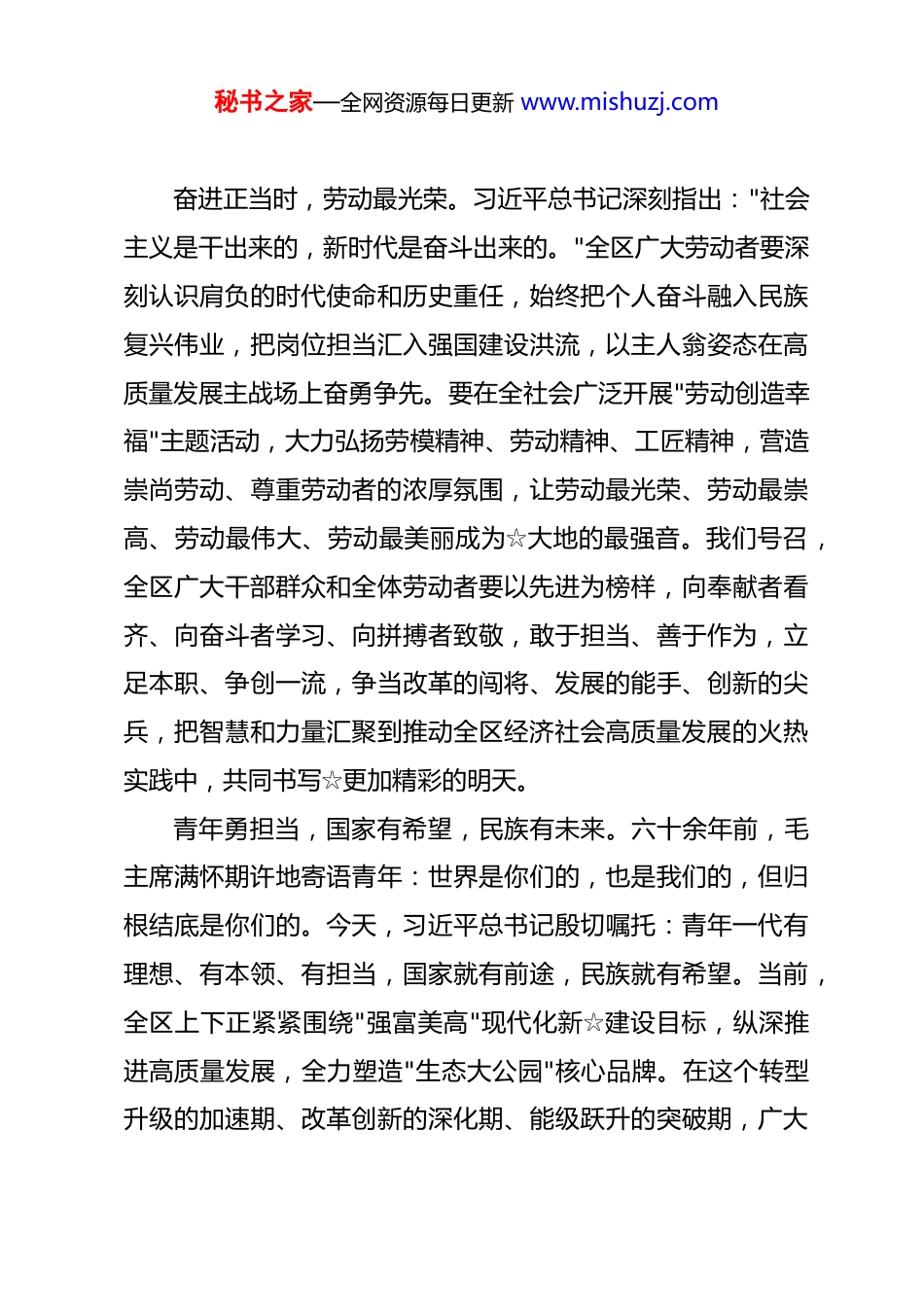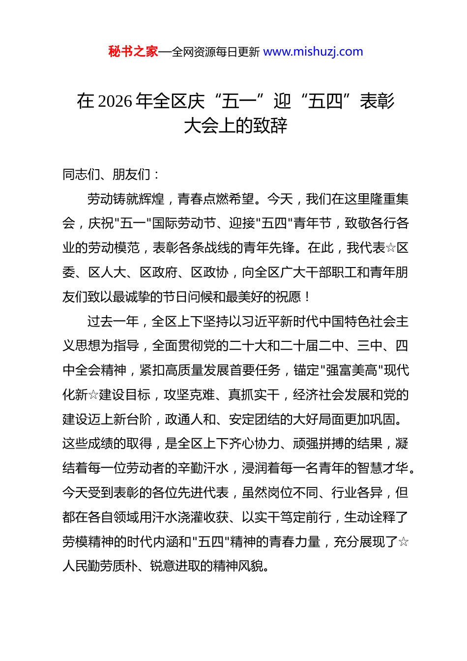 秘书之家—全网资源每日更新 www.mishuzj.com在 2026 年全区庆“五一”迎“五四”表彰大会上的致辞 同志们、朋友们:劳动铸就辉煌,青春点燃希望。今天,我们在这里隆重集会,庆祝"五一"国际劳动节、迎接"五四"青年节,致敬各行各业的劳动模范,表彰各条战线的青年先锋。在此,我代表☆区委、区人大、区政府、区政协,向全区广大干部职工和青年朋友们致以最诚挚的节日问候和最美好的祝愿!过去一年,全区上下坚持以习近平新时代中国特色社会主义思想为指导,全面贯彻党的二十大和二十届二中、三中、四中全会精神,紧扣高质量发展首要任务,锚定"强富美高"现代化新☆建设目标,攻坚克难、真抓实干,经济社会发展和党的建设迈上新台阶,政通人和、安定团结的大好局面更加巩固。这些成绩的取得,是全区上下齐心协力、顽强拼搏的结果,凝结着每一位劳动者的辛勤汗水,浸润着每一名青年的智慧才华。今天受到表彰的各位先进代表,虽然岗位不同、行业各异,但都在各自领域用汗水浇灌收获、以实干笃定前行,生动诠释了劳模精神的时代内涵和"五四"精神的青春力量,充分展现了☆人民勤劳质朴、锐意进取的精神风貌。秘书之家—全网资源每日更新 www.mishuzj.com奋进正当时,劳动最光荣。习近平总书记深刻指出:"社会主义是干出来的,新时代是奋斗出来的。"全区广大劳动者要深刻认识肩负的时代使命和历史重任,始终把个人奋斗融入民族复兴伟业,把岗位担当汇入强国建设洪流,以主人翁姿态在高质量发展主战场上奋勇争先。要在全社会广泛开展"劳动创造幸福"主题活动,大力弘扬劳模精神、劳动精神、工匠精神,营造崇尚劳动、尊重劳动者的浓厚氛围,让劳动最光荣、劳动最崇高、劳动最伟大、劳动最美丽成为☆大地的最强音。我们号召,全区广大干部群众和全体劳动者要以先进为榜样,向奉献者看齐、向奋斗者学习、向拼搏者致敬,敢于担当、善于作为,立足本职、争创一流,争当改革的闯将、发展的能手、创新的尖兵,把智慧和力量汇聚到推动全区经济社会高质量发展的火热实践中,共同书写☆更加精彩的明天。青年勇担当,国家有希望,民族有未来。六十余年前,毛主席满怀期许地寄语青年:世界是你们的,也是我们的,但归根结底是你们的。今天,习近平总书记殷切嘱托:青年一代有理想、有本领、有担当,国家就有前途,民族就有希望。当前,全区上下正紧紧围绕"强富美高"现代化新☆建设目标,纵深推进高质量发展,全力塑造"生态大公园"核心品牌。在这个转型升级的加速期、改革创新的深化期、能级跃升的突破期,广大秘书之家—全网资源每日更新 www.mishuzj.com青年是最富朝气、最具活力的生力军。希望大家胸怀远大理想,自觉做习近平新时代中国特色社会主义思想的坚定信仰者和忠实践行者,增强"四个意识"、坚定"四个自信"、做到"两个维护",立大志、明大德、成大才、担大任,做有志气、有骨气、有底气的新时代好青年;希望大家涵养文明风尚,带头践行社会主义核心价值观,自觉传承中华优秀传统美德,积极参与志愿服务和社会公益,以青春之我传递正能量、弘扬真善美;希望大家勇立时代潮头,保持敢为人先的锐气、革故鼎新的勇气、蓬勃向上的朝气,积极投身创新创业大潮,在产业升级中勇攀高峰,在乡村振兴中大展身手,在基层治理中奉献才智,以青春之名书写☆高质量发展的精彩答卷。同志们、朋友们,时代洪流奔涌向前,奋斗号角催人出征让我们在习近平新时代中国特色社会主义思想的科学指引下,以劳动托起梦想,以奋斗成就未来,争做新时代的奋进者、搏击者、奉献者,在推进中国式现代化☆新实践的壮阔征程中,书写更加恢宏的奋斗篇章!