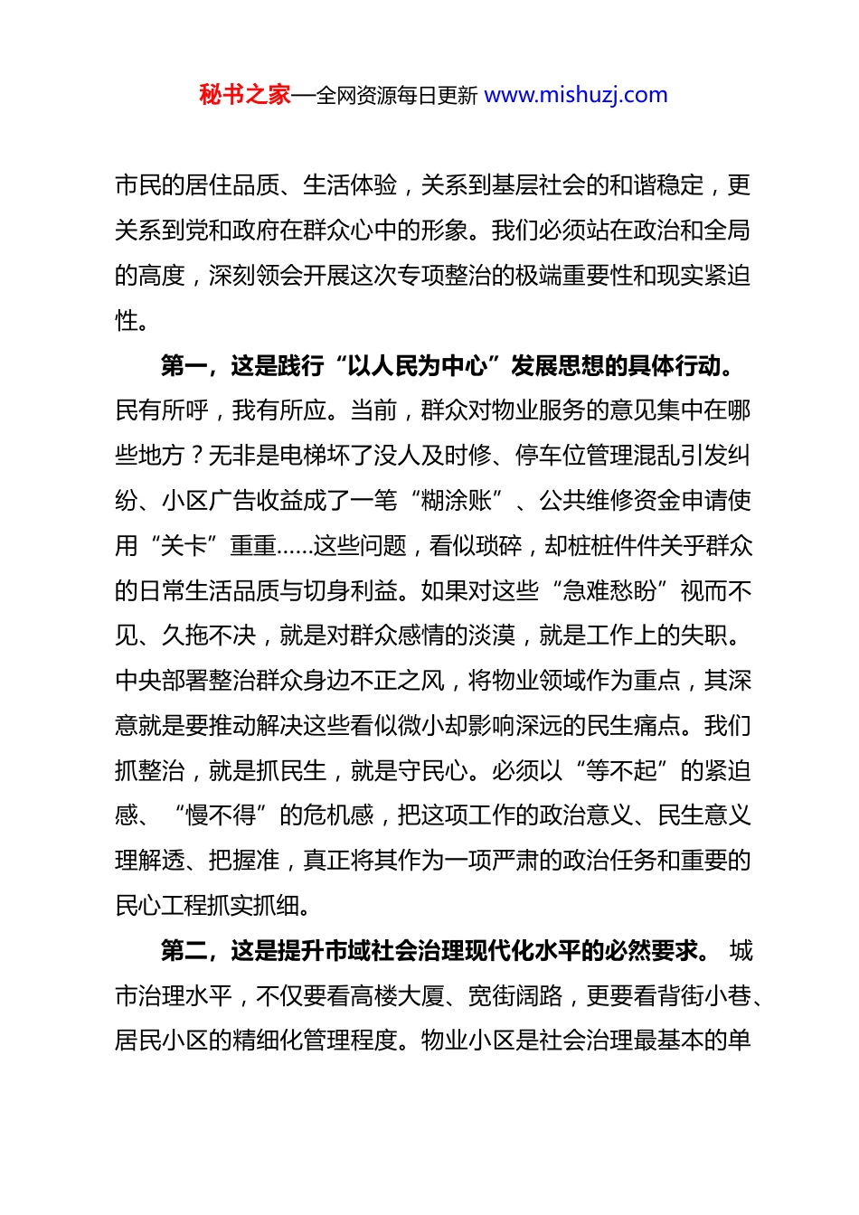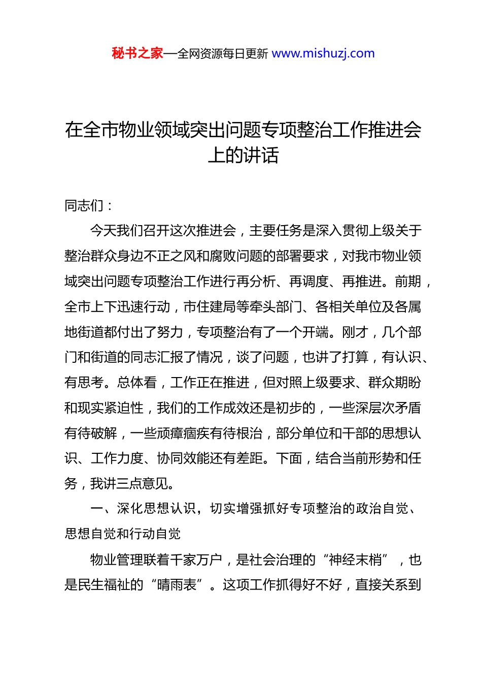 秘书之家—全网资源每日更新 www.mishuzj.com在全市物业领域突出问题专项整治工作推进会上的讲话同志们:今天我们召开这次推进会,主要任务是深入贯彻上级关于整治群众身边不正之风和腐败问题的部署要求,对我市物业领域突出问题专项整治工作进行再分析、再调度、再推进。前期,全市上下迅速行动,市住建局等牵头部门、各相关单位及各属地街道都付出了努力,专项整治有了一个开端。刚才,几个部门和街道的同志汇报了情况,谈了问题,也讲了打算,有认识、有思考。总体看,工作正在推进,但对照上级要求、群众期盼和现实紧迫性,我们的工作成效还是初步的,一些深层次矛盾有待破解,一些顽瘴痼疾有待根治,部分单位和干部的思想认识、工作力度、协同效能还有差距。下面,结合当前形势和任务,我讲三点意见。一、深化思想认识,切实增强抓好专项整治的政治自觉、思想自觉和行动自觉物业管理联着千家万户,是社会治理的“神经末梢”,也是民生福祉的“晴雨表”。这项工作抓得好不好,直接关系到秘书之家—全网资源每日更新 www.mishuzj.com市民的居住品质、生活体验,关系到基层社会的和谐稳定,更关系到党和政府在群众心中的形象。我们必须站在政治和全局的高度,深刻领会开展这次专项整治的极端重要性和现实紧迫性。第一,这是践行“以人民为中心”发展思想的具体行动。 民有所呼,我有所应。当前,群众对物业服务的意见集中在哪些地方?无非是电梯坏了没人及时修、停车位管理混乱引发纠纷、小区广告收益成了一笔“糊涂账”、公共维修资金申请使用“关卡”重重……这些问题,看似琐碎,却桩桩件件关乎群众的日常生活品质与切身利益。如果对这些“急难愁盼”视而不见、久拖不决,就是对群众感情的淡漠,就是工作上的失职。中央部署整治群众身边不正之风,将物业领域作为重点,其深意就是要推动解决这些看似微小却影响深远的民生痛点。我们抓整治,就是抓民生,就是守民心。必须以“等不起”的紧迫感、“慢不得”的危机感,把这项工作的政治意义、民生意义理解透、把握准,真正将其作为一项严肃的政治任务和重要的民心工程抓实抓细。第二,这是提升市域社会治理现代化水平的必然要求。 城市治理水平,不仅要看高楼大厦、宽街阔路,更要看背街小巷、居民小区的精细化管理程度。物业小区是社会治理最基本的单秘书之家—全网资源每日更新 www.mishuzj.com元,这个单元如果失序、失管,整个城市的治理体系就会出现“底板不牢”的风险。现实中,一些小区矛盾多发、投诉不断,根源就在于物业服务企业、业主委员会、相关职能部门以及属地街道社区的职责边界不清、协同不畅,导致治理机制失灵甚至空转。我们开展这次专项整治,绝不仅仅是为了处理几家物业公司、解决几个具体投诉,其更深层的目标,是通过集中破解一批长期存在的体制性障碍、机制性梗阻,推动物业管理从“失序”走向“有序”,探索构建党建引领下,政府监管、市场调节、社会协同、居民自治良性互动的基层治理新格局,从而夯实城市治理的根基。第三,这是推动全面从严治党向基层延伸的重要抓手。 物业管理表面看是市场行为、民事关系,但其背后往往牵扯基层的权力运行、部门的监管责任,甚至可能隐藏着不正之风和腐败问题。现实中,为什么一些明显违规的物业行为长期得不到纠正?为什么一些群众反映强烈的问题迟迟得不到解决?这背后,有没有监管部门的“选择性执法”?有没有基层干部的“懒政怠政”?有没有权力与资本的“不当勾连”?答案是,可能性不能排除。专项整治,就是要坚持问题导向,既要“治病树”——纠正物业企业的违法违规行为,更要“护森林”——深挖细查其背后可能存在的履职不力、执法不公、利益输送秘书之家—全网资源每日更新 www.mishuzj.com等作风和腐败问题。这既是净化行业生态的需要,也是净化基层政治生态、推动全面从严治党责任在“最后一公里”落地生根的生动实践,要让群众在正风肃纪反腐中感受到公平正义。二、聚焦突出问题,准确把握专项整治的主攻方向与着力重点专项整治不能“眉毛胡子一把抓”,必须聚焦要害、精准发力。从前期摸排和群众反映看,当前我市物业领域的矛盾和问题,主要集...