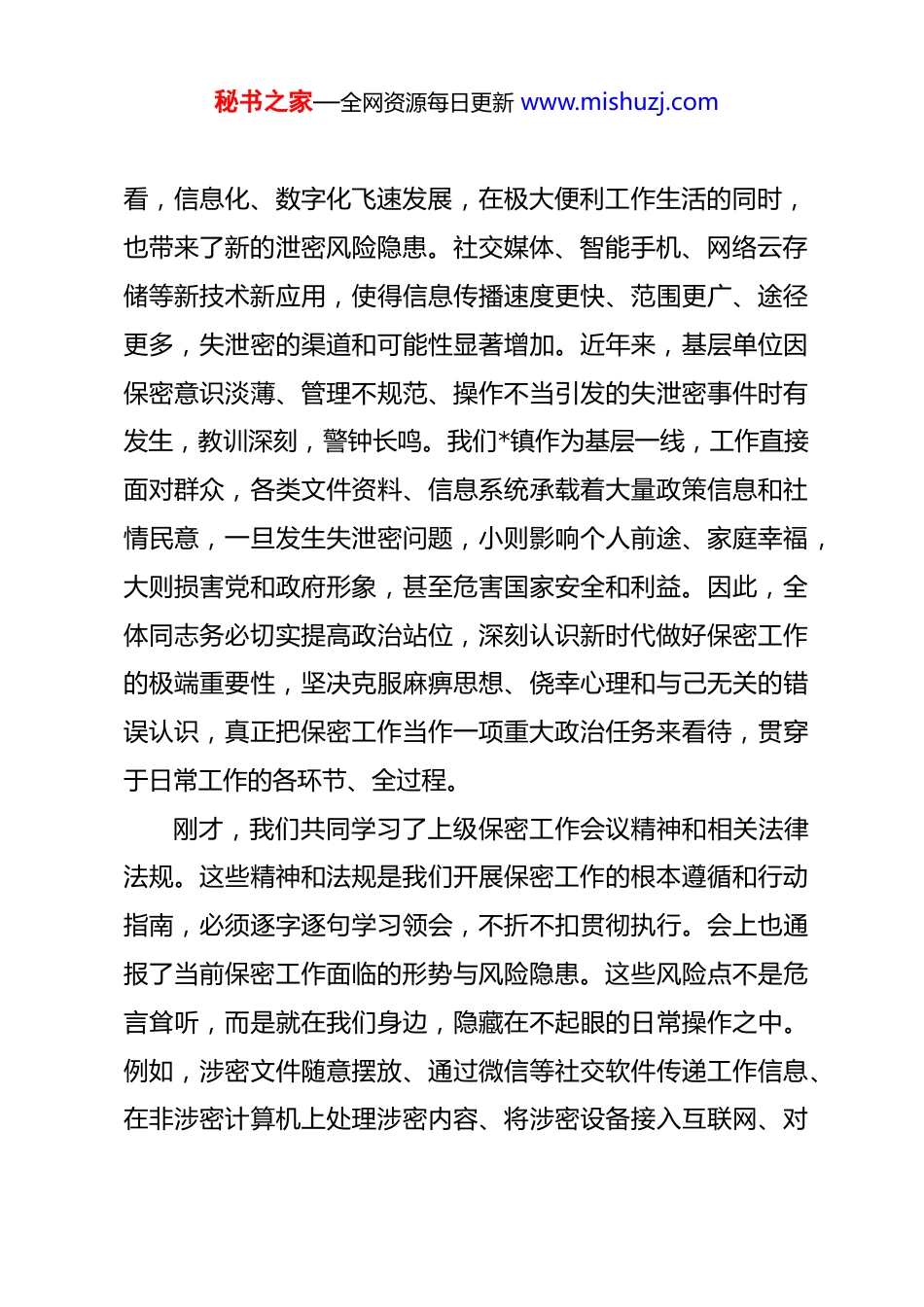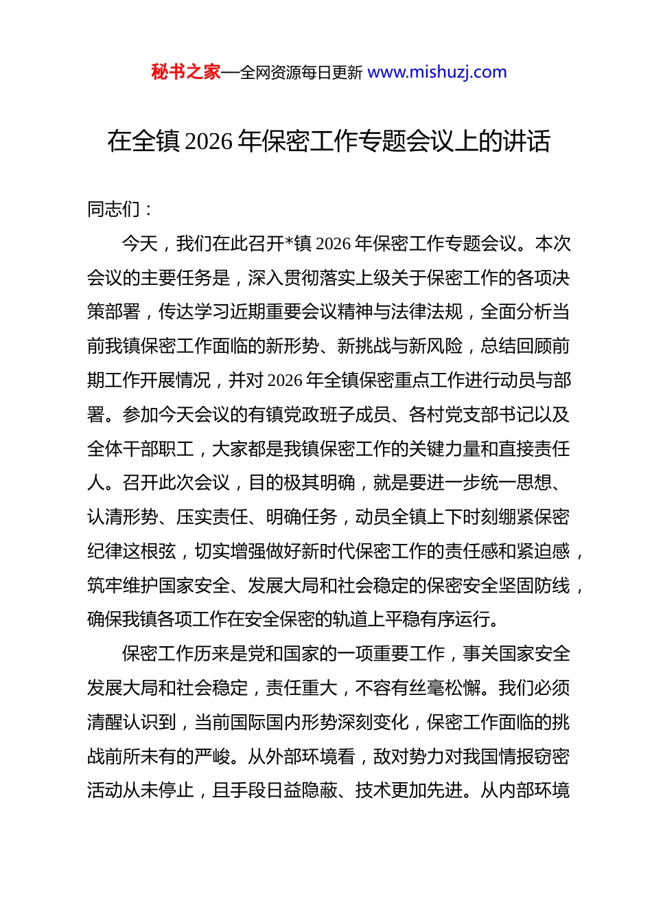 秘书之家—全网资源每日更新 www.mishuzj.com在全镇 2026 年保密工作专题会议上的讲话 同志们:今天,我们在此召开*镇 2026 年保密工作专题会议。本次会议的主要任务是,深入贯彻落实上级关于保密工作的各项决策部署,传达学习近期重要会议精神与法律法规,全面分析当前我镇保密工作面临的新形势、新挑战与新风险,总结回顾前期工作开展情况,并对 2026 年全镇保密重点工作进行动员与部署。参加今天会议的有镇党政班子成员、各村党支部书记以及全体干部职工,大家都是我镇保密工作的关键力量和直接责任人。召开此次会议,目的极其明确,就是要进一步统一思想、认清形势、压实责任、明确任务,动员全镇上下时刻绷紧保密纪律这根弦,切实增强做好新时代保密工作的责任感和紧迫感,筑牢维护国家安全、发展大局和社会稳定的保密安全坚固防线,确保我镇各项工作在安全保密的轨道上平稳有序运行。保密工作历来是党和国家的一项重要工作,事关国家安全发展大局和社会稳定,责任重大,不容有丝毫松懈。我们必须清醒认识到,当前国际国内形势深刻变化,保密工作面临的挑战前所未有的严峻。从外部环境看,敌对势力对我国情报窃密活动从未停止,且手段日益隐蔽、技术更加先进。从内部环境秘书之家—全网资源每日更新 www.mishuzj.com看,信息化、数字化飞速发展,在极大便利工作生活的同时,也带来了新的泄密风险隐患。社交媒体、智能手机、网络云存储等新技术新应用,使得信息传播速度更快、范围更广、途径更多,失泄密的渠道和可能性显著增加。近年来,基层单位因保密意识淡薄、管理不规范、操作不当引发的失泄密事件时有发生,教训深刻,警钟长鸣。我们*镇作为基层一线,工作直接面对群众,各类文件资料、信息系统承载着大量政策信息和社情民意,一旦发生失泄密问题,小则影响个人前途、家庭幸福,大则损害党和政府形象,甚至危害国家安全和利益。因此,全体同志务必切实提高政治站位,深刻认识新时代做好保密工作的极端重要性,坚决克服麻痹思想、侥幸心理和与己无关的错误认识,真正把保密工作当作一项重大政治任务来看待,贯穿于日常工作的各环节、全过程。刚才,我们共同学习了上级保密工作会议精神和相关法律法规。这些精神和法规是我们开展保密工作的根本遵循和行动指南,必须逐字逐句学习领会,不折不扣贯彻执行。会上也通报了当前保密工作面临的形势与风险隐患。这些风险点不是危言耸听,而是就在我们身边,隐藏在不起眼的日常操作之中。例如,涉密文件随意摆放、通过微信等社交软件传递工作信息、在非涉密计算机上处理涉密内容、将涉密设备接入互联网、对秘书之家—全网资源每日更新 www.mishuzj.com废旧涉密载体处置不规范等等,都可能成为泄密的源头。我们前期对全镇保密工作进行了总结,总的来说,全镇干部职工保密意识有所增强,制度框架初步建立,但仍然存在责任压实不到位、日常管理有漏洞、宣传教育不深入、技术防范能力薄弱等突出问题。这些问题必须引起我们高度警觉,并在接下来的工作中下大力气加以解决。做好 2026 年全镇保密工作,必须坚持问题导向、目标导向、结果导向,突出重点,狠抓落实。在此,我对全镇保密工作提出以下四点具体要求:一要强化思想认识,牢固树立“保密工作无小事”的理念。思想是行动的先导。保密意识不强是最大的安全隐患。全镇上下,特别是领导干部和涉密人员,必须严守政治纪律和政治规矩,切实增强保密防范意识。一是要深刻理解保密工作与国家安全、与每个人切身利益的紧密联系,从思想深处筑牢防线,做到时时、事事、处处讲保密、懂保密、会保密。二是要摒弃“基层无密可保”的错误观念,认识到任何岗位都可能产生、接触国家秘密和工作秘密,任何疏忽都可能酿成大祸。三是要常态化开展保密知识学习和警示教育,通过观看警示教育片、剖析典型案例、学习保密法规等多种形式,让“泄密就是犯罪”“保密就是保国家安全、保家庭幸福、保个人前途”的观秘书之家—全网资源每日更新 www.mishuzj.com念深入人心,实现从“要我保密”到“我要保密”“我会保密”的根本转变。二要压实工作责任,严格落实保密工作责任制。责任落实是保密...