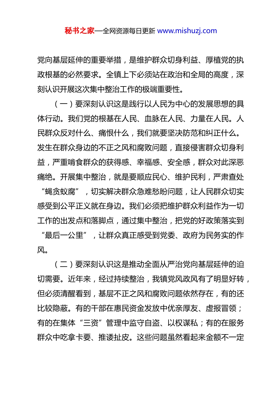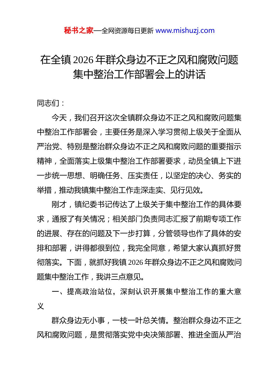 秘书之家—全网资源每日更新 www.mishuzj.com在全镇 2026 年群众身边不正之风和腐败问题集中整治工作部署会上的讲话 同志们:今天,我们召开这次全镇群众身边不正之风和腐败问题集中整治工作部署会,主要任务是深入学习贯彻上级关于全面从严治党、特别是整治群众身边不正之风和腐败问题的重要指示精神,全面落实上级集中整治工作部署要求,动员全镇上下进一步统一思想、明确任务、压实责任,以坚定的决心、务实的举措,推动我镇集中整治工作走深走实、见行见效。刚才,镇纪委书记传达了上级关于集中整治工作的具体要求,通报了有关情况;相关部门负责同志汇报了前期专项工作的进展、存在的问题及下一步打算,分管领导也作了具体的安排和部署,讲得都很到位,我完全同意,希望大家认真抓好贯彻落实。下面,就抓好我镇 2026 年群众身边不正之风和腐败问题集中整治工作,我讲三点意见。一、提高政治站位,深刻认识开展集中整治工作的重大意义群众身边无小事,一枝一叶总关情。整治群众身边不正之风和腐败问题,是贯彻落实党中央决策部署、推进全面从严治秘书之家—全网资源每日更新 www.mishuzj.com党向基层延伸的重要举措,是维护群众切身利益、厚植党的执政根基的必然要求。全镇上下必须站在政治和全局的高度,深刻认识开展这次集中整治工作的极端重要性。(一)要深刻认识这是践行以人民为中心的发展思想的具体行动。我们党的根基在人民、血脉在人民、力量在人民。人民群众反对什么、痛恨什么,我们就要坚决防范和纠正什么。发生在群众身边的不正之风和腐败问题,直接侵害群众切身利益,严重啃食群众的获得感、幸福感、安全感,群众对此深恶痛绝。开展集中整治,就是要顺应民心、维护民利,严肃查处“蝇贪蚁腐”,切实解决群众急难愁盼问题,让人民群众切实感受到公平正义就在身边。我们必须把维护群众利益作为一切工作的出发点和落脚点,通过集中整治,把党的好政策落实到“最后一公里”,让群众真正感受到党委、政府为民务实的作风。(二)要深刻认识这是推动全面从严治党向基层延伸的迫切需要。近年来,经过持续整治,我镇党风政风有了明显好转,但必须清醒看到,基层不正之风和腐败问题依然存在,有的还比较隐蔽。有的干部在惠民资金发放中优亲厚友、虚报冒领;有的在集体“三资”管理中监守自盗、以权谋私;有的在服务群众中吃拿卡要、推诿扯皮。这些问题虽然看起来金额不一定秘书之家—全网资源每日更新 www.mishuzj.com很大,级别不一定很高,但危害极大,严重损害党群干群关系,严重侵蚀党的执政基础。如果不坚决整治,就会像“温水煮青蛙”一样,逐步消解群众对我们的信任。我们必须保持“赶考”的清醒和坚定,把严的基调、严的措施、严的氛围长期坚持下去,坚决清除侵害群众利益的“毒瘤”。(三)要深刻认识这是优化基层政治生态、促进高质量发展的重要保障。当前,我镇正处于高质量发展的关键时期,各项改革发展的任务繁重,需要一个风清气正、干事创业的良好环境。群众身边的不正之风和腐败问题,不仅扰乱正常的经济社会秩序,破坏公平正义,更会严重挫伤干部群众的积极性,阻碍各项事业的发展。比如,在农村集体资产资源交易中如果存在暗箱操作,不仅造成集体资产流失,还会引发群众不满,影响社会稳定。开展集中整治,就是要铲除阻碍发展的“绊脚石”,净化基层政治生态,营造公平竞争的市场环境和廉洁高效的政务环境,为我镇经济社会发展提供坚强保障。二、聚焦关键重点,全力推动集中整治工作取得实效整治群众身边不正之风和腐败问题,涉及面广、政策性强必须找准切入点、突破口,精准发力、靶向纠治。我们要紧紧围绕上级部署,结合我镇实际,以重点突破带动整体推进,确保整治工作抓出成效、见到实效。秘书之家—全网资源每日更新 www.mishuzj.com(一)要紧扣“4+10+2”重点整治项目框架,实行清单化管理、项目化推进。结合上级部署和我镇实际细化形成的“4+10+2”重点整治项目框架,是我们开展工作的“路线图”和“任务书”。我们要准确把握其内涵要求,"4”大重点领域要集中攻坚,针对农村集体“三资”管理、医保基金管理、养老服务、高标准农田建设...
