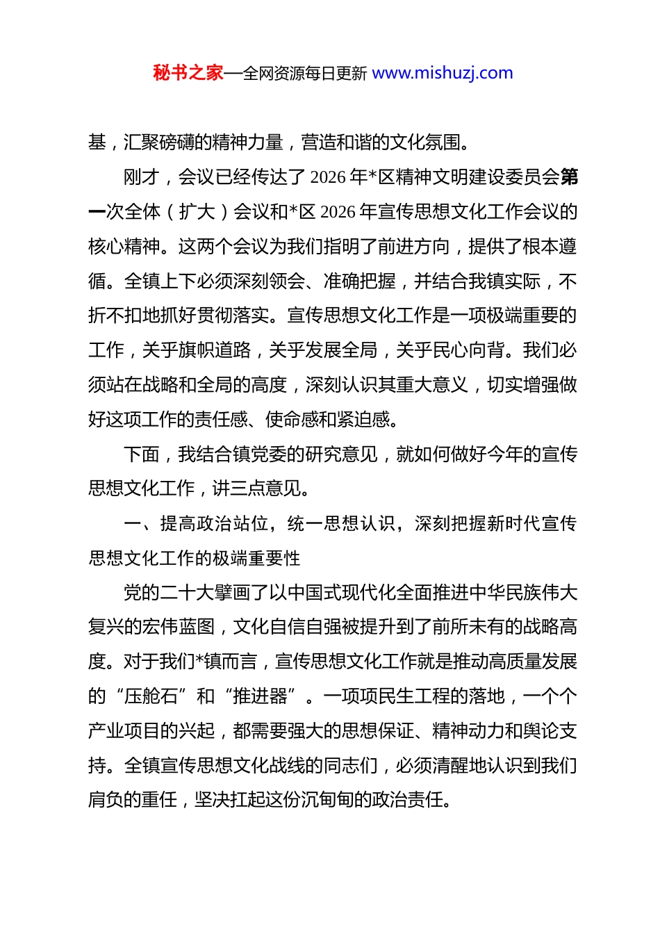 秘书之家—全网资源每日更新 www.mishuzj.com在全镇 2026 年宣传思想文化工作部署会上的讲话 同志们:大家好!今天,我们在这里隆重召开 2026 年度全镇宣传思想文化工作部署会,主要任务是深入学习贯彻上级会议精神,总结过去一年的成绩,表彰先进,分析当前形势,并对今年的重点工作进行全面部署和动员。首先,我代表镇党委,向今天受到表彰的优秀单位和优秀个人,表示热烈的祝贺!向过去一年辛勤工作在全镇宣传思想文化战线上的各位同志,表示衷心的感谢!同时,也对*村、*村、*村三位同志的精彩经验分享,表示肯定和感谢,他们的实践经验为我们接下来的工作提供了宝贵的借鉴。参加今天会议的有各村(社区)的宣传委员、志愿服务工作负责人,以及市民活动中心的工作人员。大家是全镇宣传思想文化工作的骨干力量和具体执行者,肩负着举旗帜、聚民心、育新人、兴文化、展形象的使命任务。召开这次会议,目的就是要进一步统一思想、凝聚共识,动员全镇上下以更加昂扬的姿态、更加有力的举措,为*镇的高质量发展筑牢坚实的思想根秘书之家—全网资源每日更新 www.mishuzj.com基,汇聚磅礴的精神力量,营造和谐的文化氛围。刚才,会议已经传达了 2026 年*区精神文明建设委员会第一次全体(扩大)会议和*区 2026 年宣传思想文化工作会议的核心精神。这两个会议为我们指明了前进方向,提供了根本遵循。全镇上下必须深刻领会、准确把握,并结合我镇实际,不折不扣地抓好贯彻落实。宣传思想文化工作是一项极端重要的工作,关乎旗帜道路,关乎发展全局,关乎民心向背。我们必须站在战略和全局的高度,深刻认识其重大意义,切实增强做好这项工作的责任感、使命感和紧迫感。下面,我结合镇党委的研究意见,就如何做好今年的宣传思想文化工作,讲三点意见。一、提高政治站位,统一思想认识,深刻把握新时代宣传思想文化工作的极端重要性党的二十大擘画了以中国式现代化全面推进中华民族伟大复兴的宏伟蓝图,文化自信自强被提升到了前所未有的战略高度。对于我们*镇而言,宣传思想文化工作就是推动高质量发展的“压舱石”和“推进器”。一项项民生工程的落地,一个个产业项目的兴起,都需要强大的思想保证、精神动力和舆论支持。全镇宣传思想文化战线的同志们,必须清醒地认识到我们肩负的重任,坚决扛起这份沉甸甸的政治责任。秘书之家—全网资源每日更新 www.mishuzj.com(一)要在深化认识中增强行动自觉。我们必须深刻认识到,抓宣传思想文化工作,就是抓发展、抓稳定、抓民心。一个地方的发展,不仅需要经济的硬实力,更需要文化的软实力和精神的凝聚力。良好的社会风气、积极向上的精神面貌,本身就是最优良的营商环境和最核心的竞争力。我们必须把这项工作摆在更加突出的位置,牢牢掌握工作的主动权和领导权,确保党的旗帜在宣传思想文化阵地上高高飘扬。(二)要在锤炼“四力”中提升履职能力。习近平总书记对宣传思想文化战线的同志们提出了增强“脚力、眼力、脑力、笔力”的重要要求。这“四力”是我们做好工作的基础和关键。所谓“脚力”,就是要勤于深入基层、深入群众,用双脚丈量民情,从田间地头、街头巷尾中汲取最鲜活的素材和最深厚的力量。“眼力”,就是要善于观察发现,透过现象看本质,于平凡中发现感动,于细微处洞察趋势,挖掘出那些能够代表*镇精神风貌的闪光点。“脑力”,就是要勤于学习思考,善于分析研判,围绕中心、服务大局,科学谋划工作思路,精准设置工作议题。“笔力”,就是要善于表达呈现,能够用群众喜闻乐见的语言和方式,把党的理论讲透彻,把*的故事讲精彩,把发展的蓝图讲明白,让我们的宣传工作入脑入心、落地生根。(三)要在服务大局中彰显担当作为。全镇的宣传思想文秘书之家—全网资源每日更新 www.mishuzj.com化工作,必须紧紧围绕“高质量发展”这个中心任务来展开。无论是理论宣传、风气建设,还是文化惠民、文明实践,最终的目标都是为了把全镇上下的正能量充分聚合起来,把崇德向善的好风气牢固树立起来,把干事创业的精气神彻底提振起来。我们要通过实实在在的工作成效,为全镇的经济社会发展清障搭台、加油鼓劲,真正做到“...